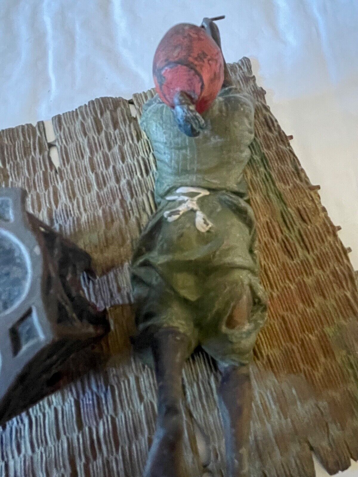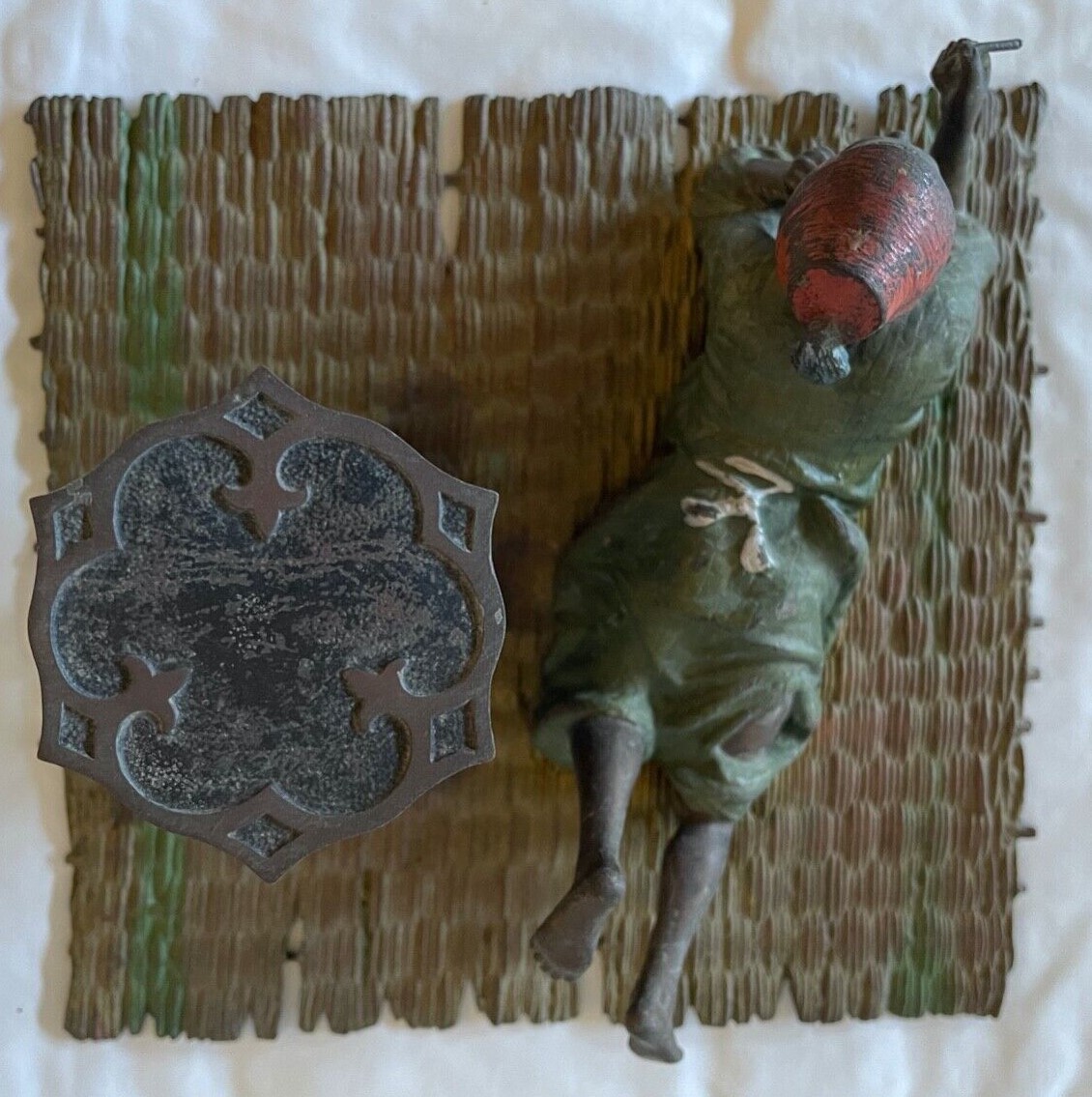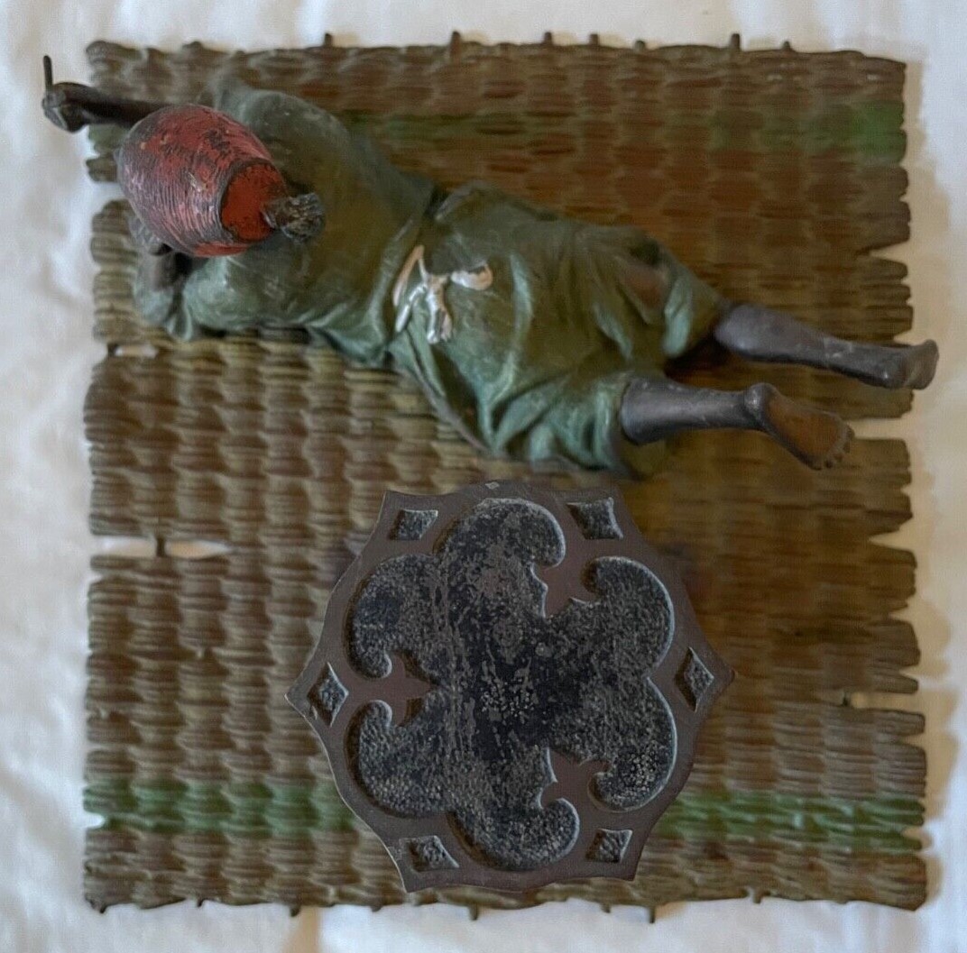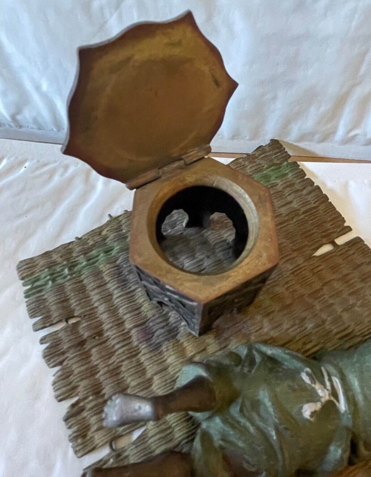 An Arab boy, lying prone on a wattled carpet, wears a fez and traditional Arab garments. He smokes a cigarette, his legs slightly raised in a relaxed manner. Next to him is a small table which holds the inkwell (missing insert). Cold painted white metal. Marked “Austria”.