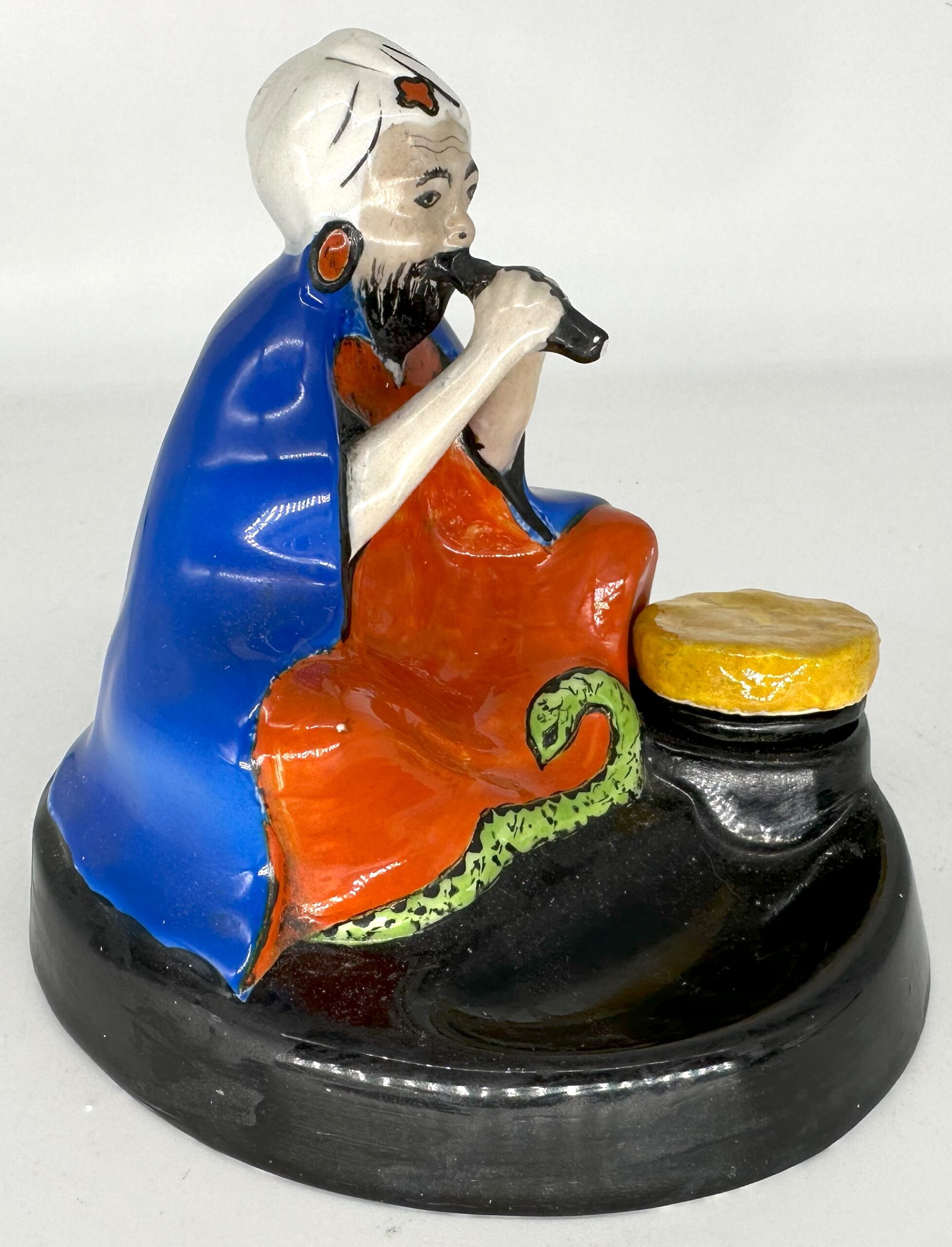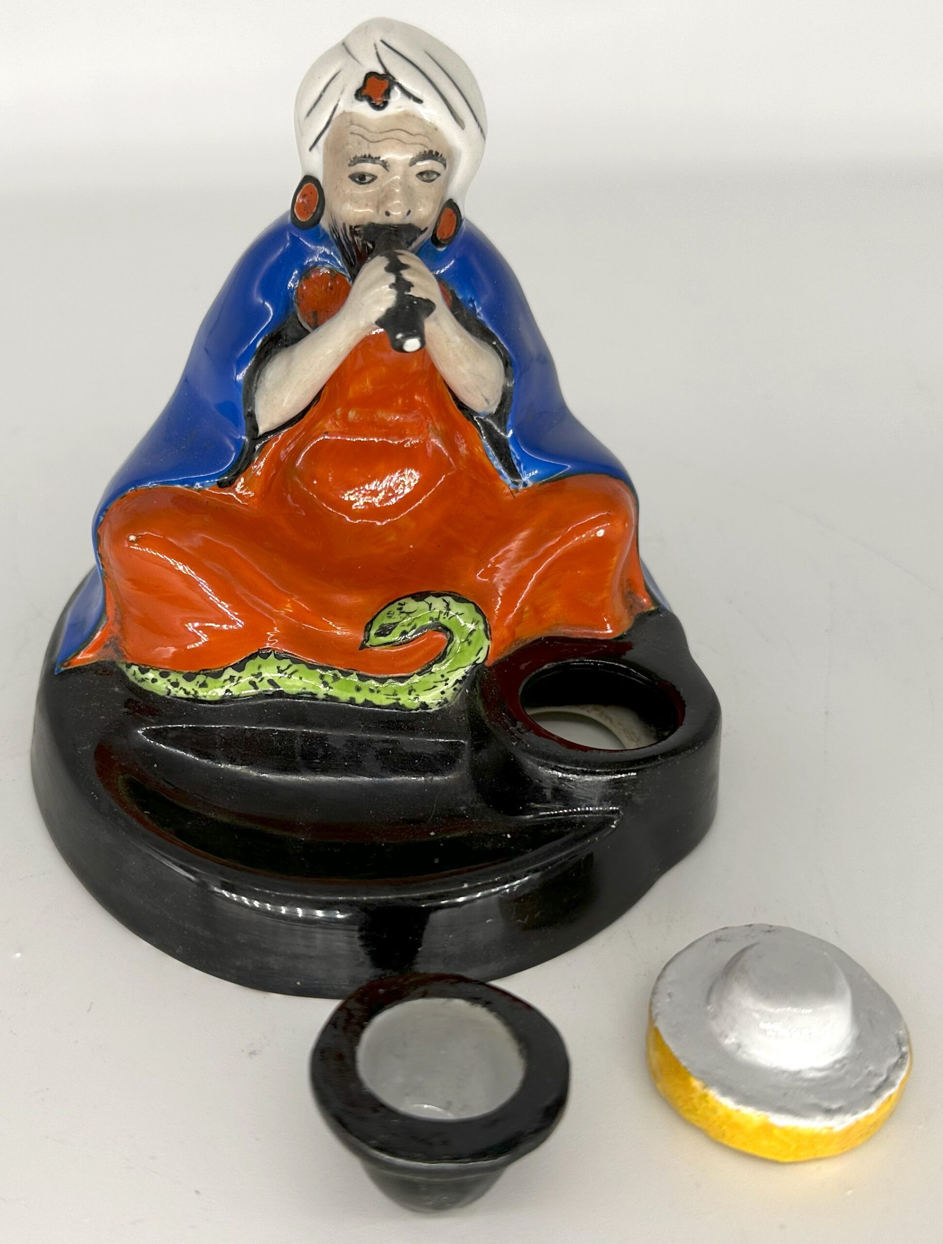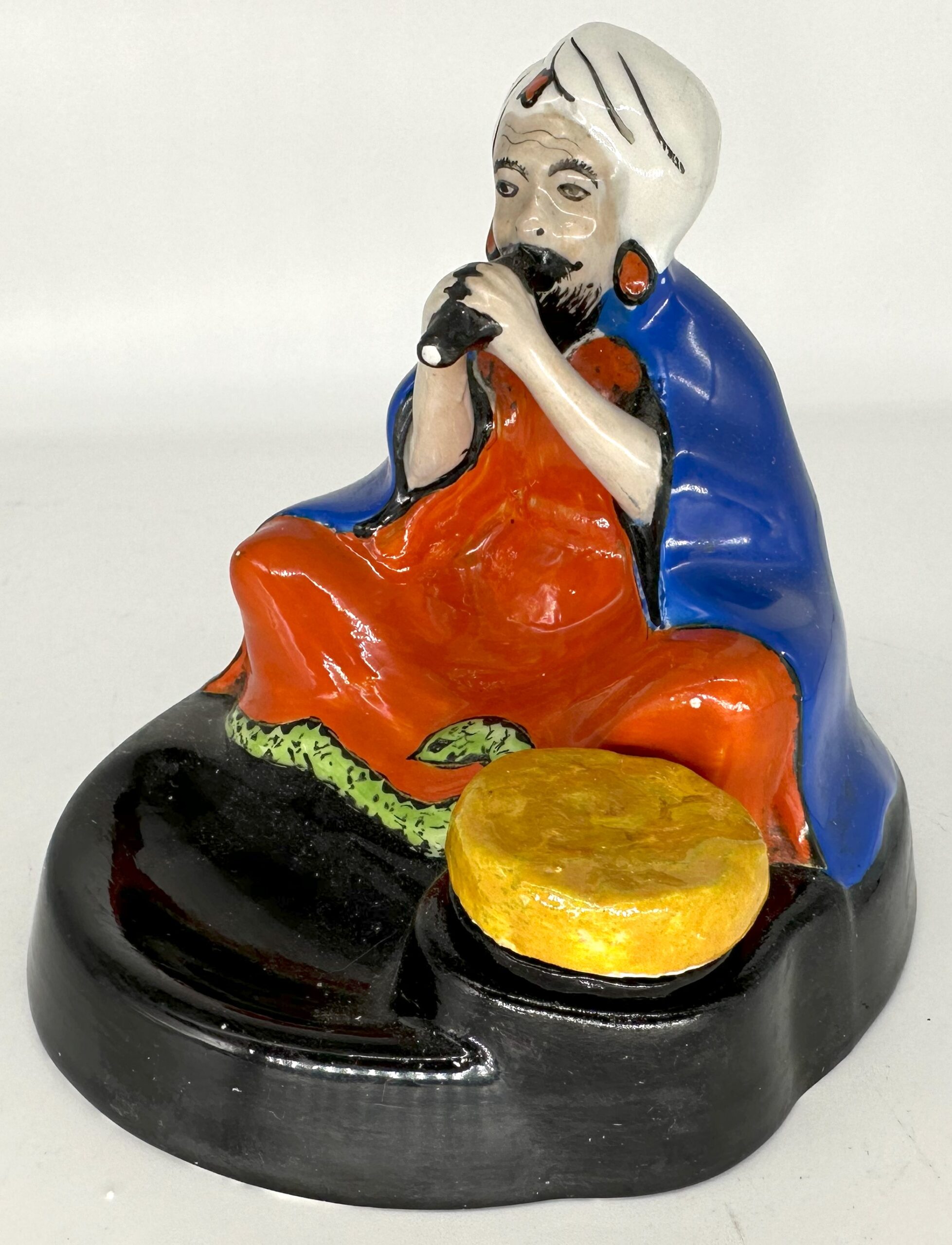Ceramic figure of a snake charmer sitting on a black base. Hand painted in nice detail; he holds a pungi (flute). A snake is coiled around his feet. The underside is marked: “Solian Ware, SOHO Pottery; Cobridge, England”.