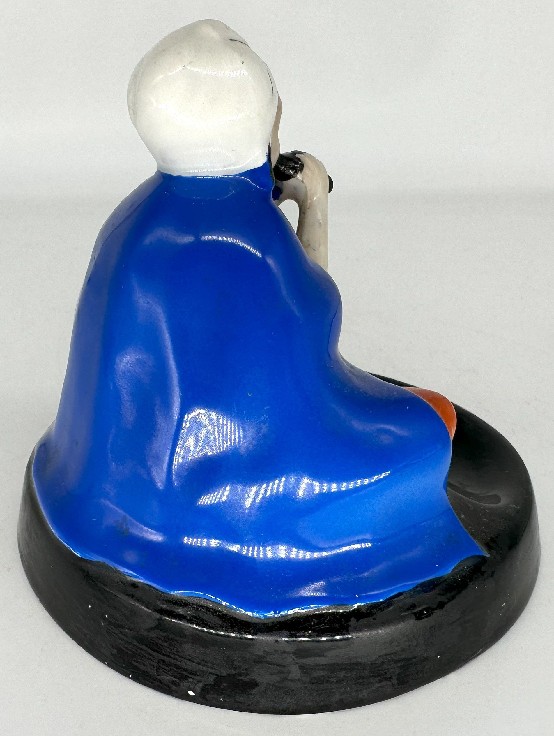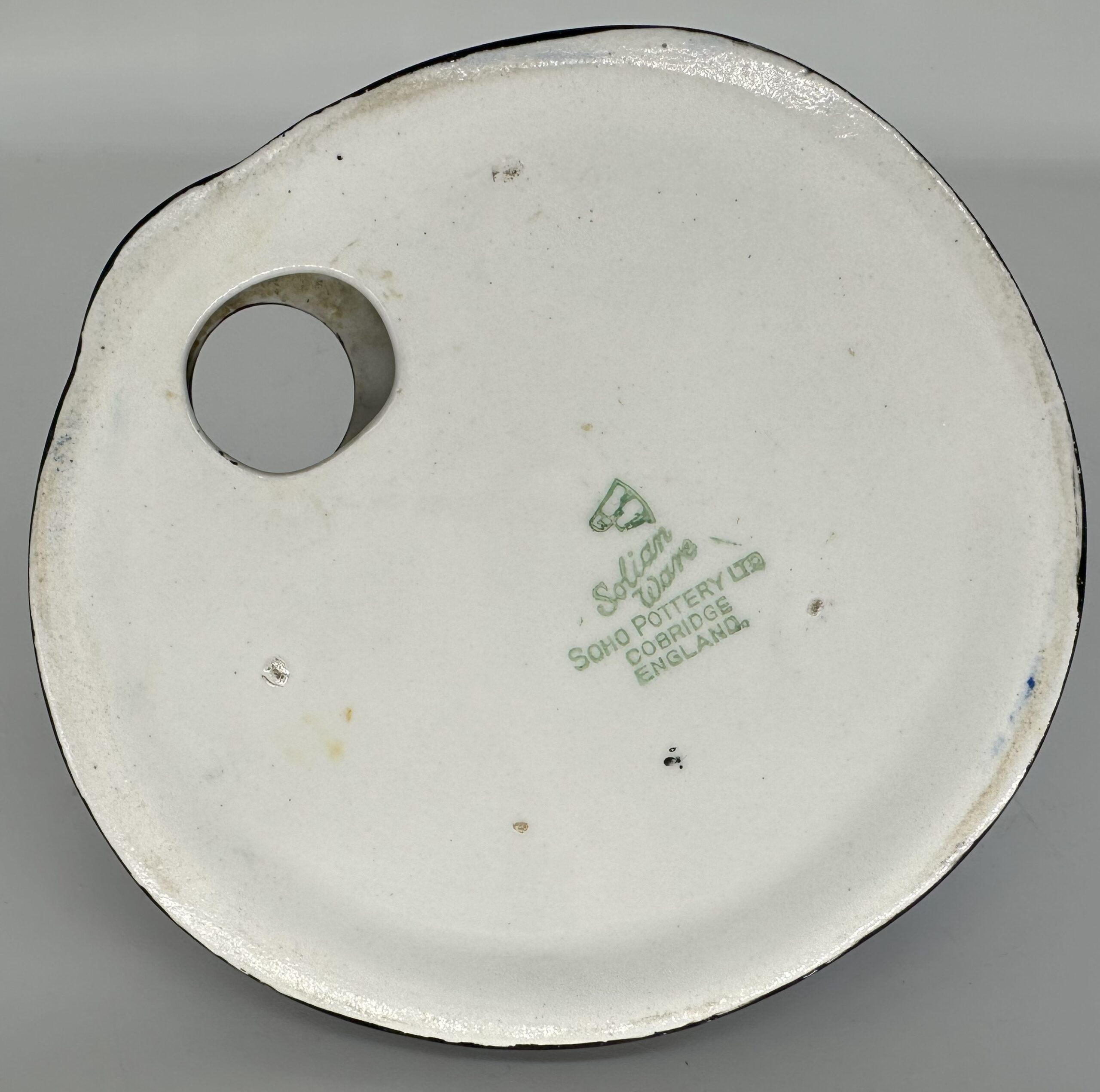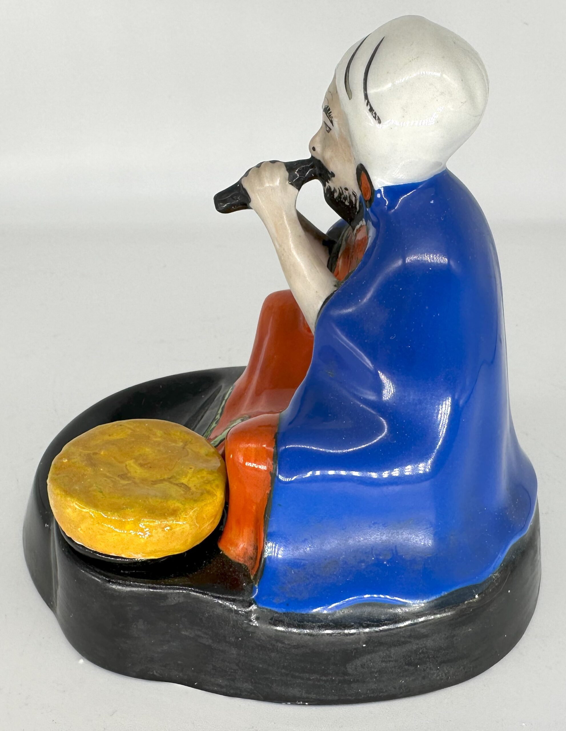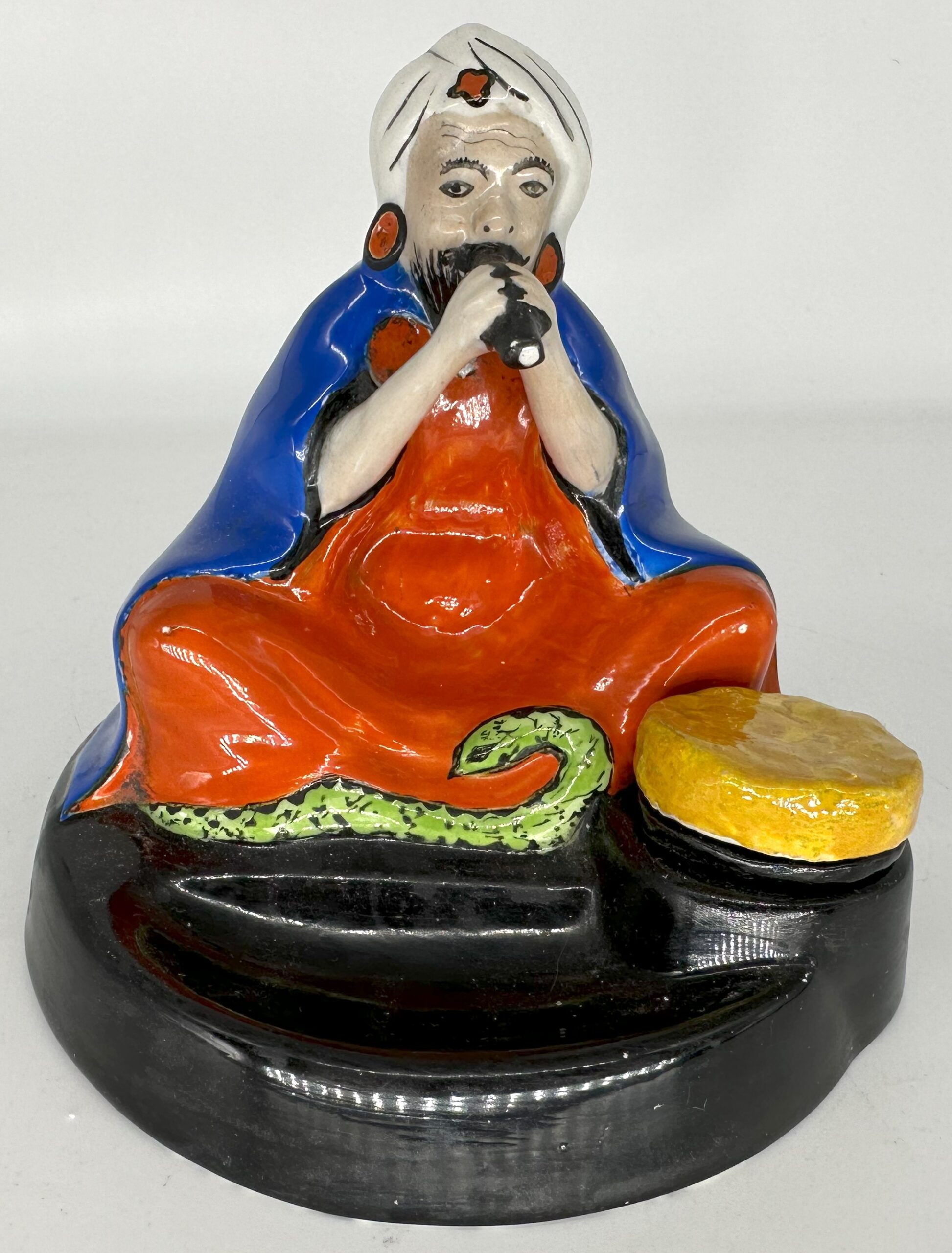 Ceramic figure of a snake charmer sitting on a black base. Hand painted in nice detail; he holds a pungi (flute). A snake is coiled around his feet. The underside is marked: “Solian Ware, SOHO Pottery; Cobridge, England”.