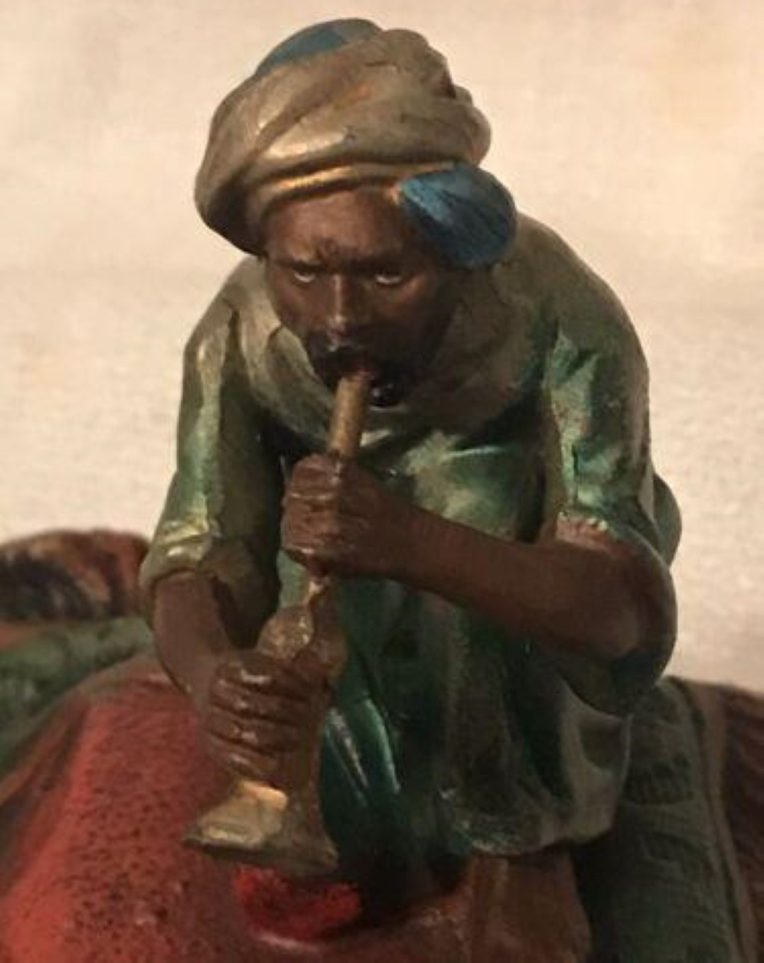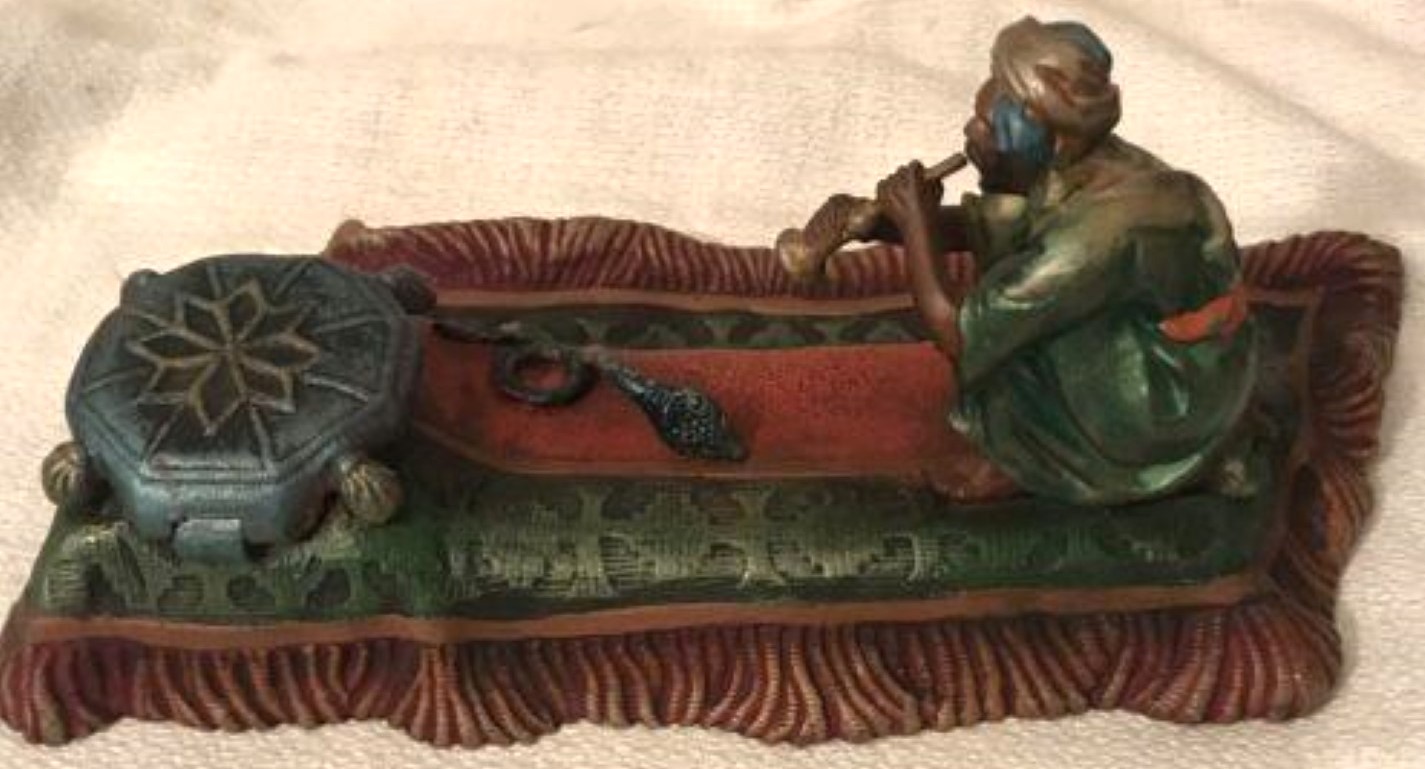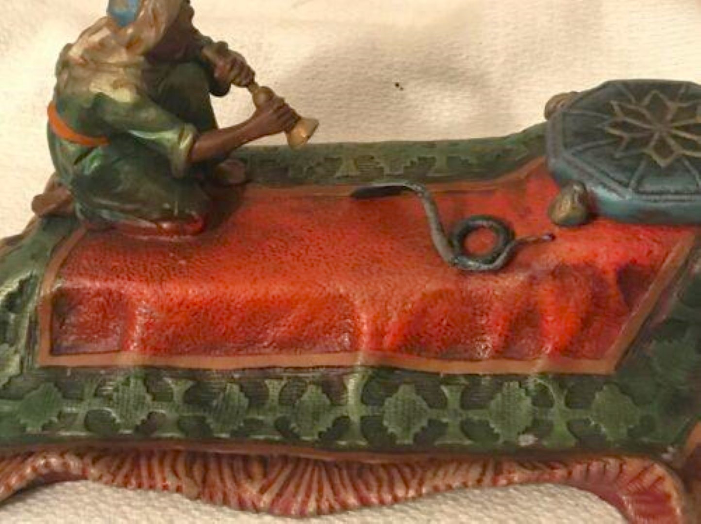 An Arab man is playing a Pungi intending to hypnotize a cobra. Next to him is a tasseled pillow with a hinged cover that opens to expose the inkwell. Made of cold-painted white metal, the piece is stamped on the underside: “Made in Austria.”