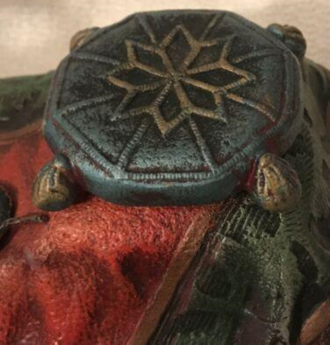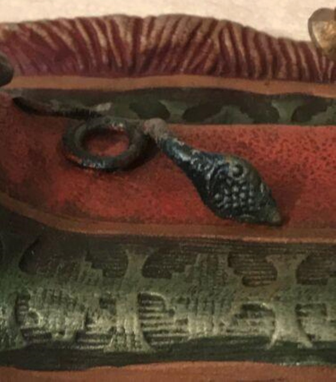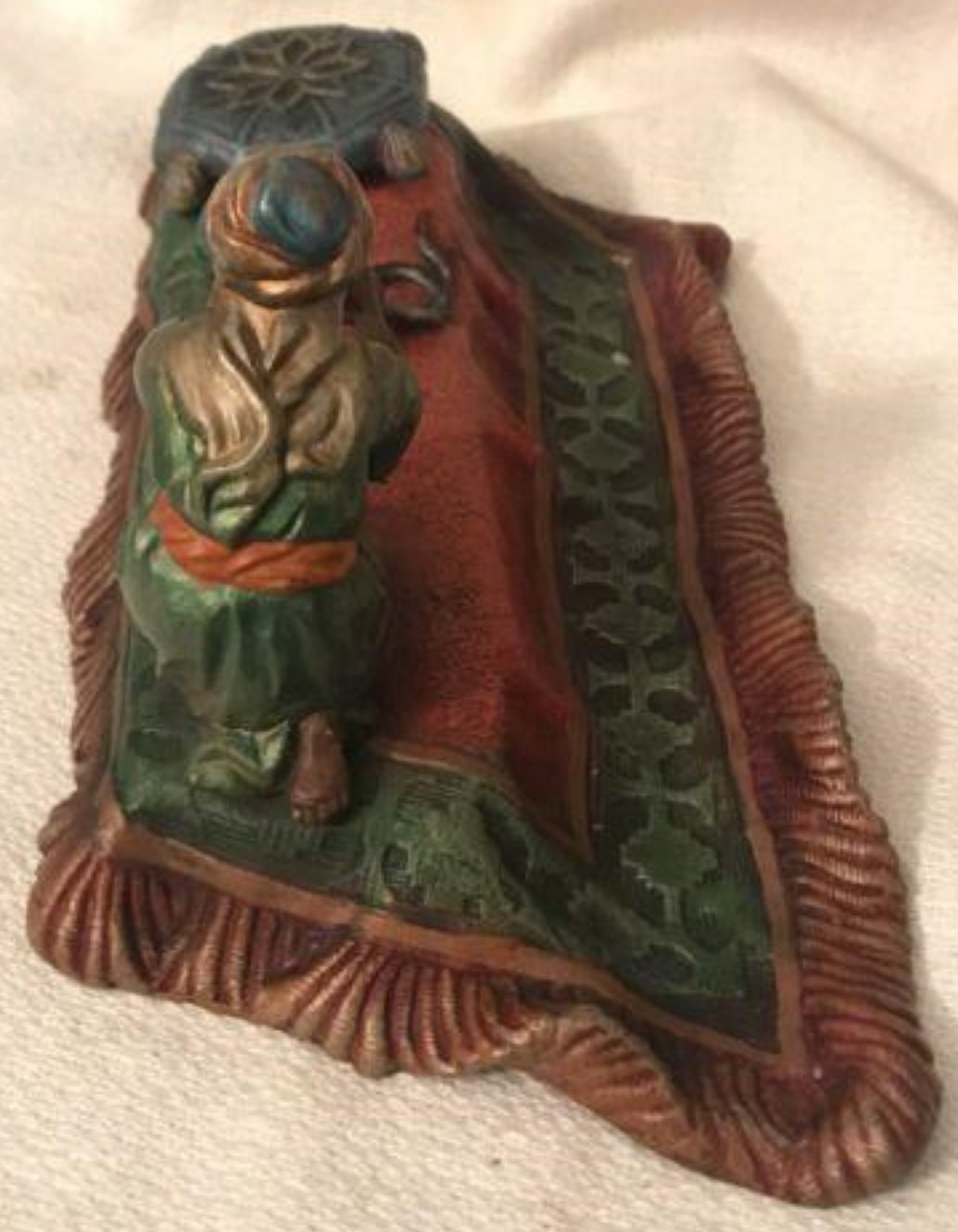 An Arab man is playing a Pungi intending to hypnotize a cobra. Next to him is a tasseled pillow with a hinged cover that opens to expose the inkwell. Made of cold-painted white metal, the piece is stamped on the underside: “Made in Austria.”