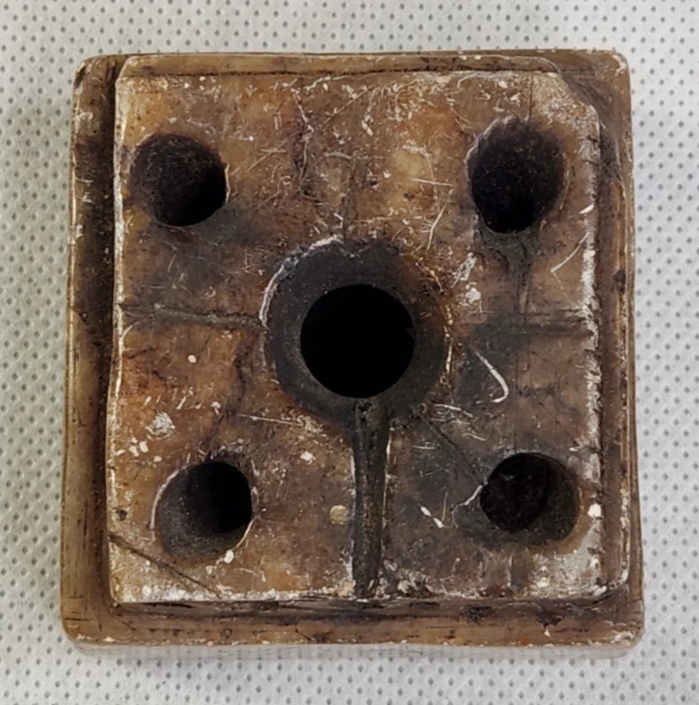 - Four small, round quill holes angled in at each corner of the well. These holes were used to store the writing quills when not in use.