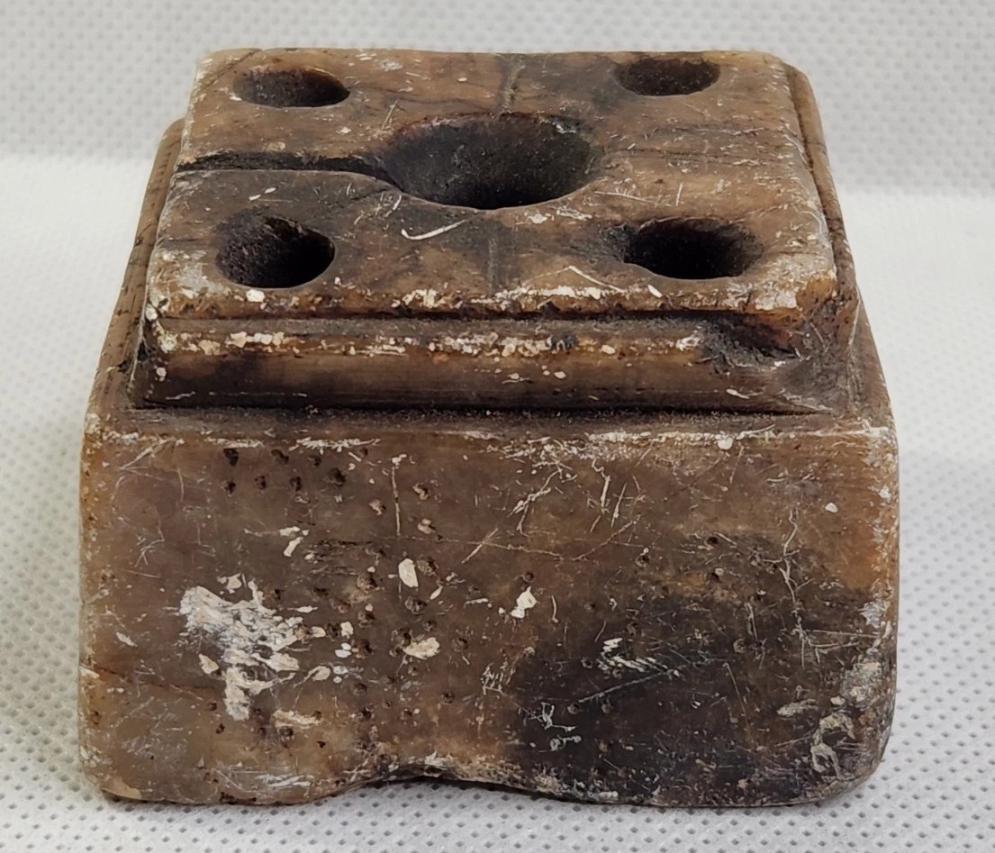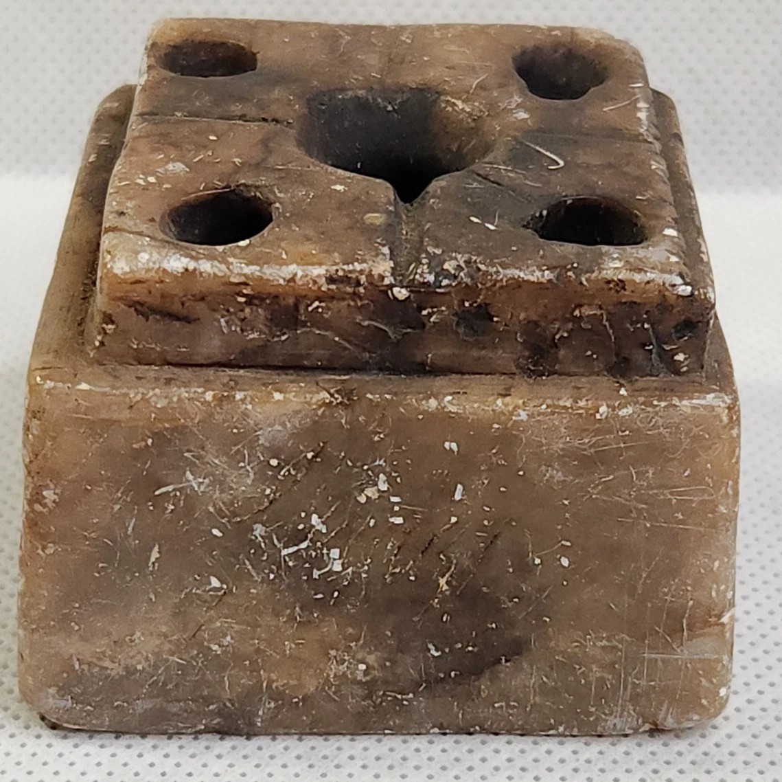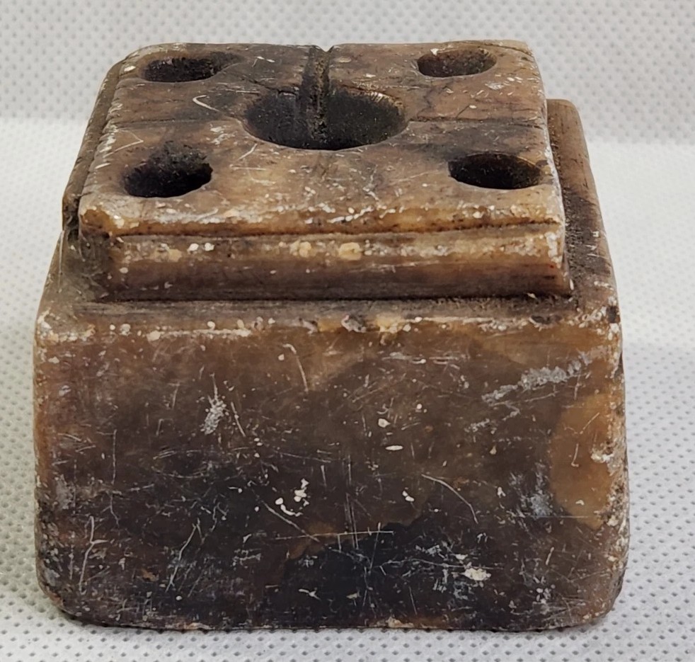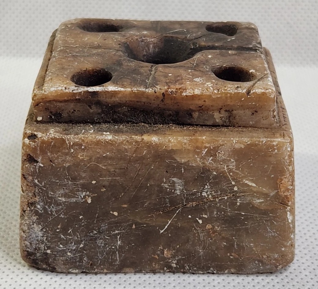 Soapstone, a soft metamorphic rock, has been used for centuries by various cultures for its ease of carving and heat-retention properties. In the context of inkwells, soapstone was an excellent choice for several reasons: