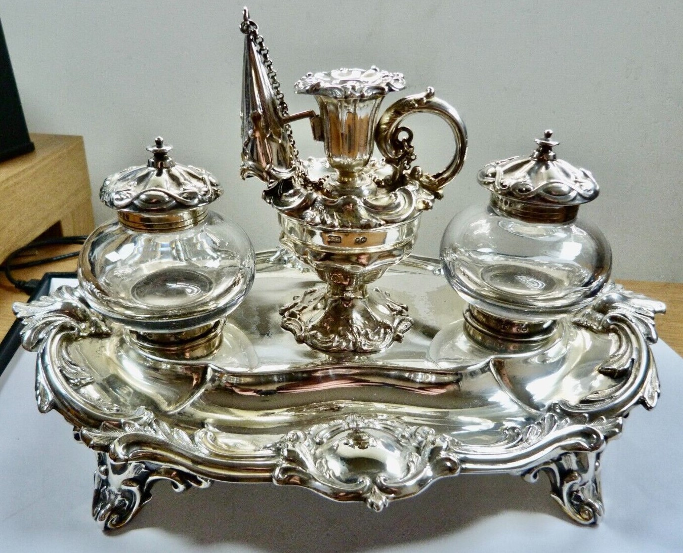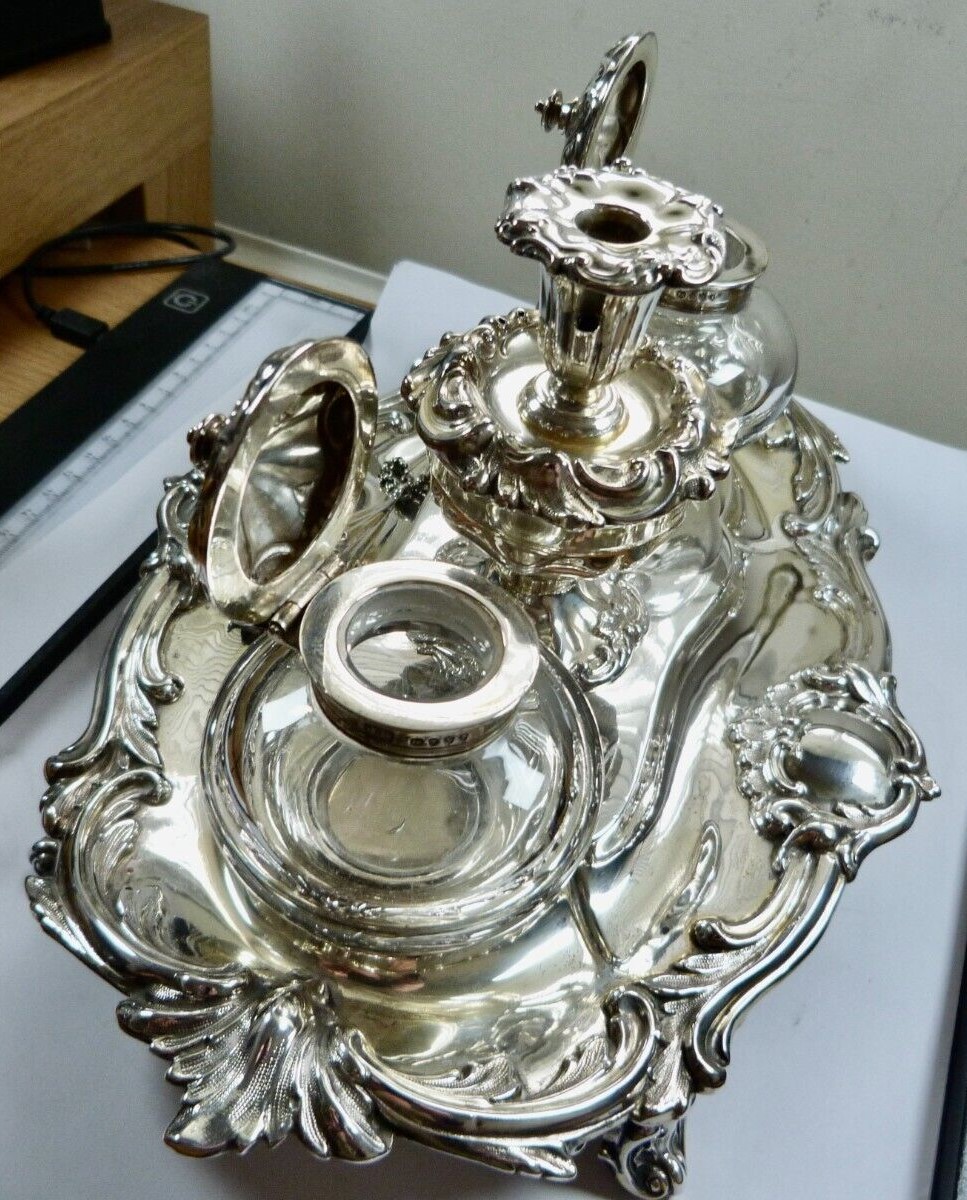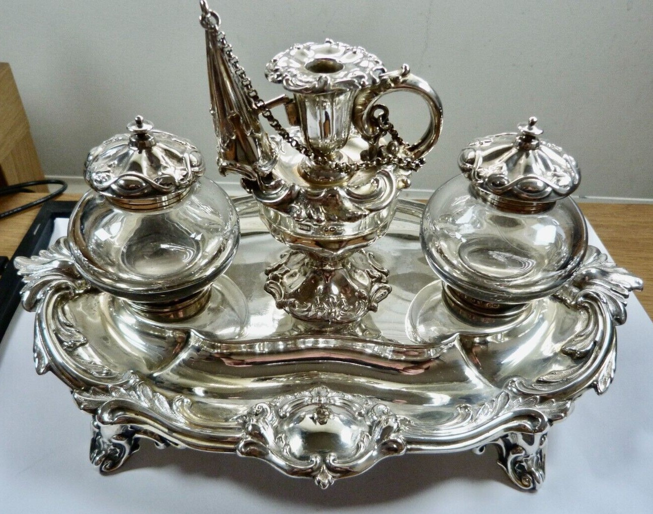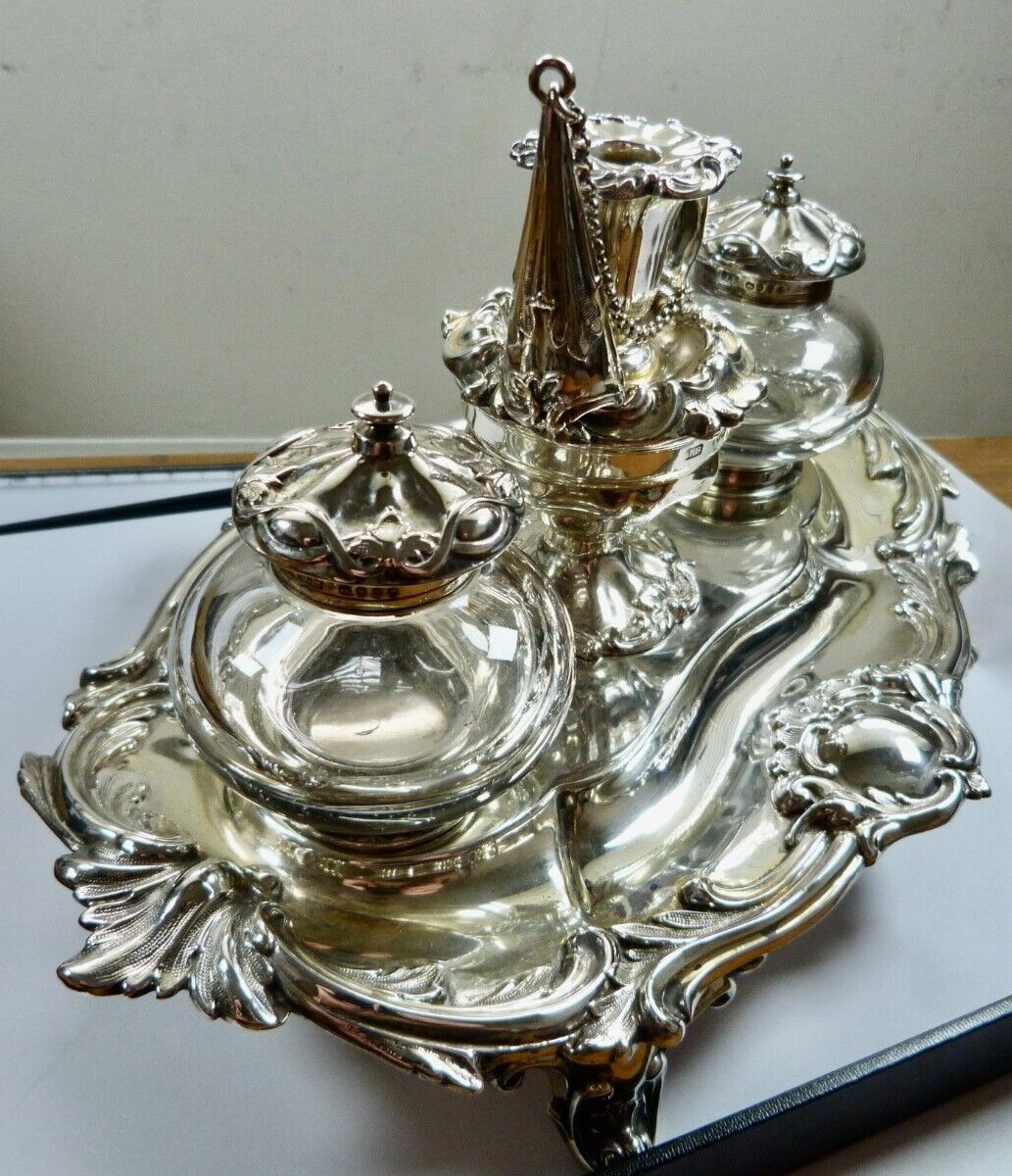 Victorian silver standish raised on four scrolled feet, cast foliate scroll decoration, vacant cartouche, two silver topped glass inkwells, the central receptacle with removable chamberstick and chained snuffer – all fully hallmarked for London 1888 by Henry Wilkinson & Co (John Brashier) of Norfolk Street, Sheffield.