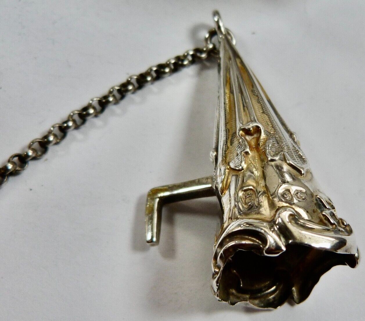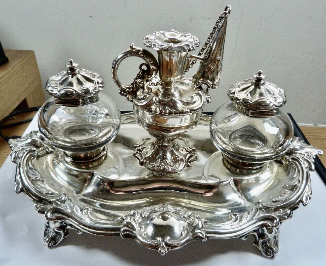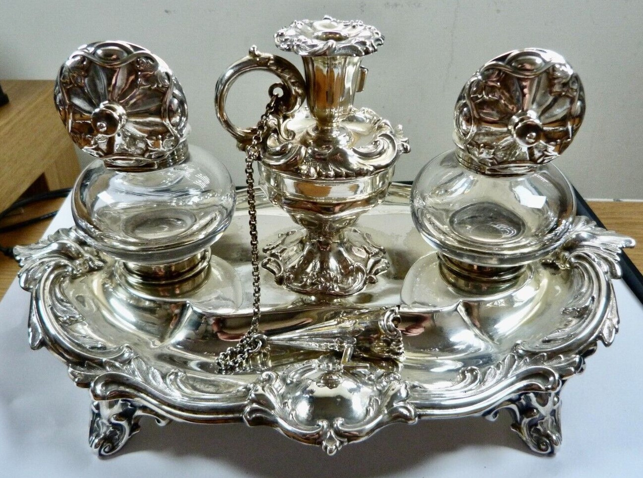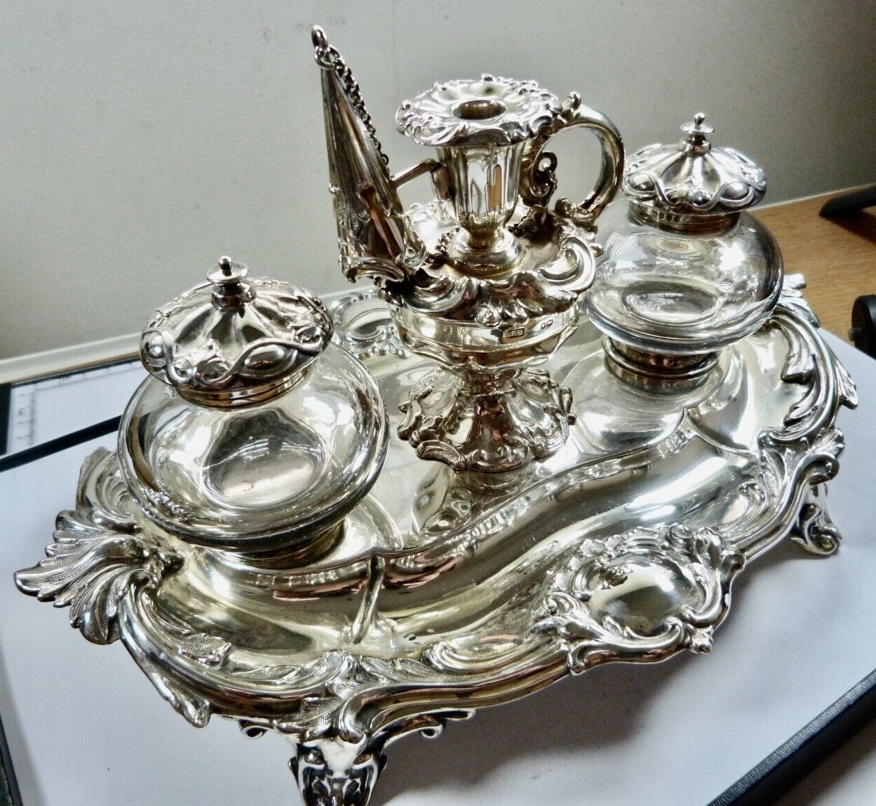 Victorian silver standish raised on four scrolled feet, cast foliate scroll decoration, vacant cartouche, two silver topped glass inkwells, the central receptacle with removable chamberstick and chained snuffer – all fully hallmarked for London 1888 by Henry Wilkinson & Co (John Brashier) of Norfolk Street, Sheffield.