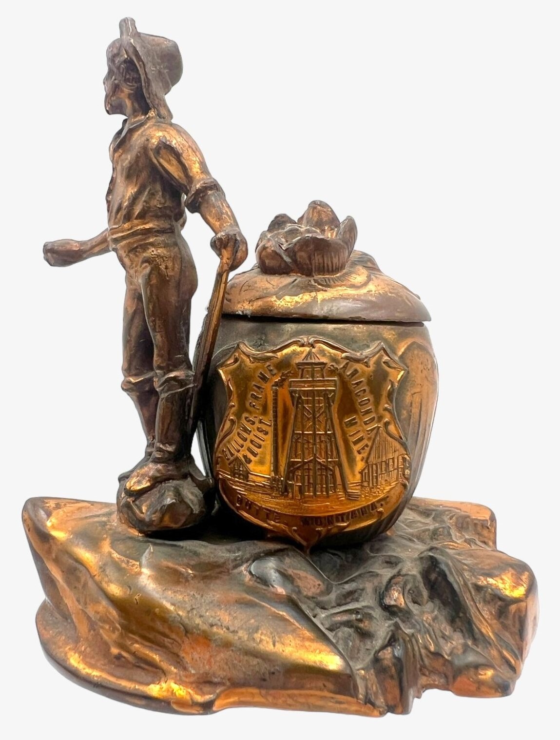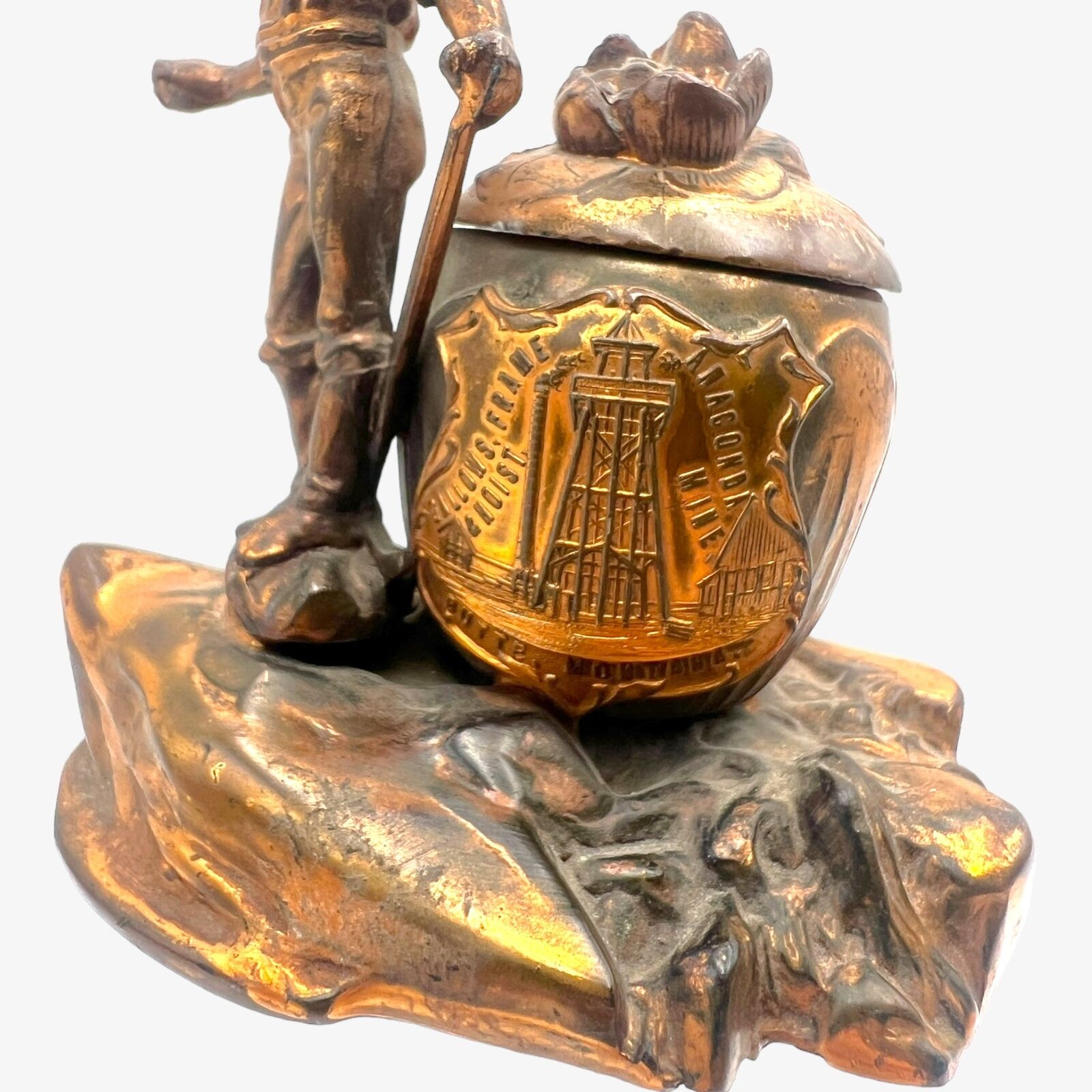 A miner, shovel in hand, stands next to an inkwell (no insert). A plaque on the inkwell reads: Gallows, Frame & Hoist – Anaconda Mine – Butte Montana.