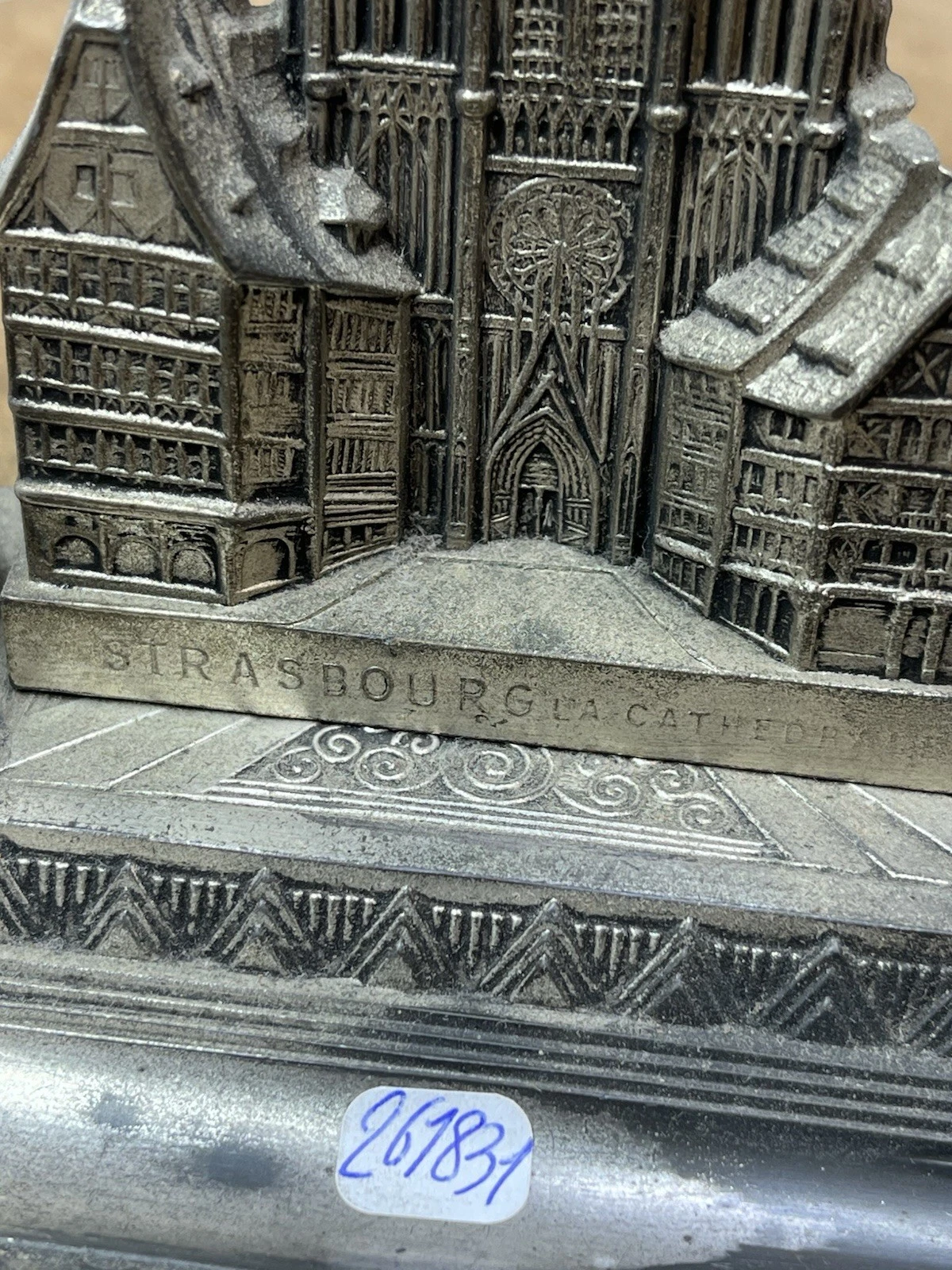 - Inscriptions: The base of the cathedral model is clearly embossed with the words “STRASBOURG LA CATHÉDRALE.” The underside shows a hollow-cast construction with a central bolt and the number “5352,” likely a factory model or catalog number.