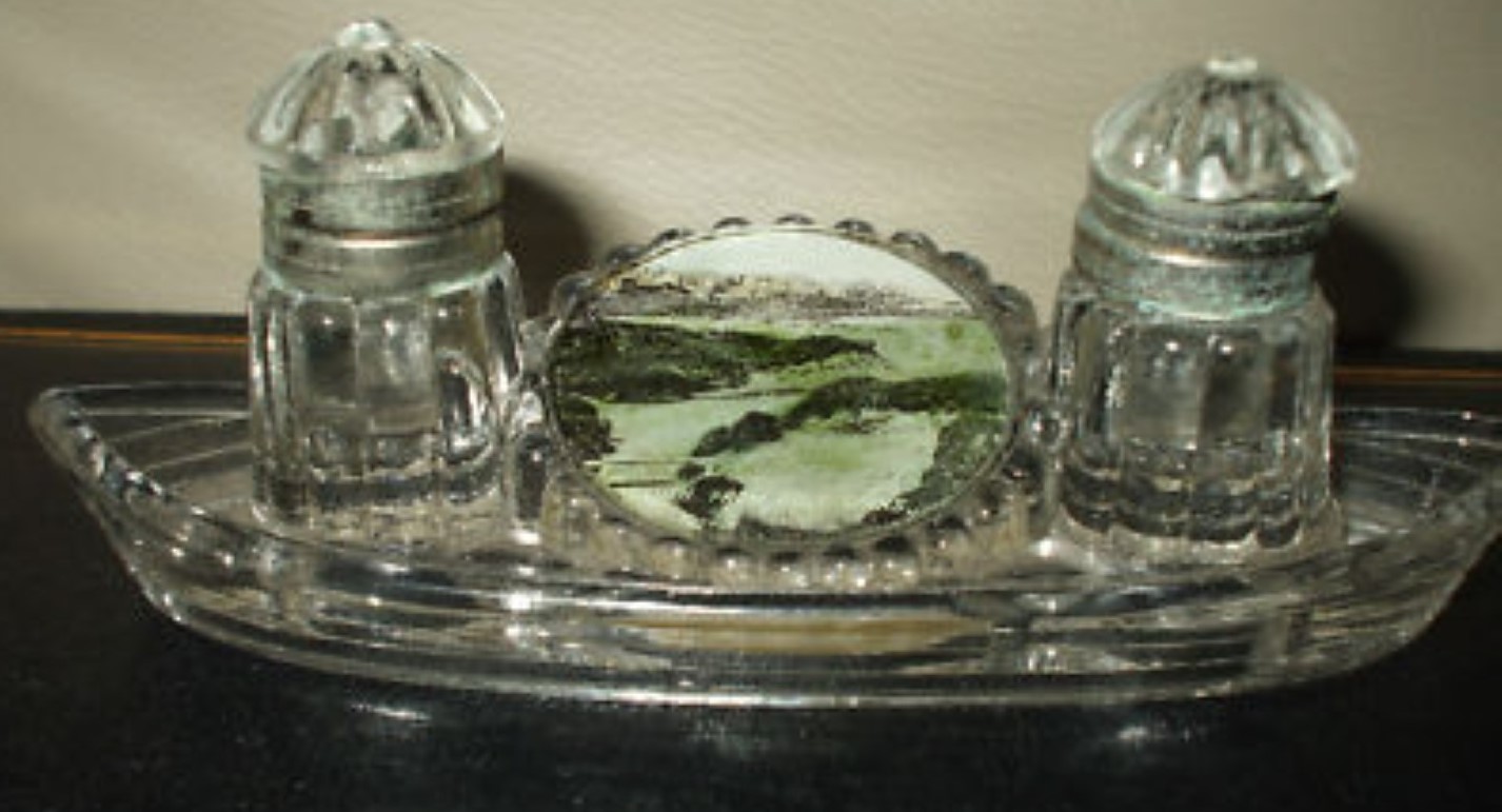 #2 Glass double inkstand with a picture inset of the Portrush Golf Course in Northern Ireland (founded in 1888). 5 ½” x 1 ½” x 2 ¼” high. Estimated value: $25