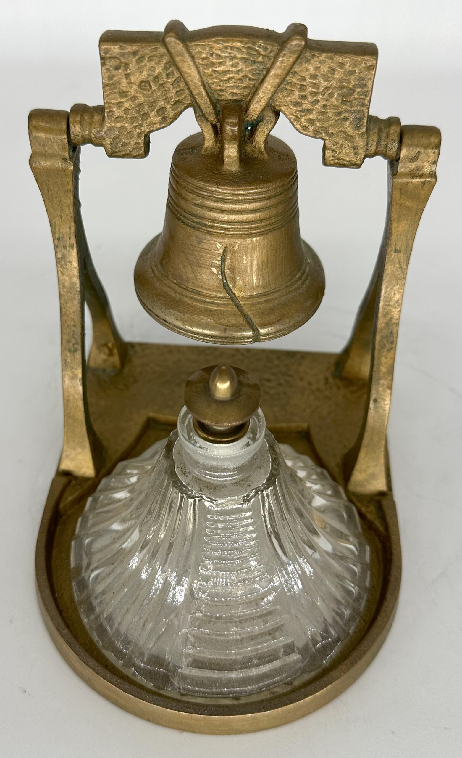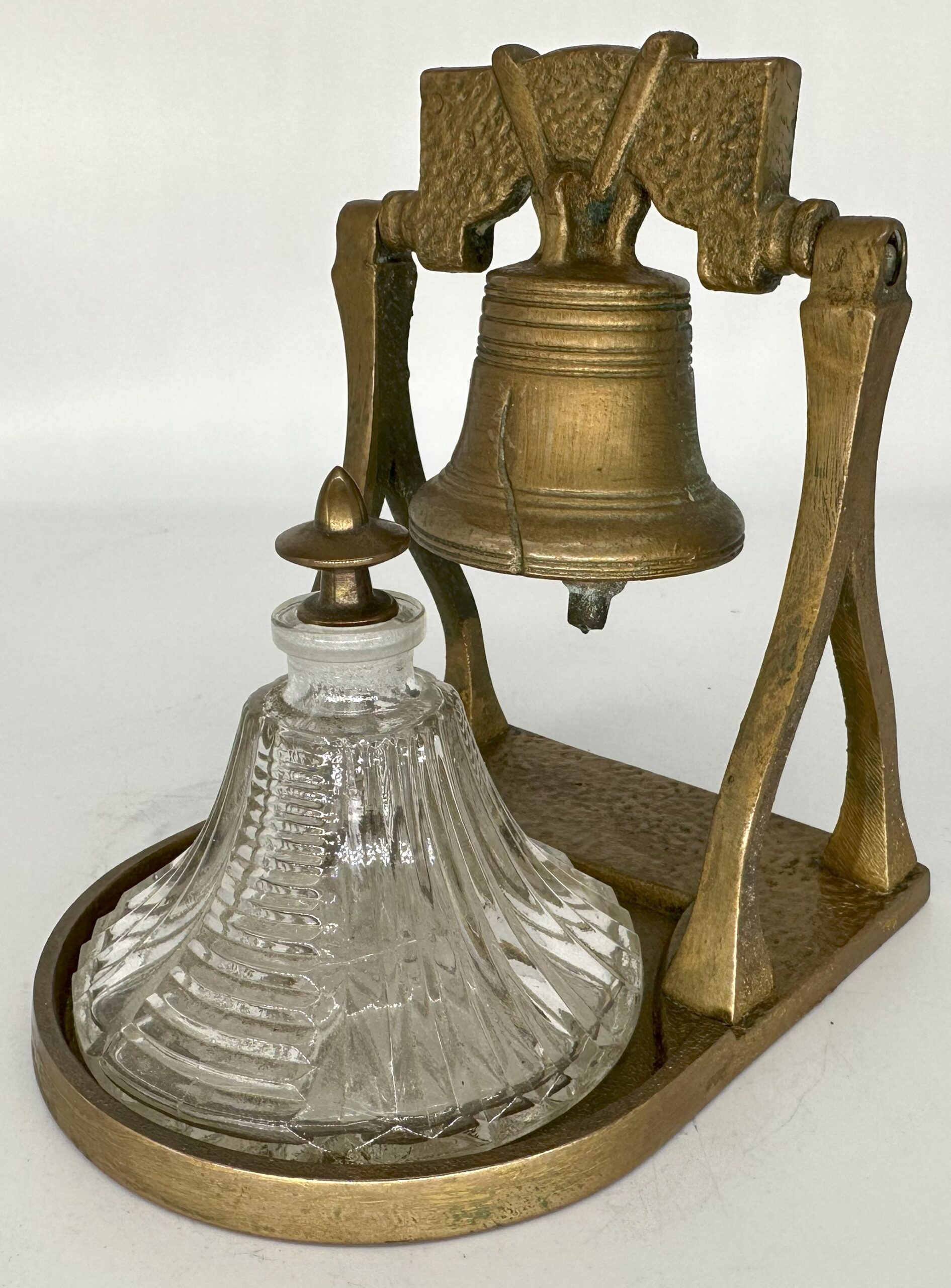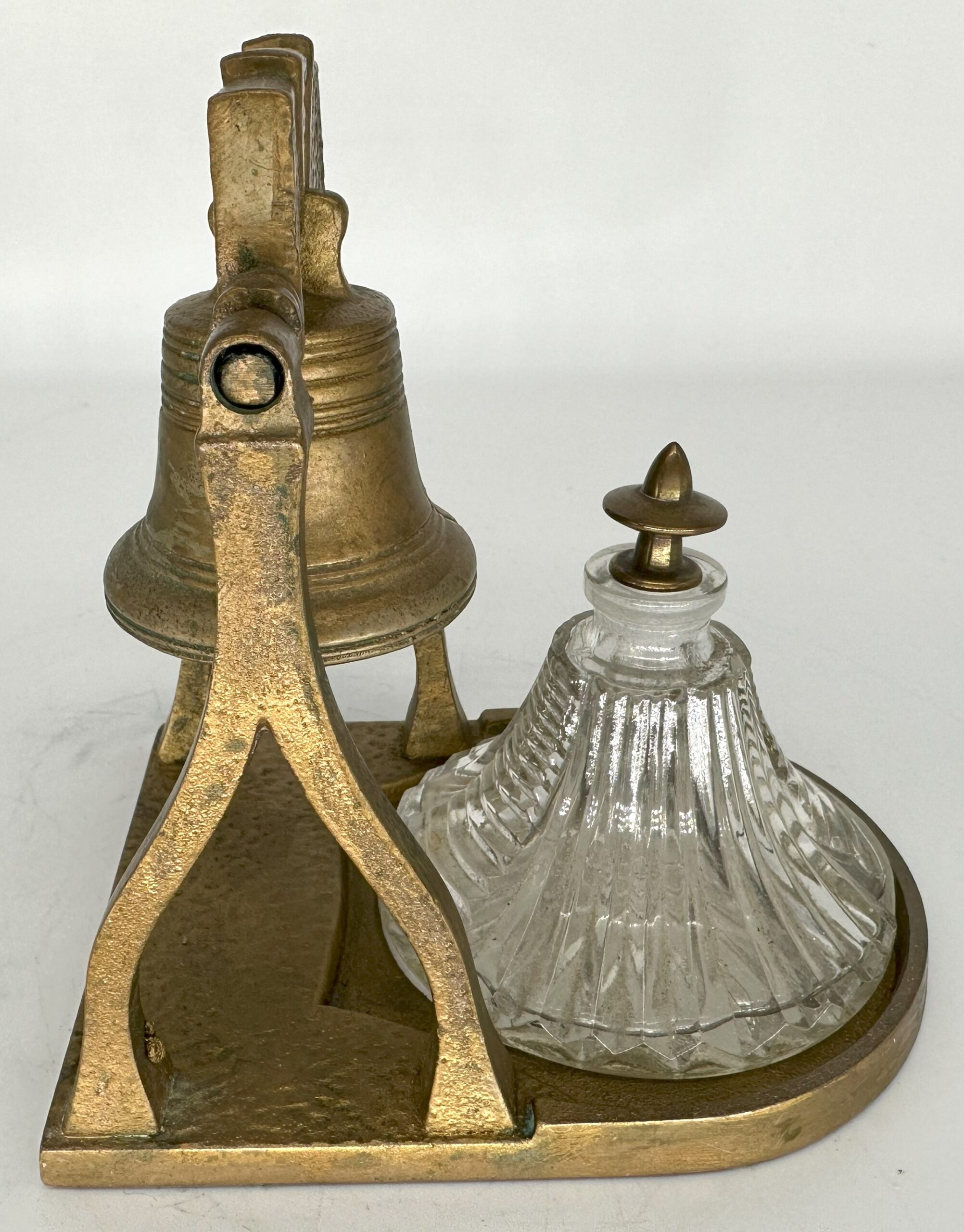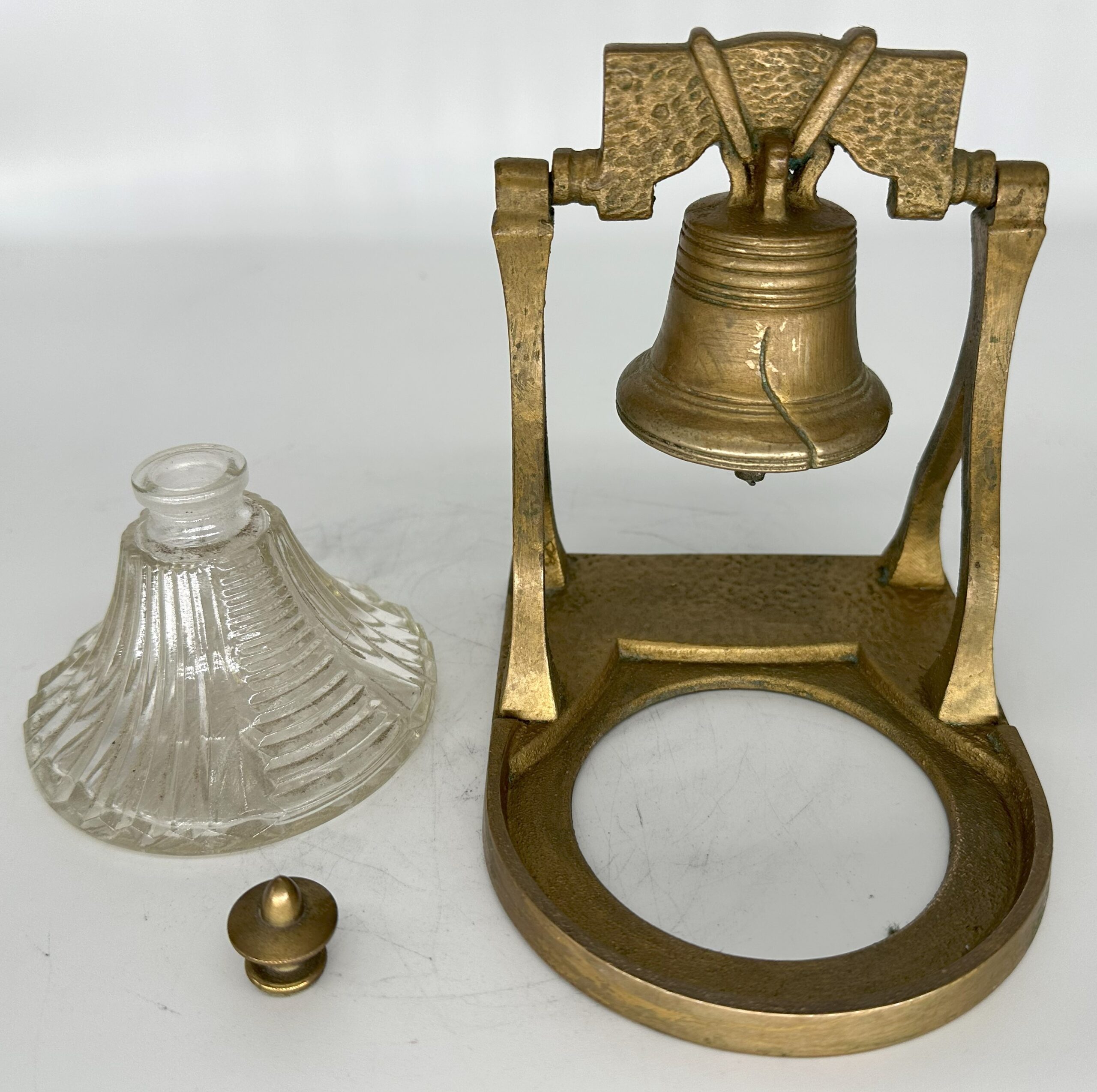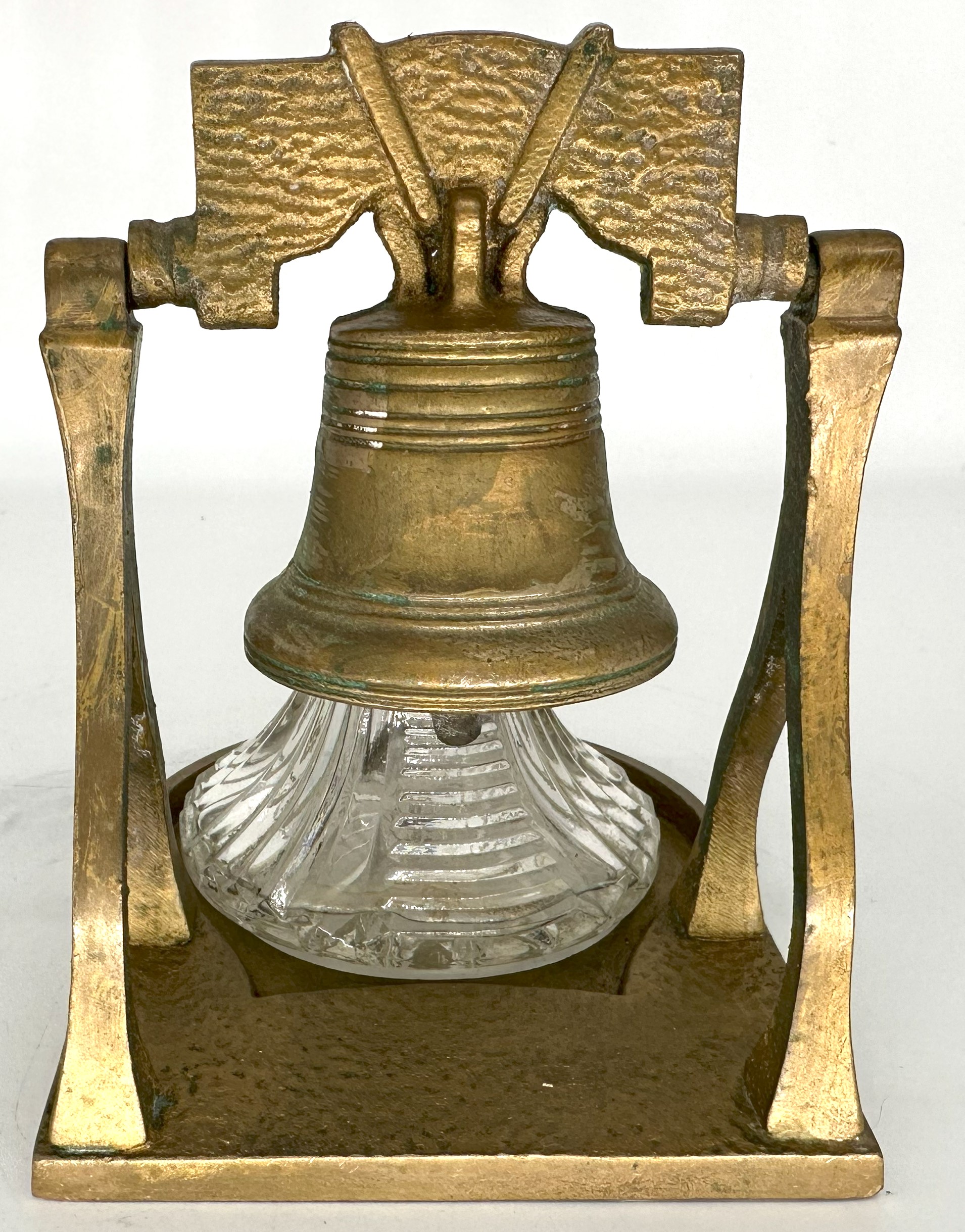A bell-shaped glass inkwell with lid rests on a brass base holding a replica of the Liberty Bell. The yoke swivels, the clapper hits the sound bow, and freedom rings!