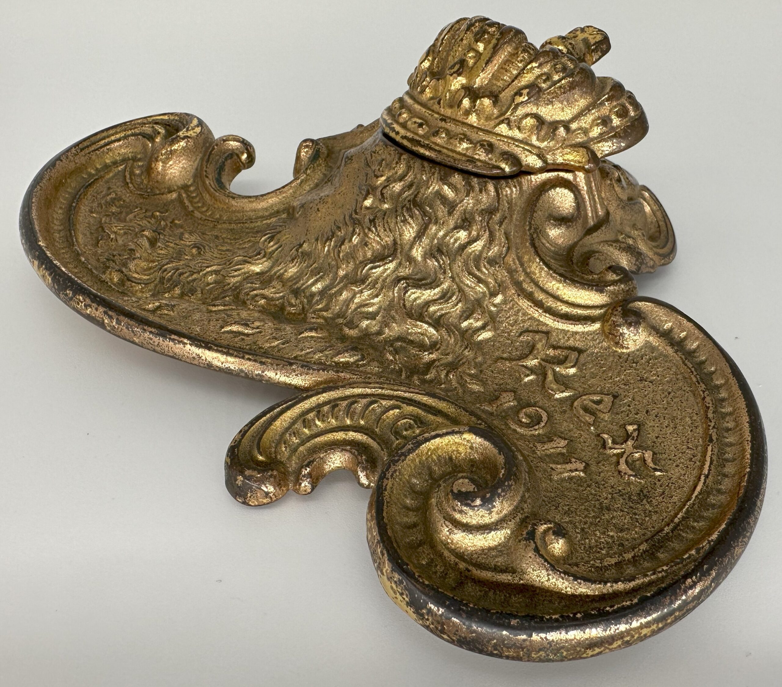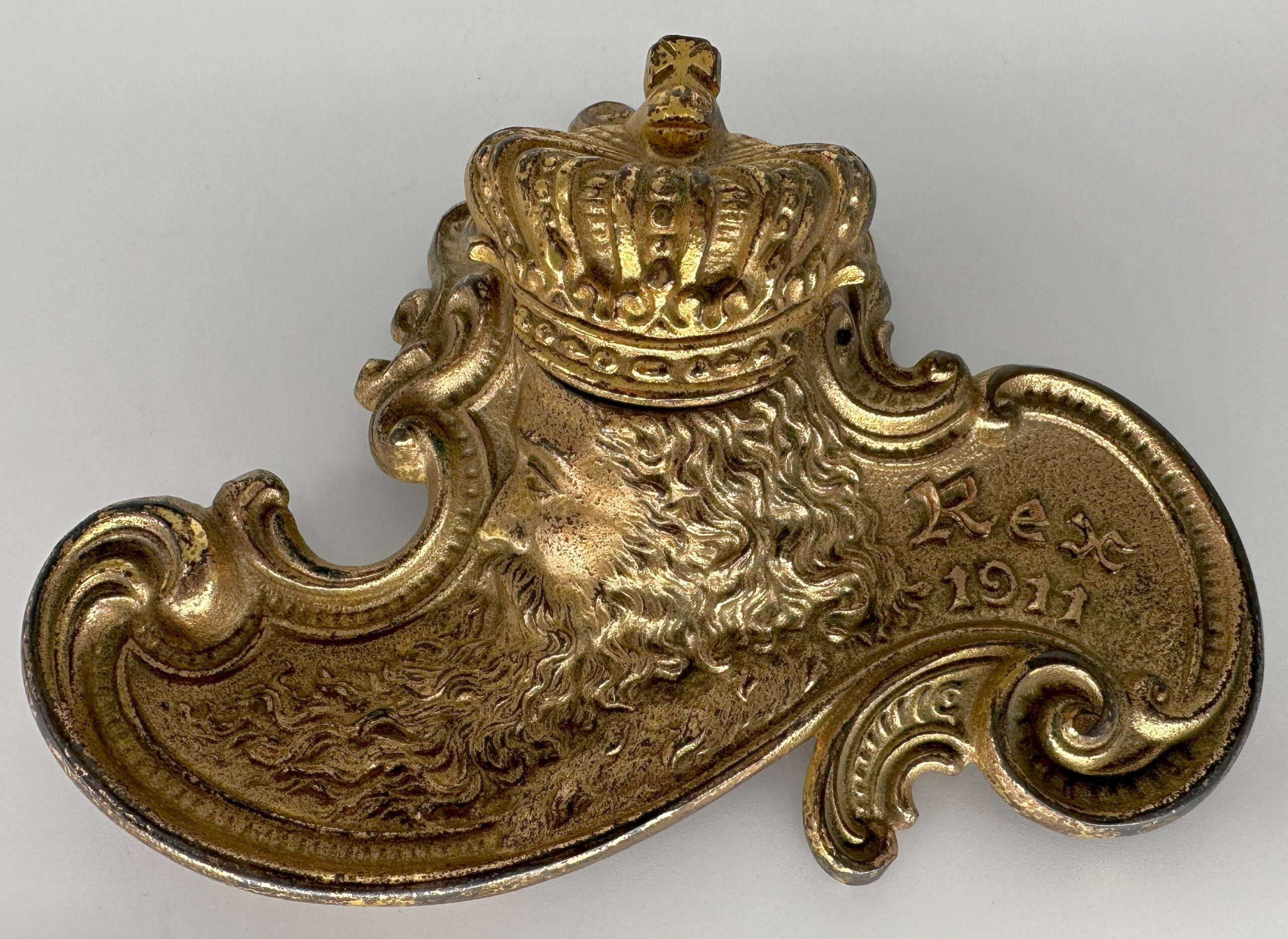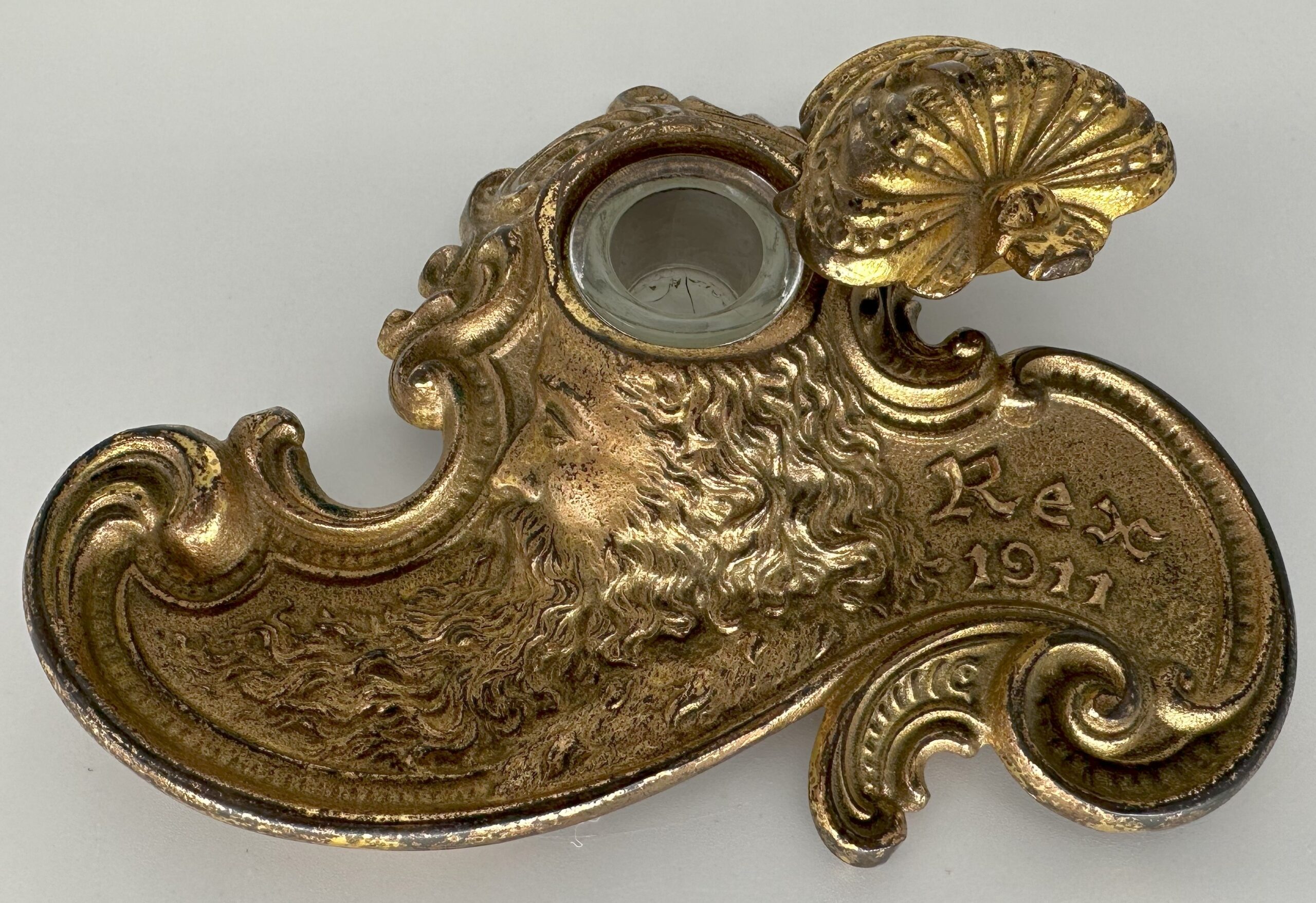 The inkstand depicts the head of “Rex” in high relief with his long flowing locks and beard. His crown swivels open to access the inkwell. The date 1911 is embossed on the right side. Designed in the Art Nouveau style, the inkstand features sinuous, flowing lines in the design. The piece is made of brass plated cast iron.