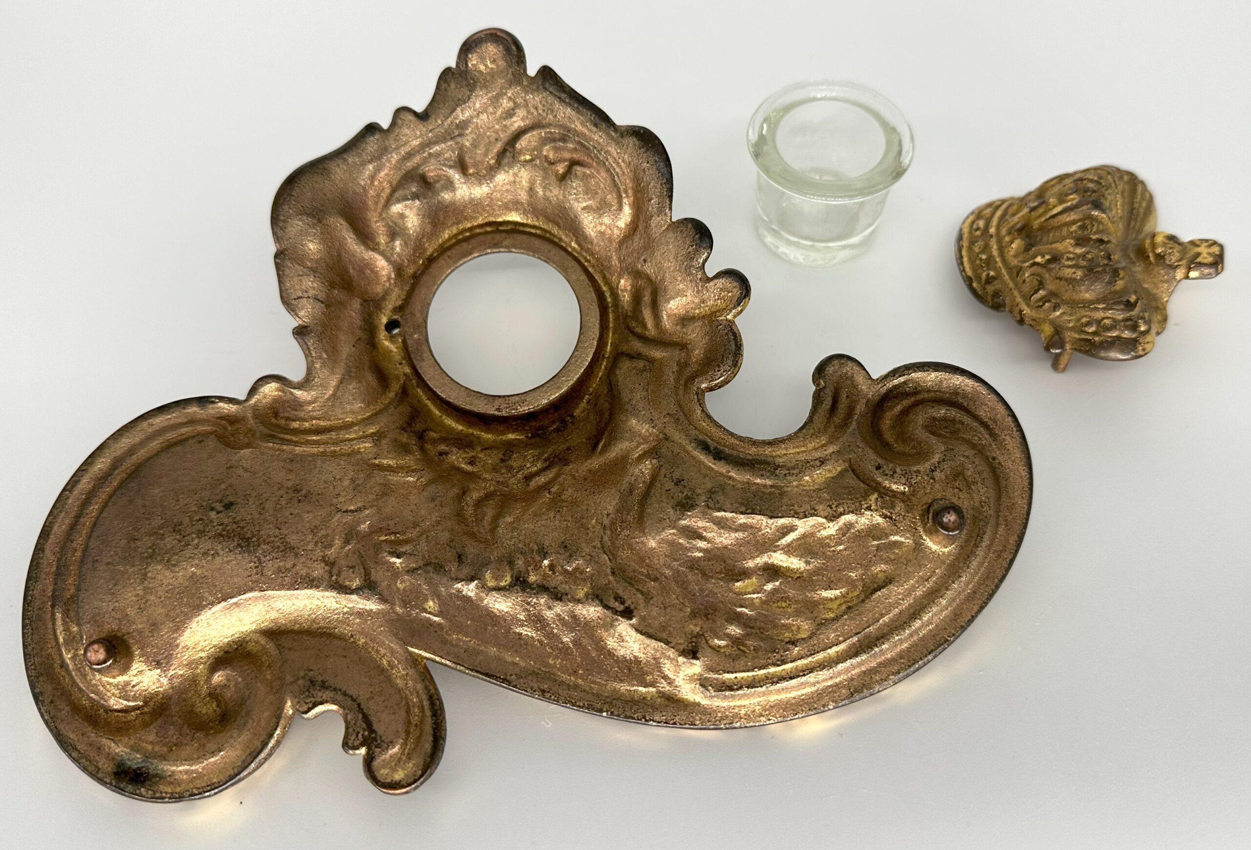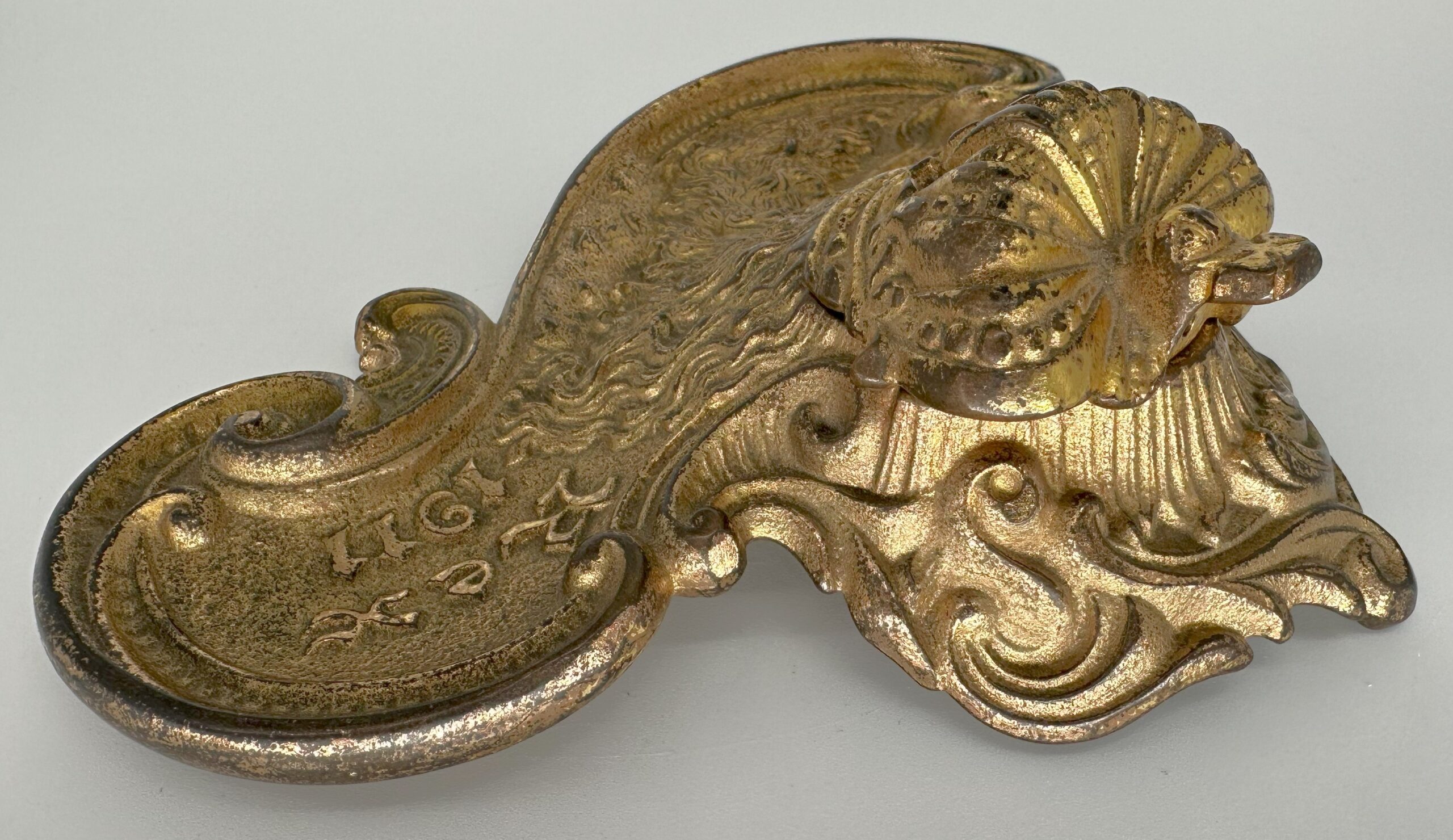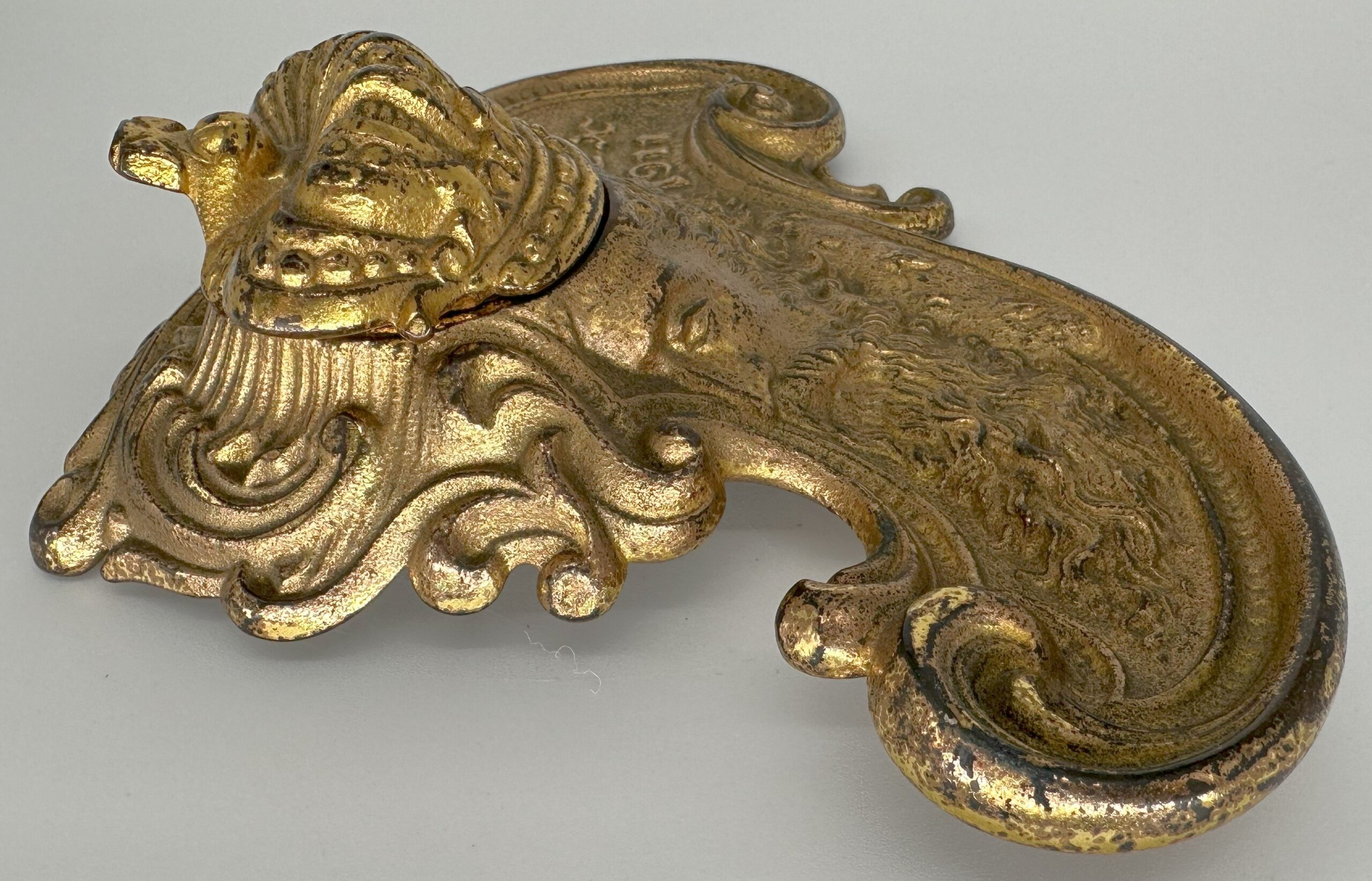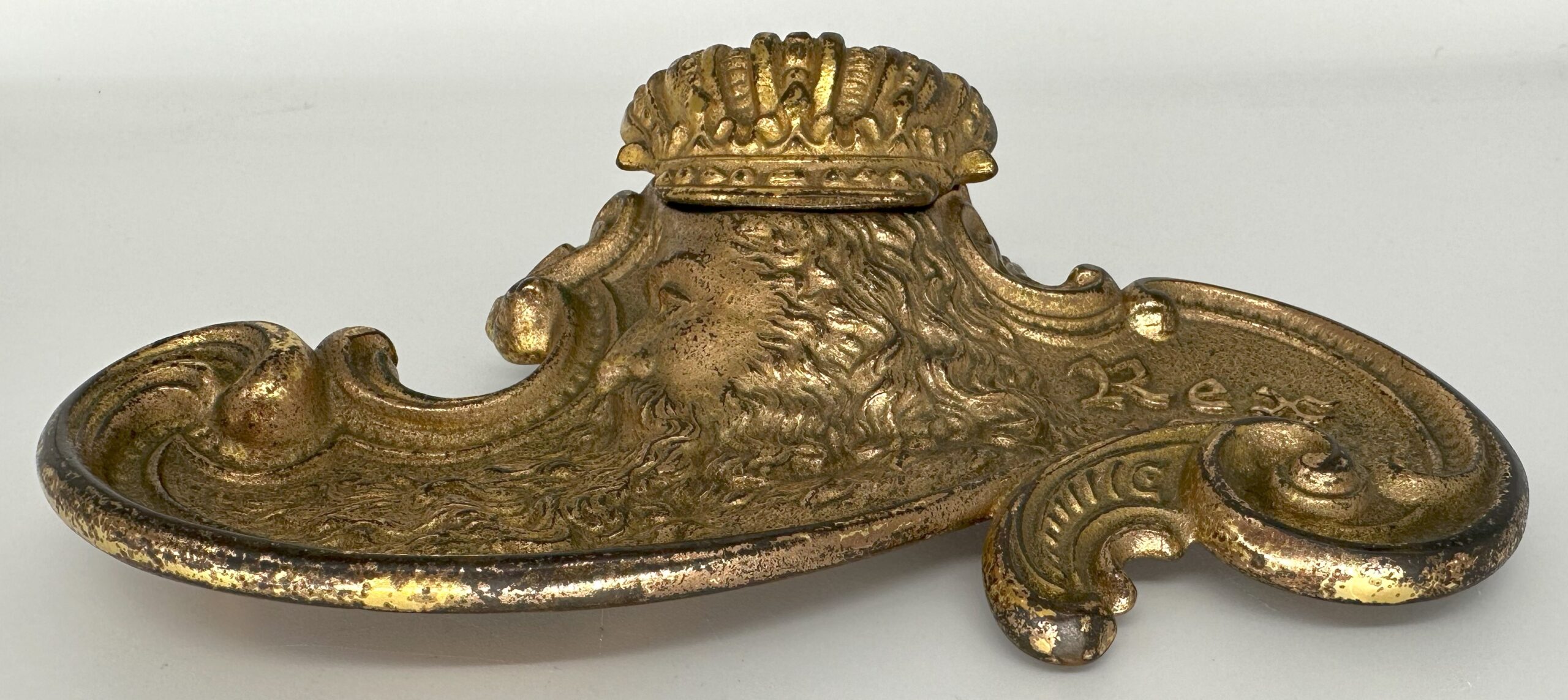 The inkstand depicts the head of “Rex” in high relief with his long flowing locks and beard. His crown swivels open to access the inkwell. The date 1911 is embossed on the right side. Designed in the Art Nouveau style, the inkstand features sinuous, flowing lines in the design. The piece is made of brass plated cast iron.