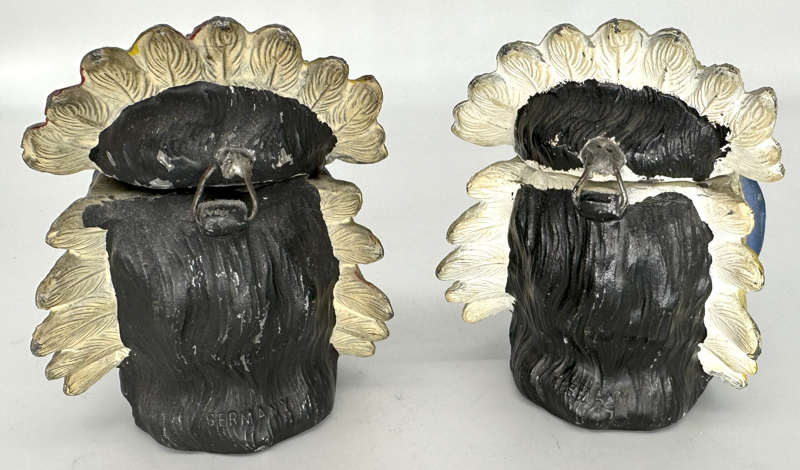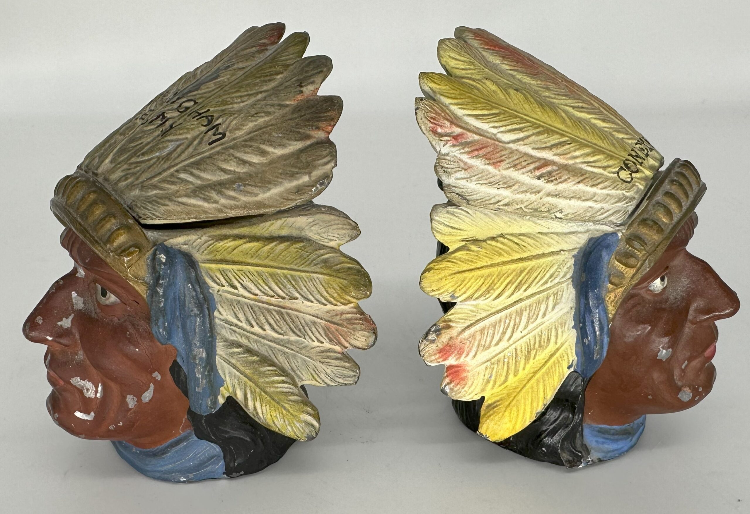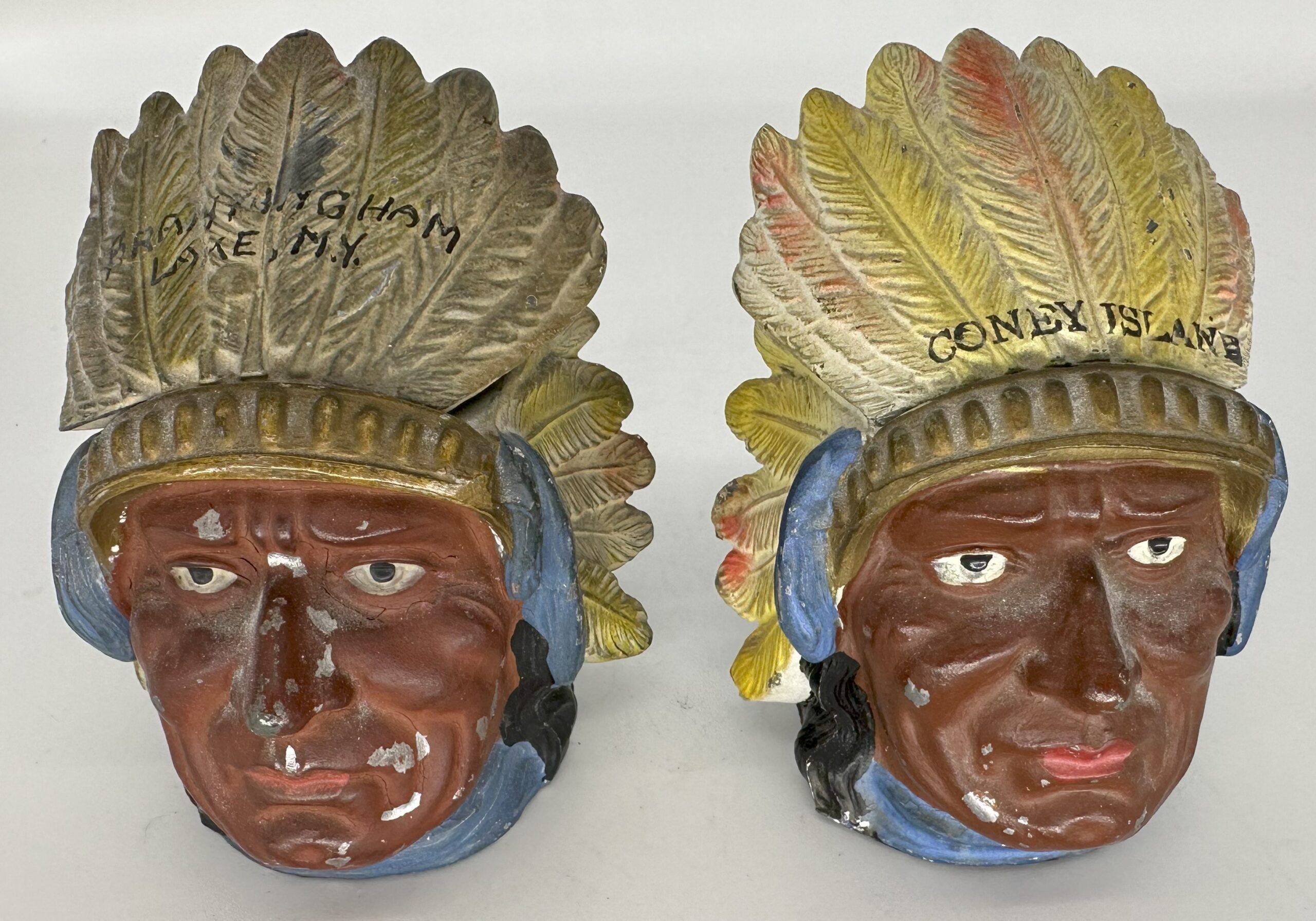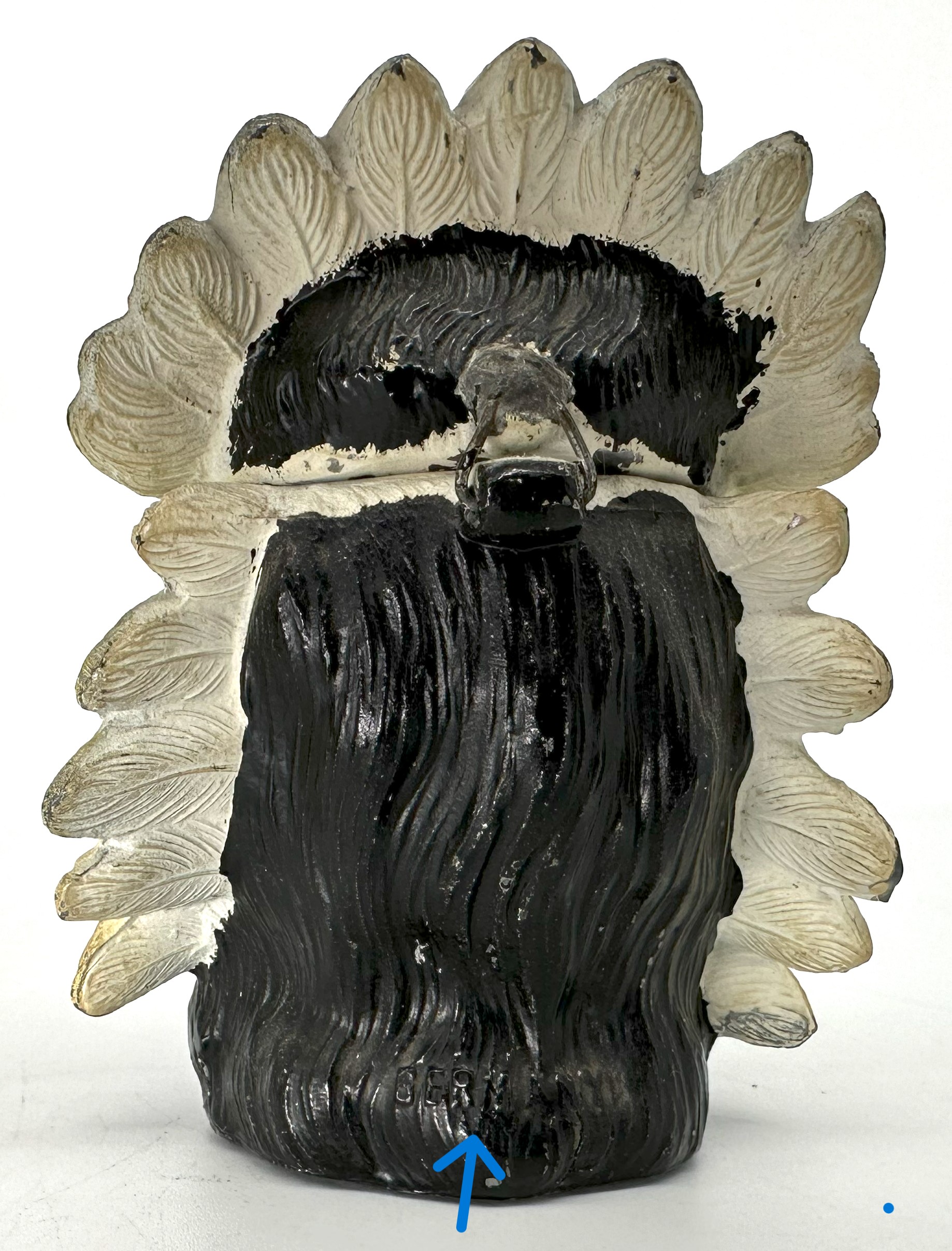 Souvenir inkwell – the head of an Indian wearing a feather bonnet. They are hand-painted and made from pot metal.  The hinged feathers are the inkwell lid. These were sometimes sold at tourist destinations with the location written across the headdress. The two pictured are marked “Coney Island” and Brantingham Lake NY. Also seen as a location: Rouses Point NY. These are similar but smaller and of lessor quality than painted polychrome souvenir inkwells with a cast metal emblem attached. These are marked “Germany” on the lower back.