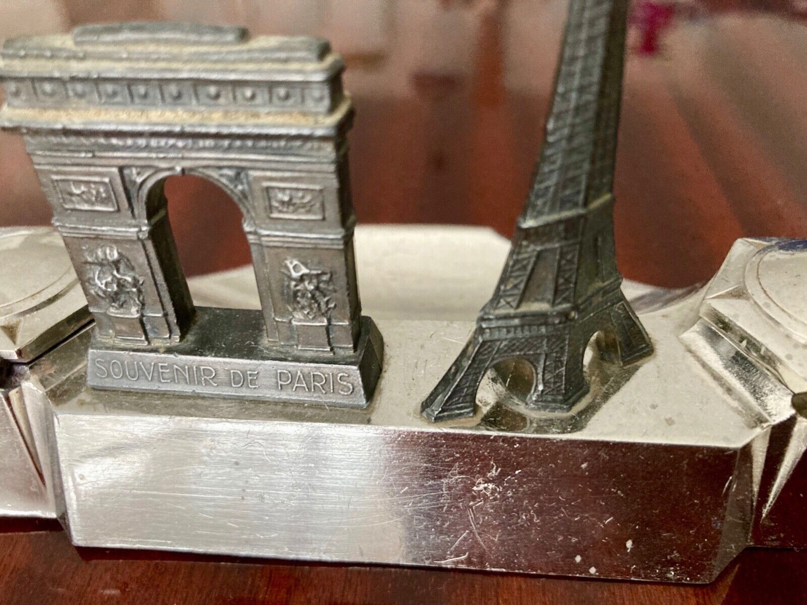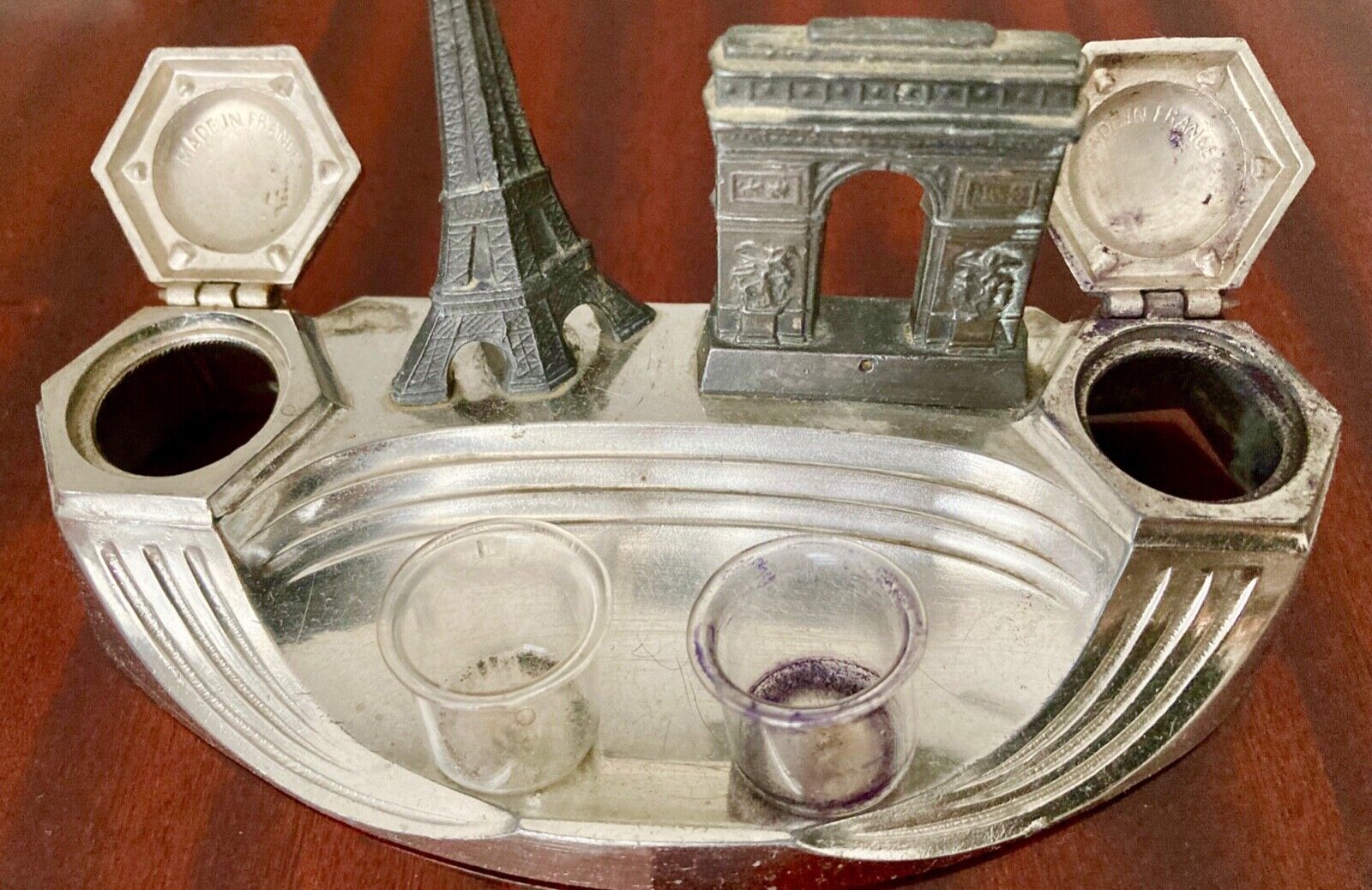The Eiffel Tower and the Arc de Triomphe grace this souvenir inkstand. The chrome metal piece is marked “Souvenir de Paris” and “Made in France”. The inkstand has its original glass inserts.