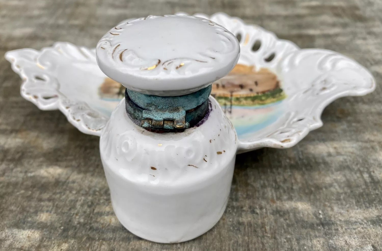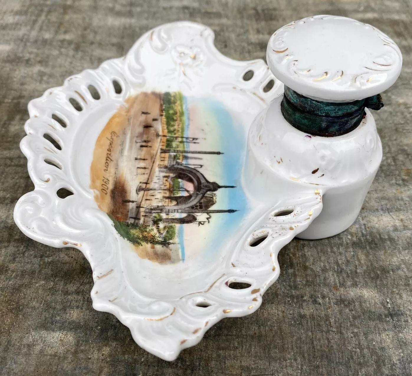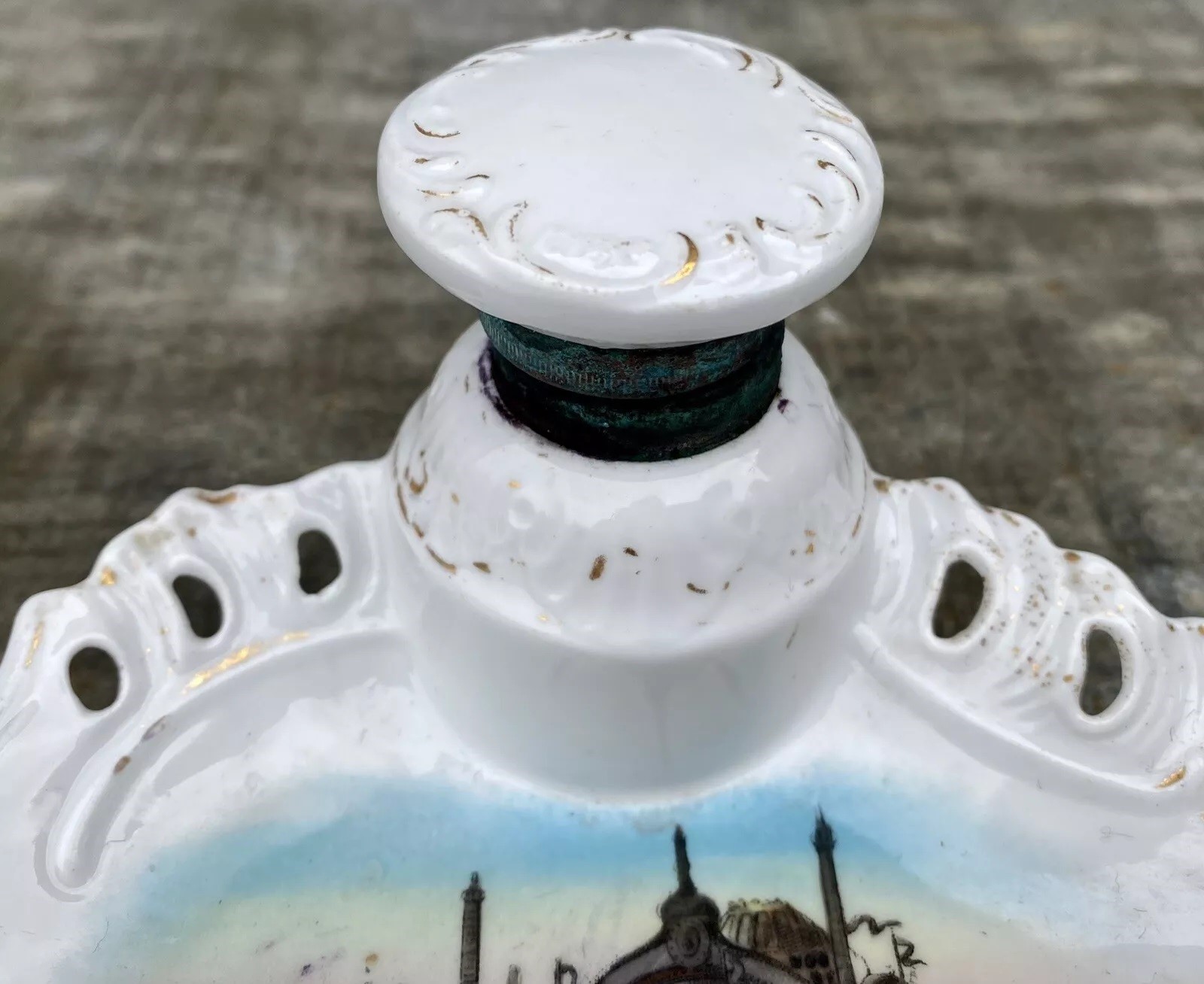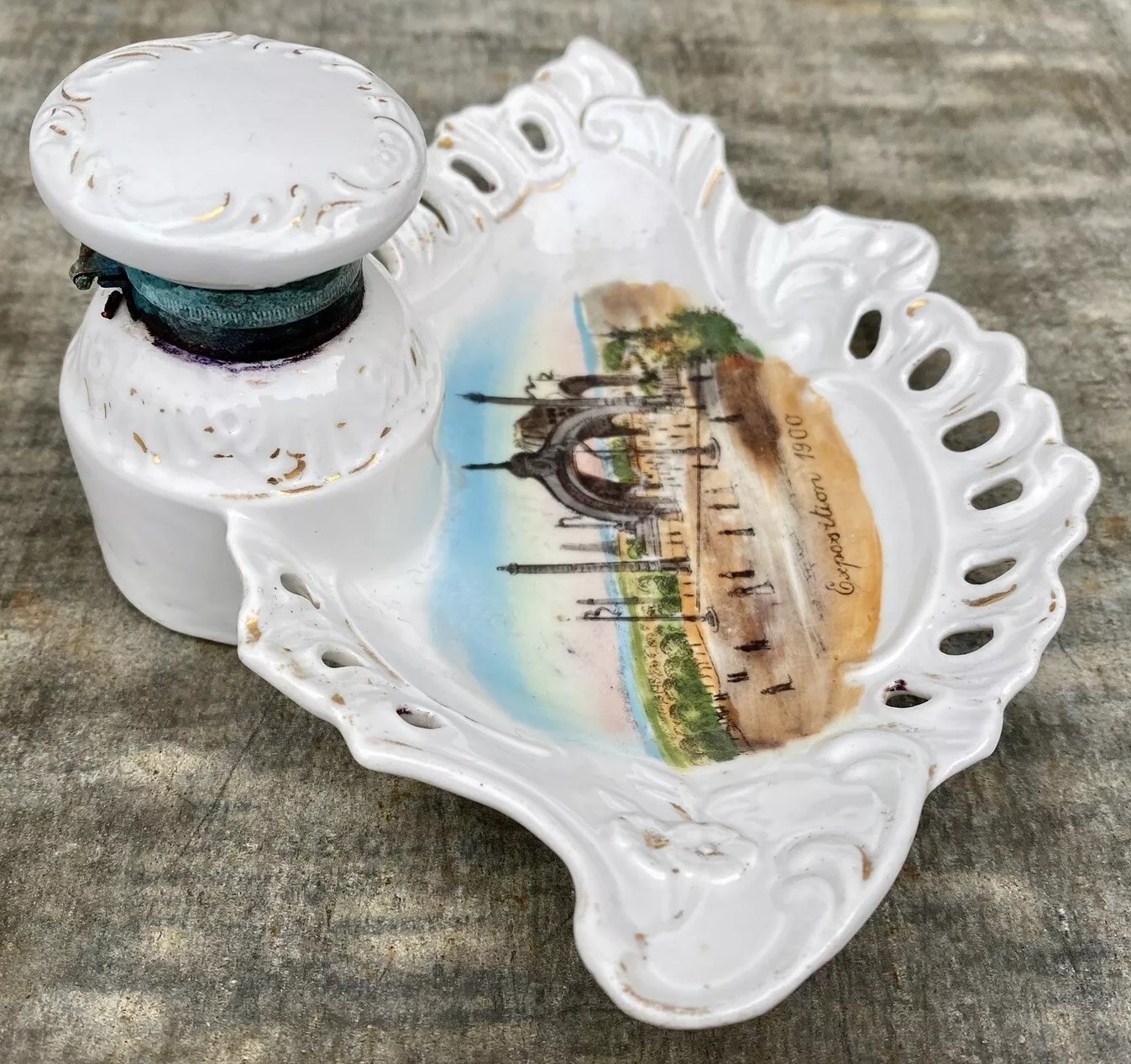 A second souvenir inkwell pictured shows the grand entrance to the 1900 Paris Exposition. It features a large archway adorned with several flags and includes figures of people milling about.