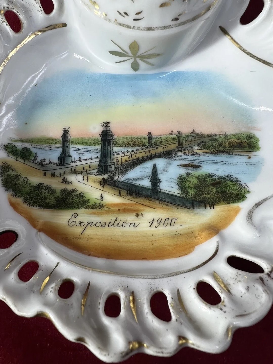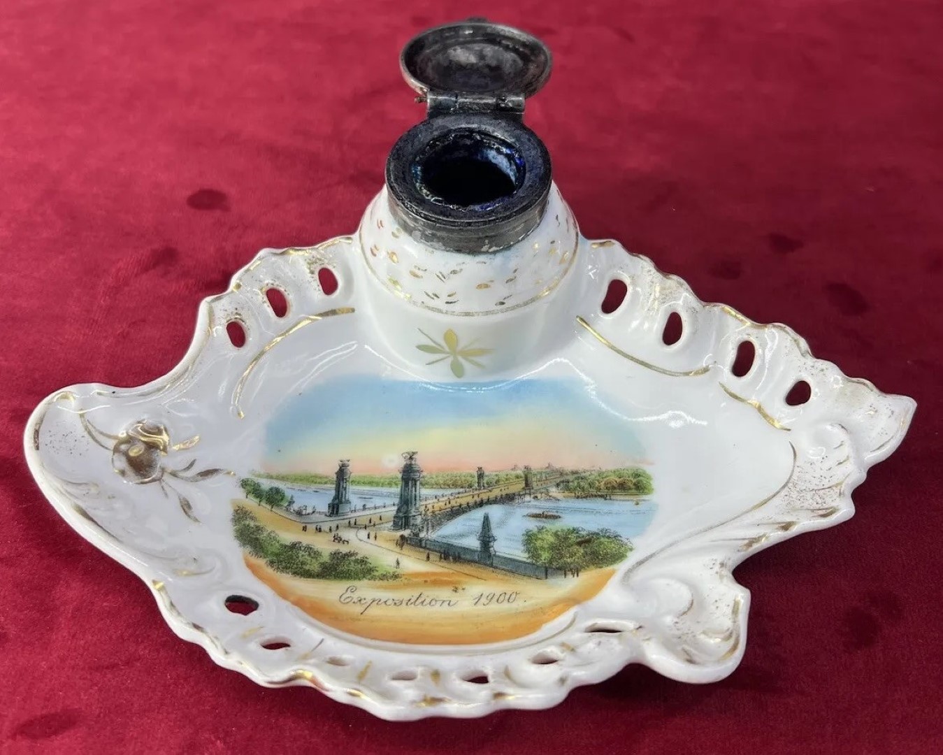 The Alexander III Bridge (Pont Alexandre III) is pictured on this porcelain inkstand. The bridge, with its exuberant Art Nouveau lamps, cherubs, nymphs, and winged horses and built for the exposition, is widely regarded as the most ornate bridge in Paris. It is named after Tsar Alexander III of Russia, who had concluded the Franco-Russian Alliance in 1892. His son Nicholas II laid the foundation stone in October 1896.