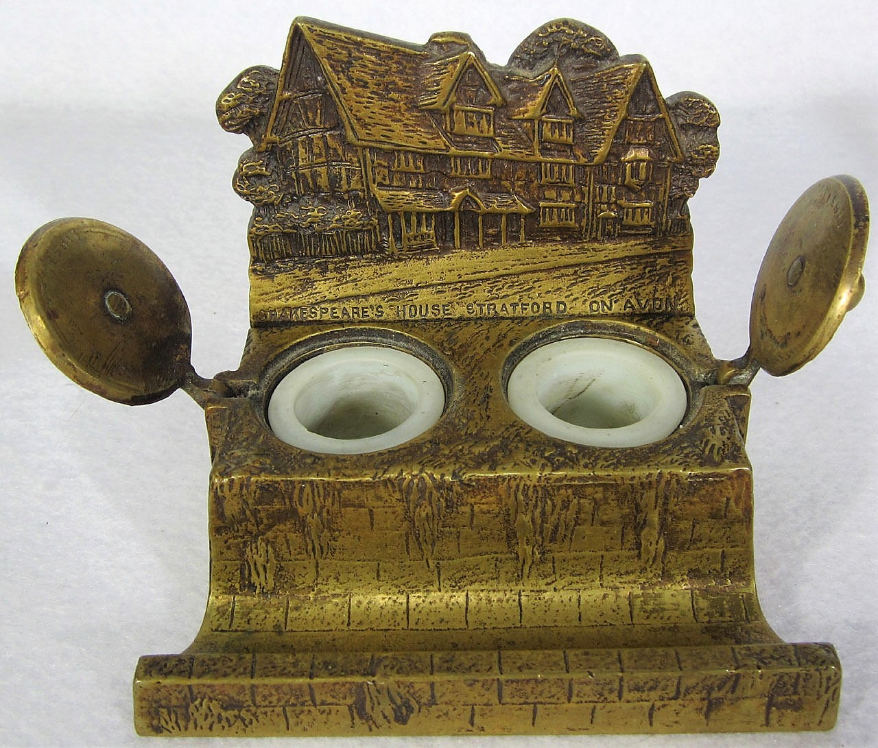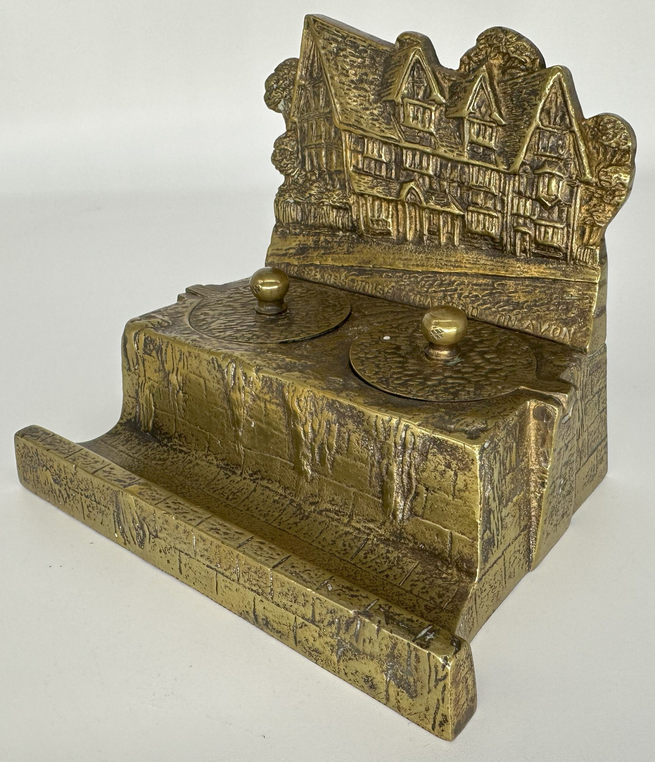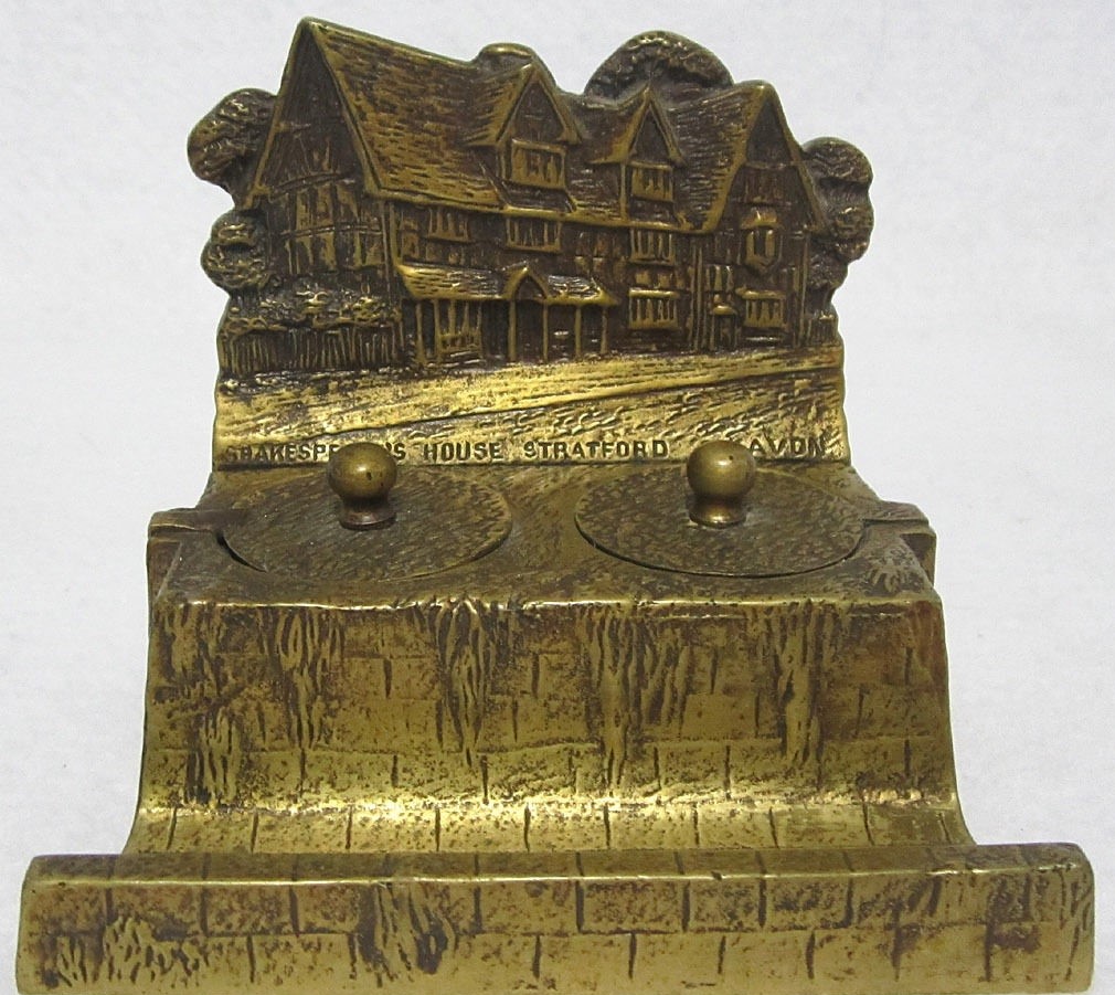 Charming heavy brass souvenir of Shakespeare’s House at Stratford on Avon. The house made in high relief overlooks two inkwells with pull-up hinged lids. A pen tray completes the piece.