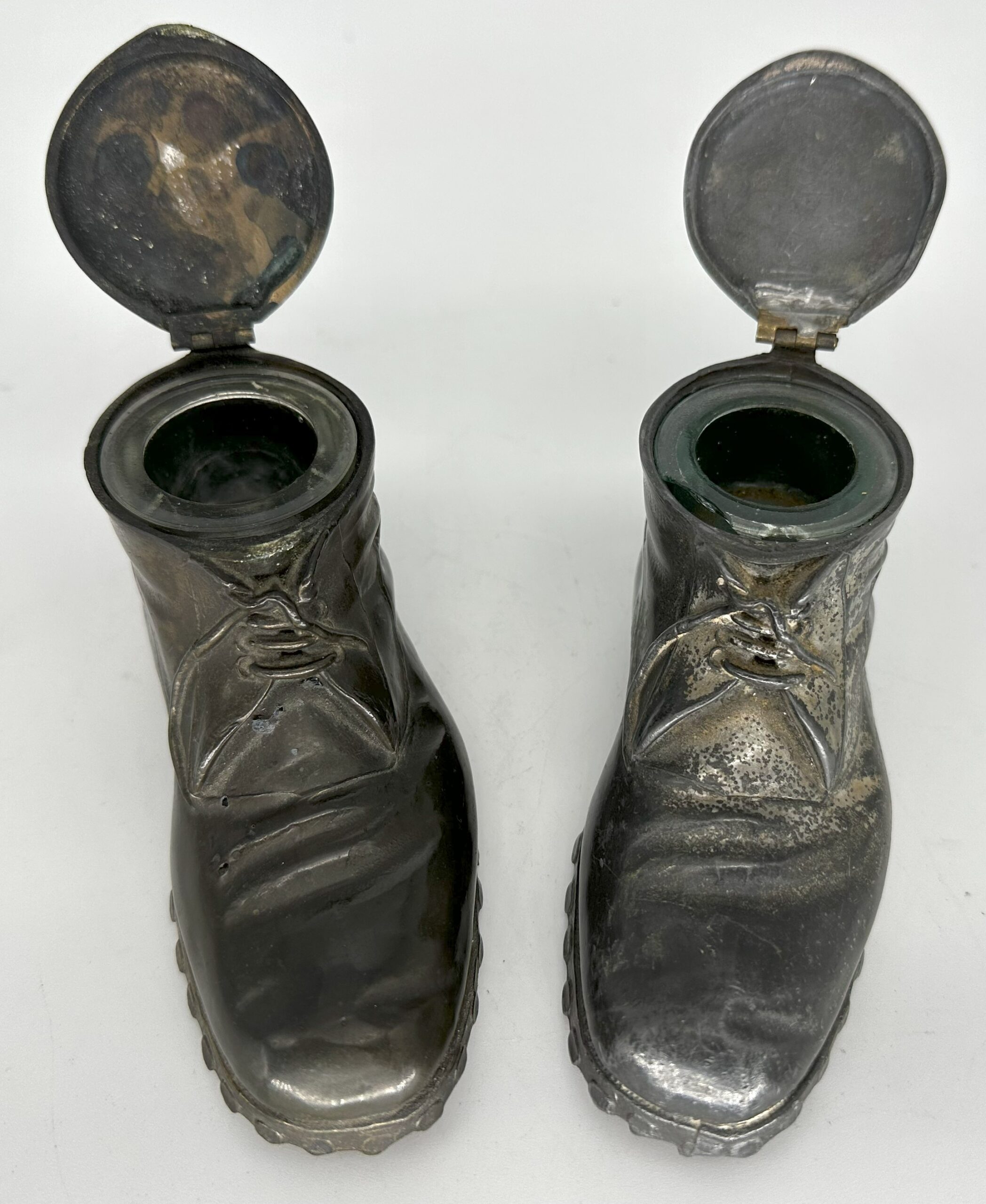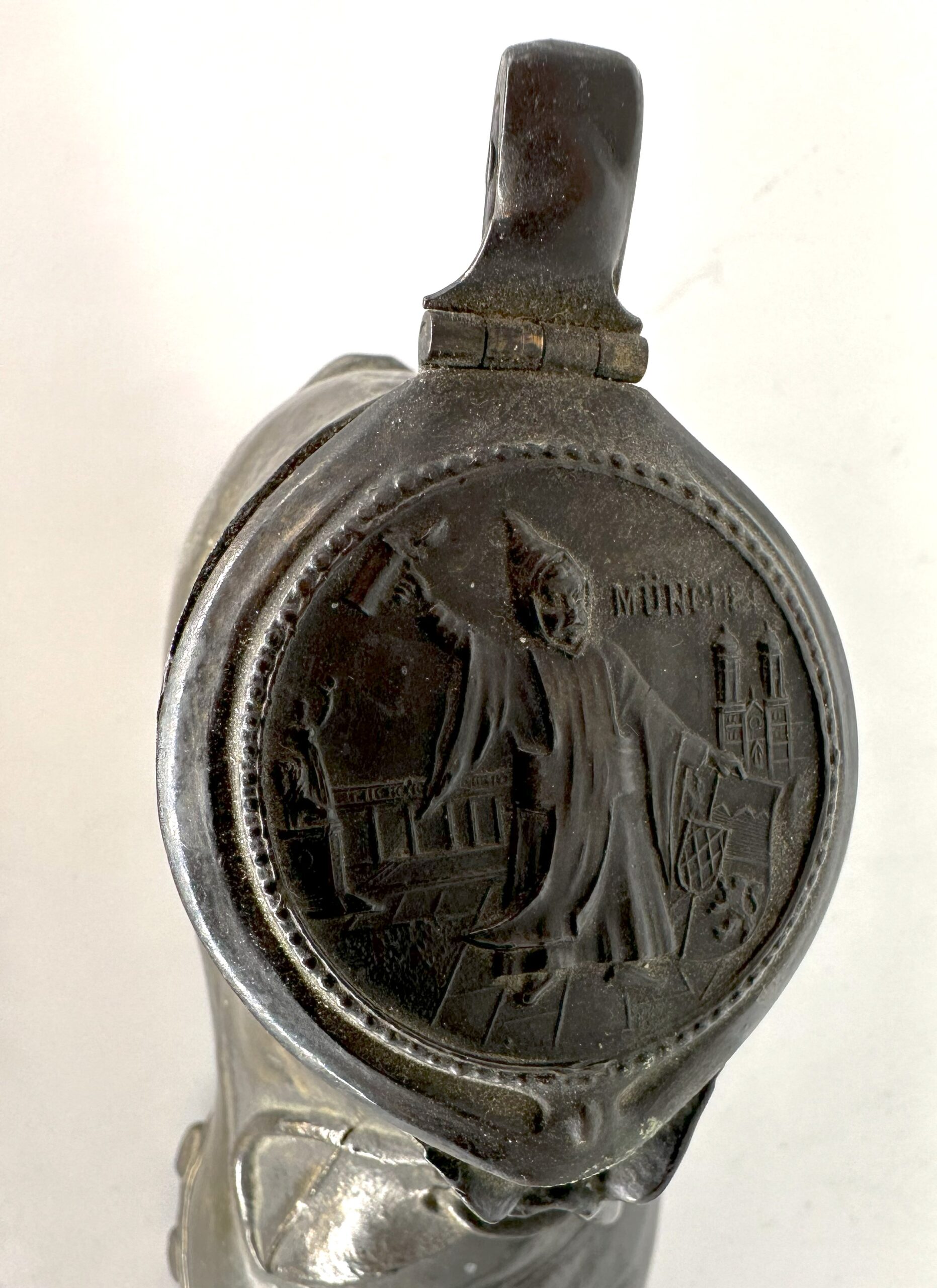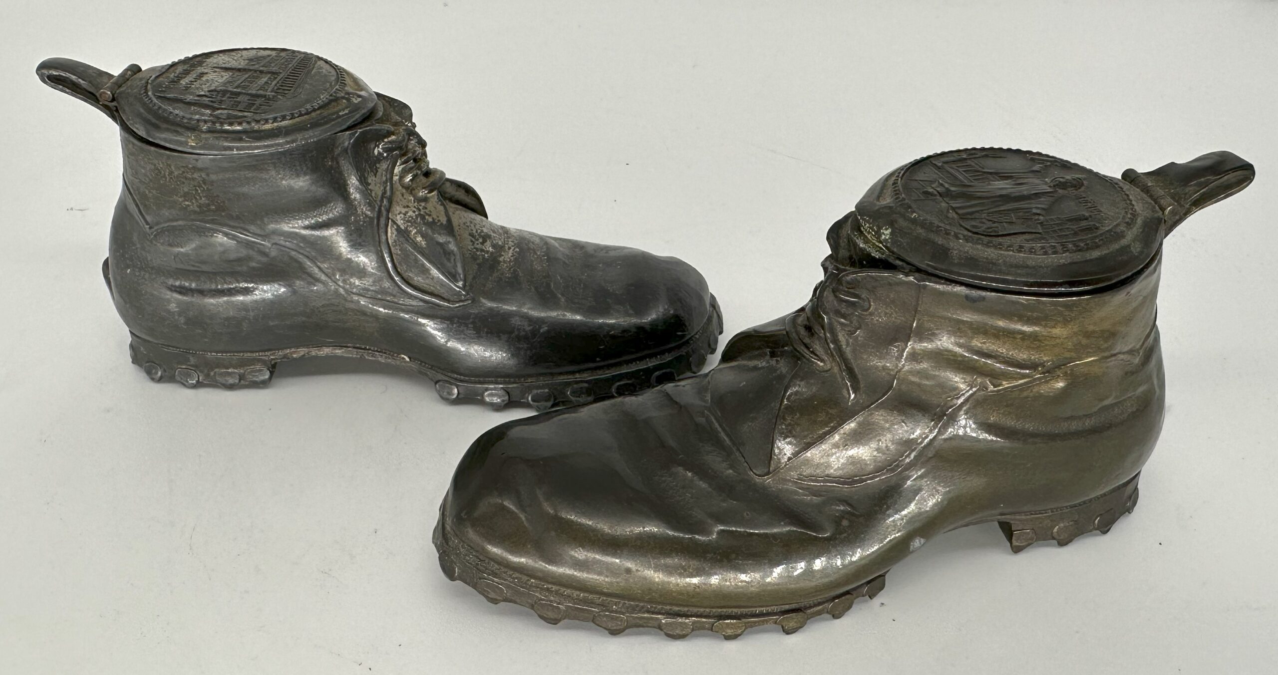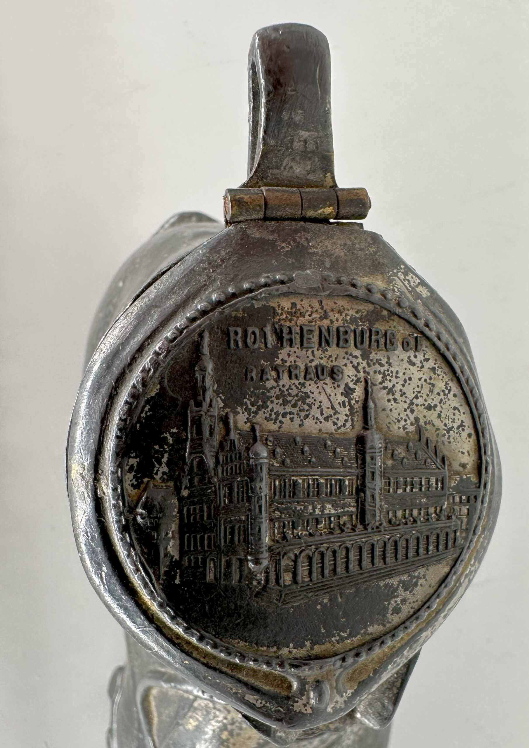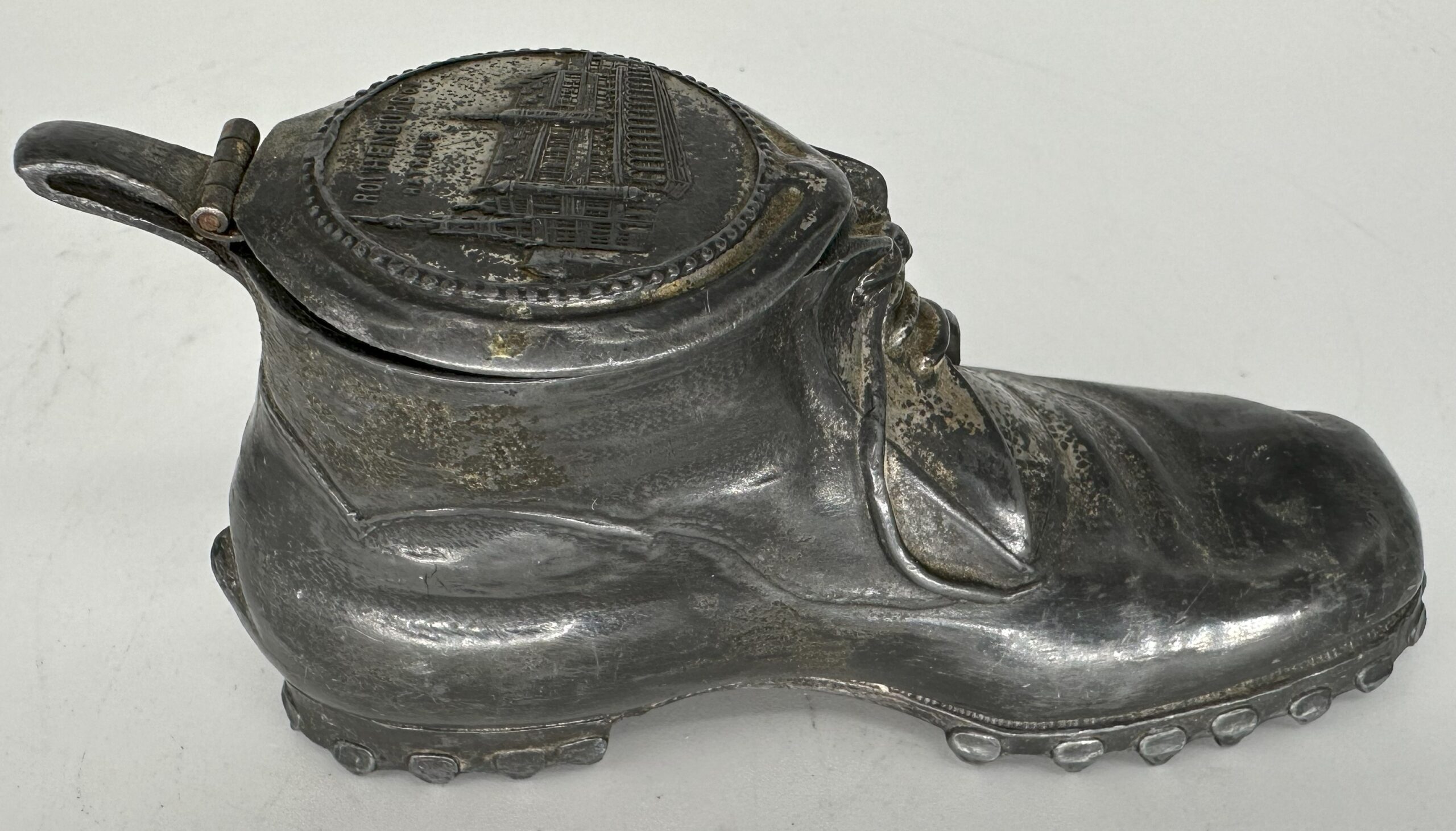 Souvenirs in the form of a shoe were popular – equating travel with the need for good shoes. Here are two examples. One depicts the Münchener Kindl (Munich Child) for the city of München (Munich) and the other depicts the Rathaus (City Hall) for the city of Rothenburg o T (Rothenburg ob der Tauber). The same manufacturer produced both shoes – the same mold only with different lids for the featured tourist destination. One can find the same shoe for other cities, including Meran, Tirol and the Crystal Palace in London.