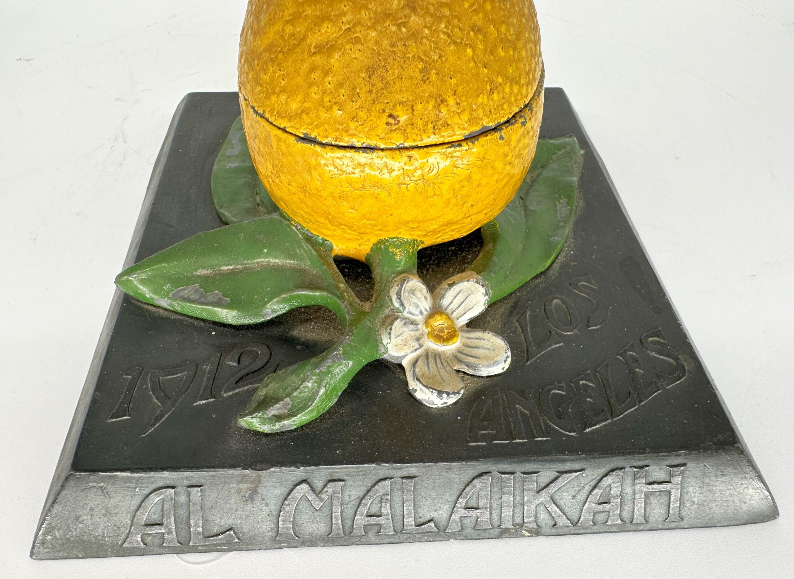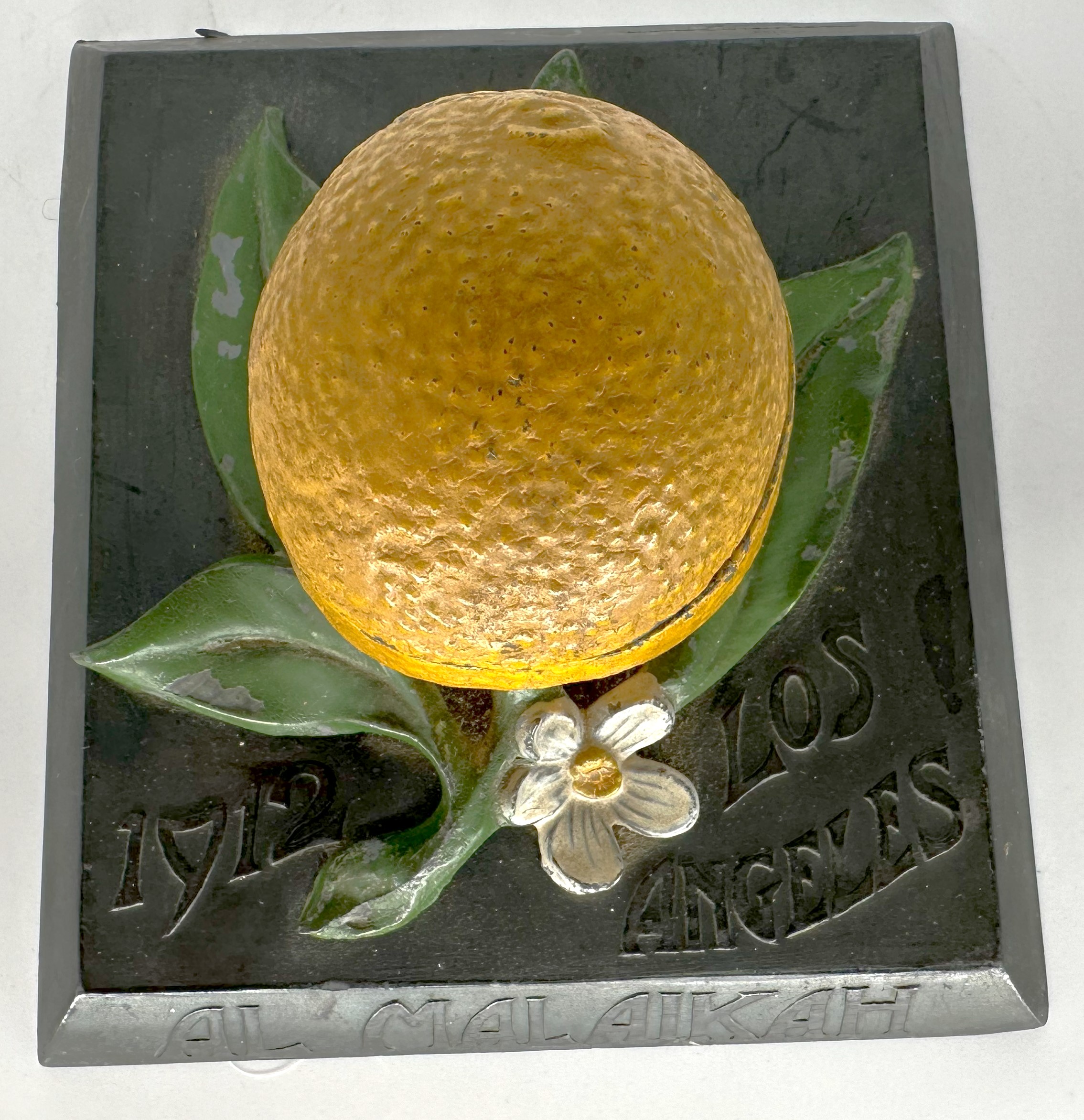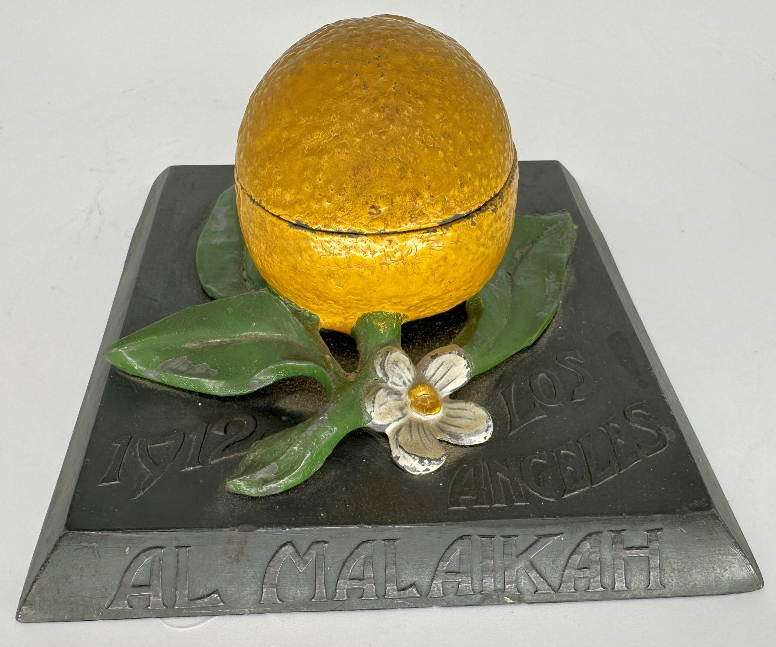This inkstand is in the shape of a small orange or tangerine. Made of heavy metal, green leaves with a blossom support the orange. The top half of the orange lifts to reveal the inkwell (no sign of hinges). Embossed 1912, Los Angeles, Al Malaikah, all in caps. Manufactured by Whitehead & Hoag, Newark N.J. (marked on the piece).