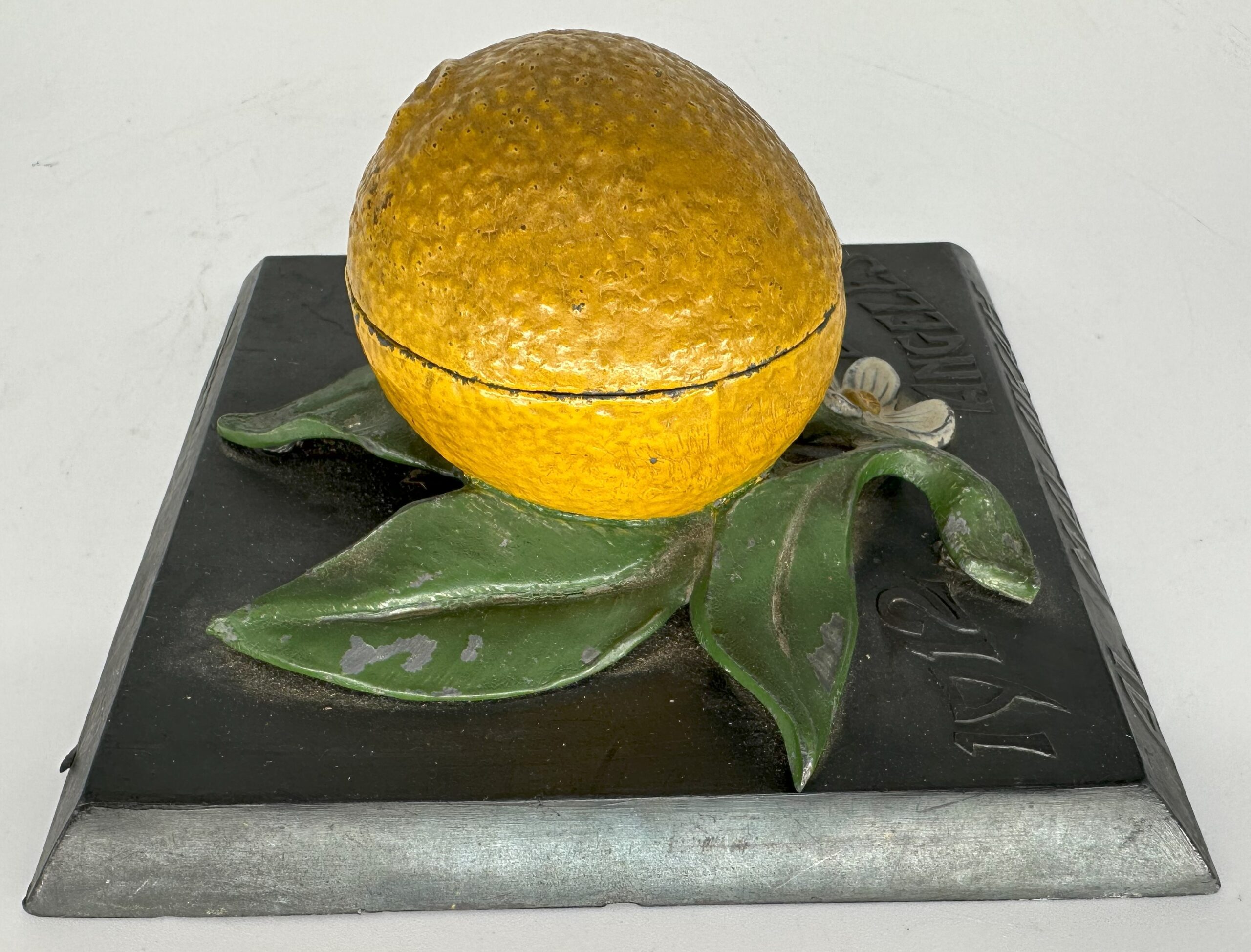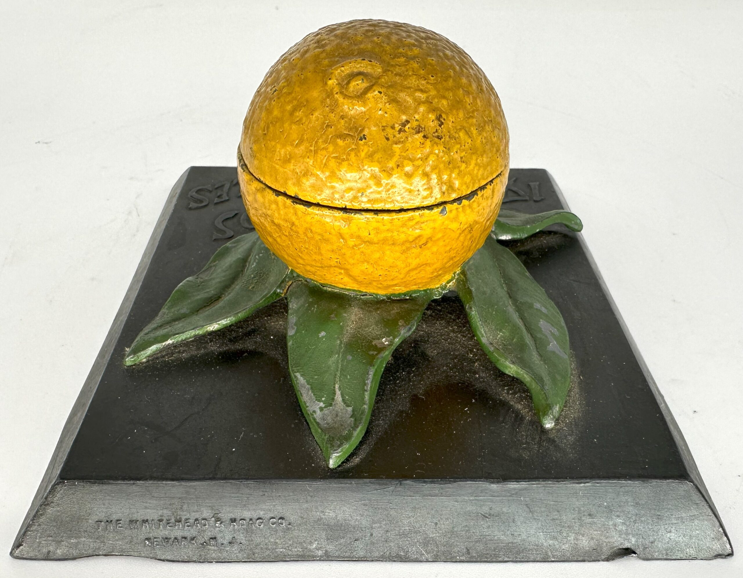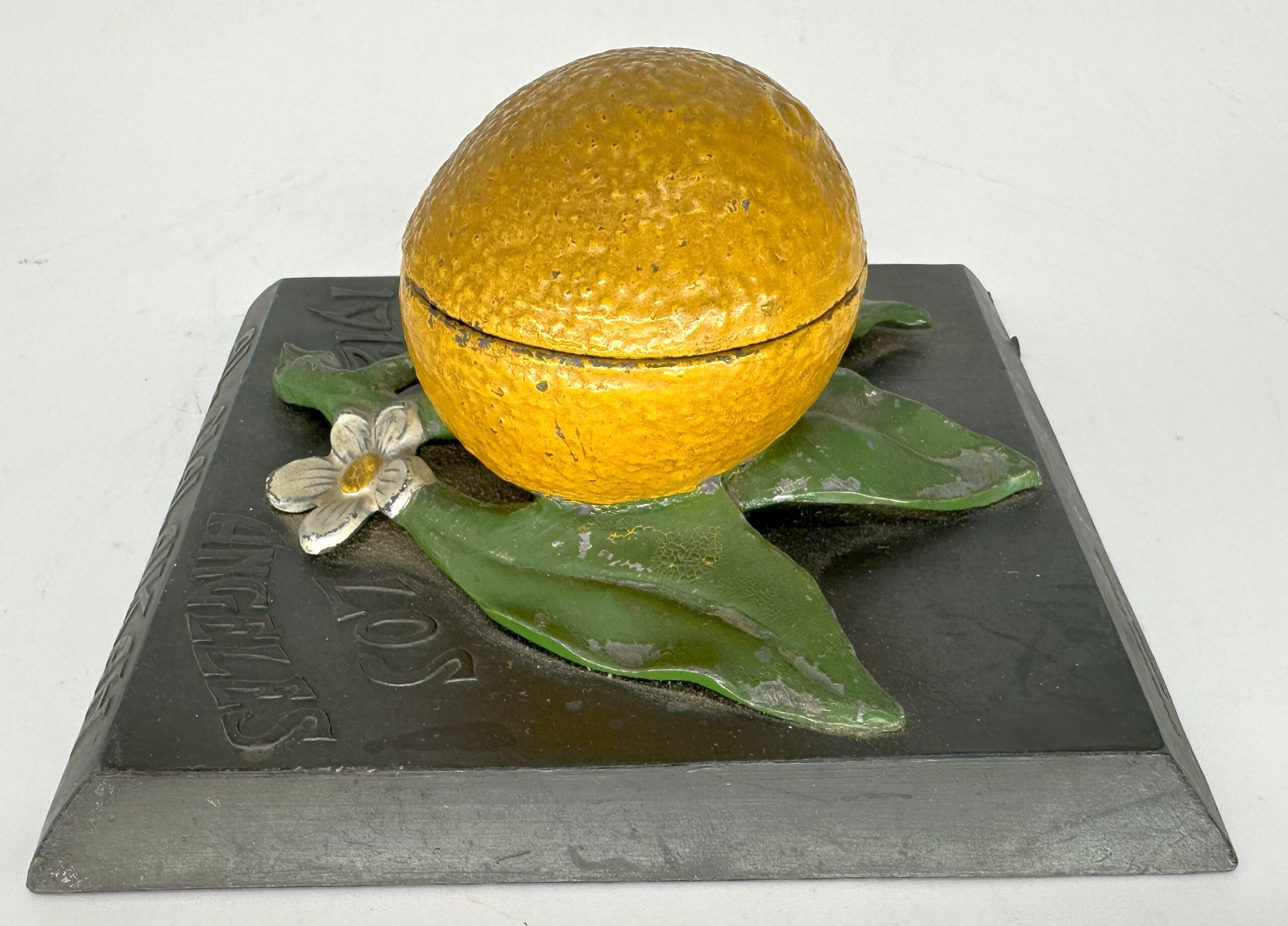 This inkstand is in the shape of a small orange or tangerine. Made of heavy metal, green leaves with a blossom support the orange. The top half of the orange lifts to reveal the inkwell (no sign of hinges). Embossed 1912, Los Angeles, Al Malaikah, all in caps. Manufactured by Whitehead & Hoag, Newark N.J. (marked on the piece).