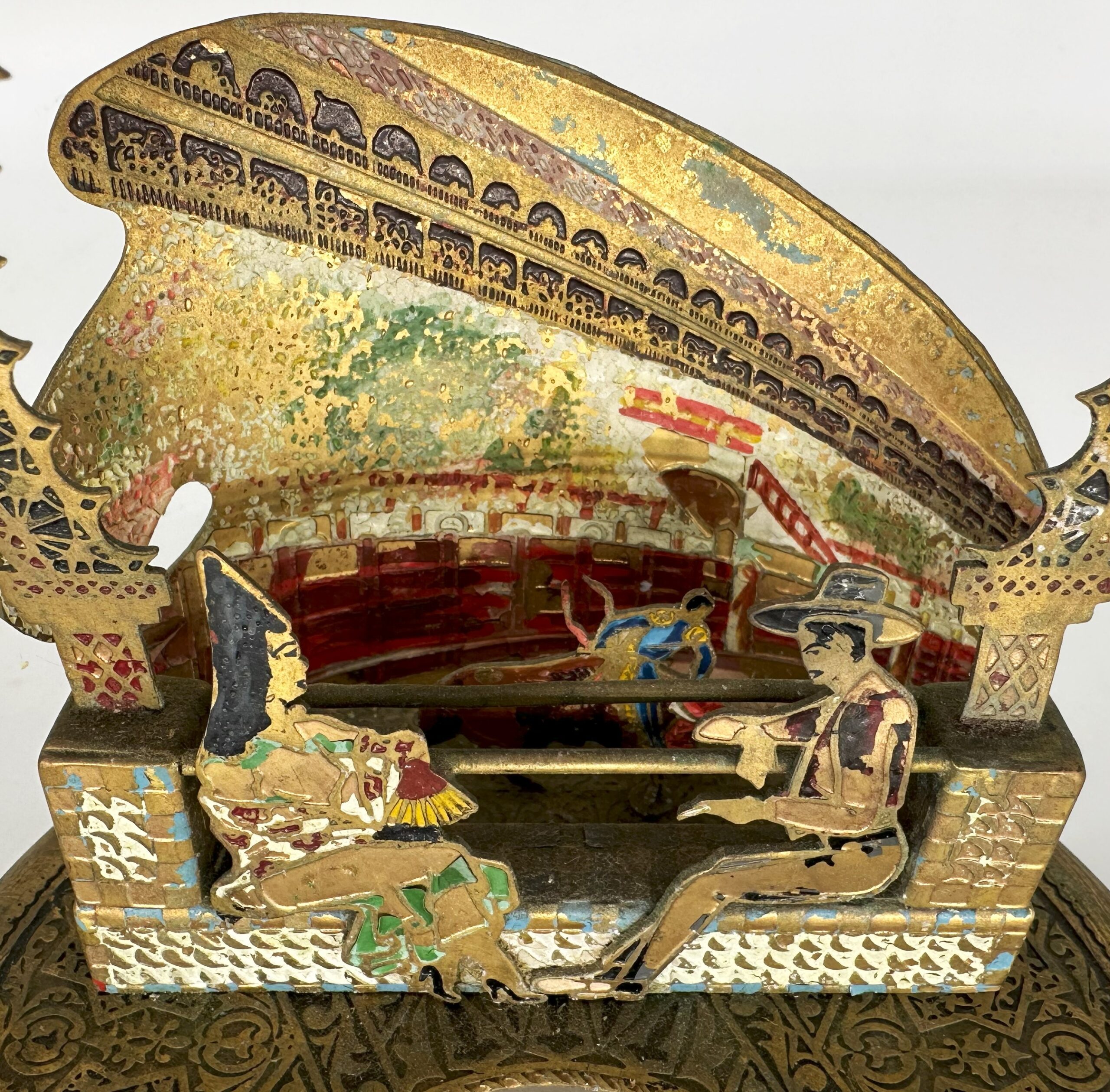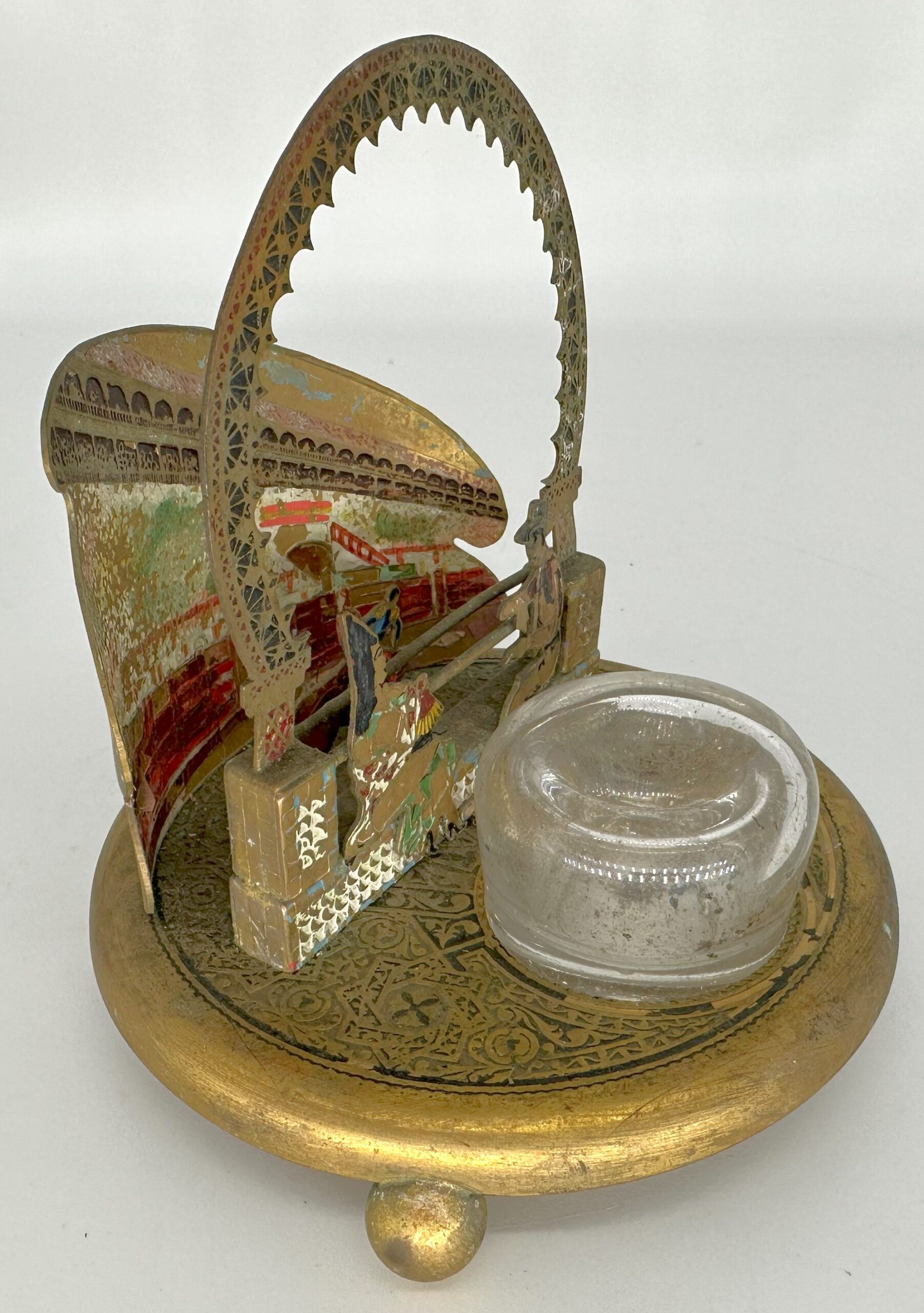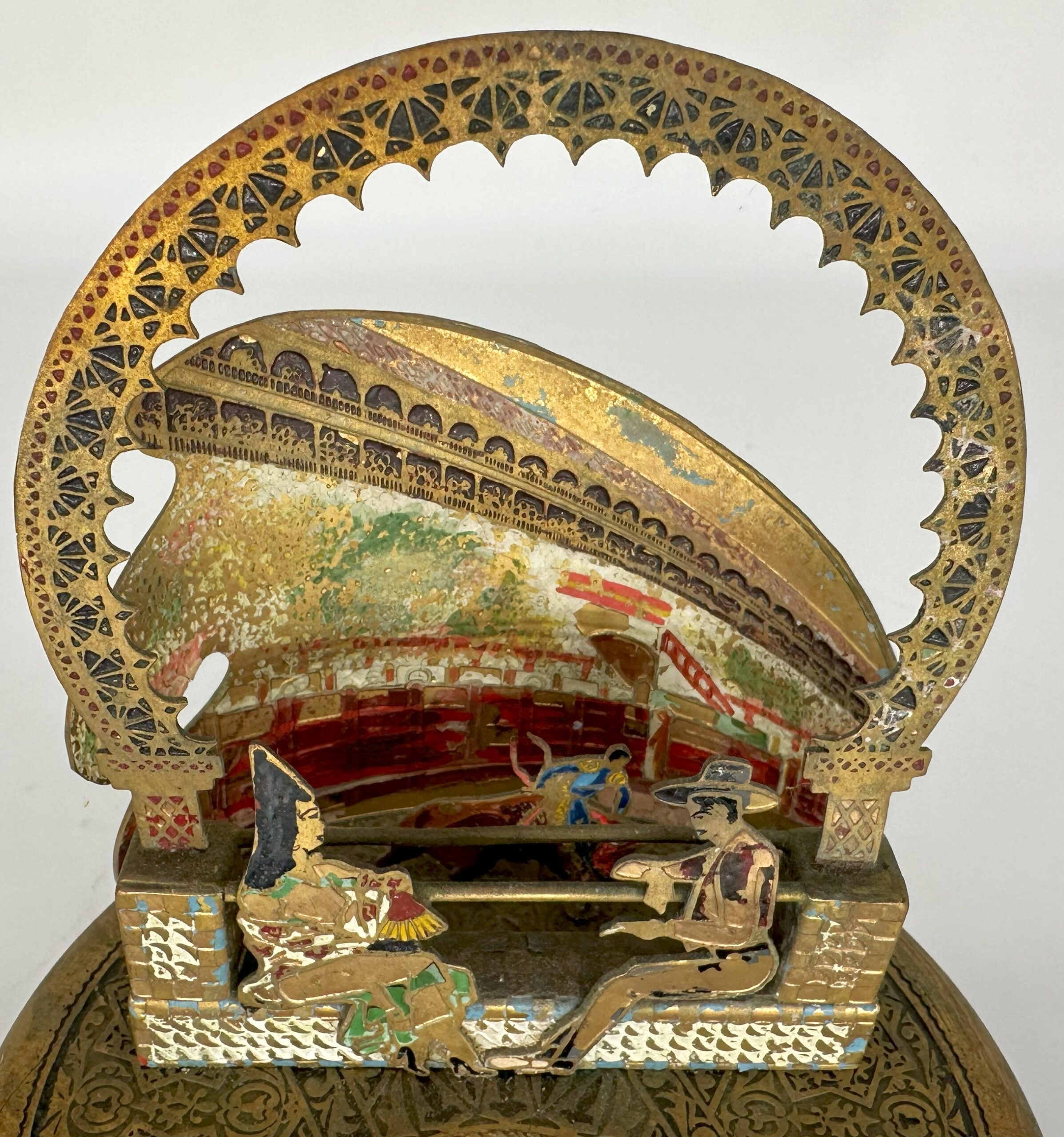 Unusual inkstand featuring a Spanish bull fighting scene. In the front, on a brass base, is the round glass inkwell. Further back are cutouts of a Señor and Señorita, who are sitting in front of the bull ring. The diorama continues with a cutout of the matador fighting the bull.