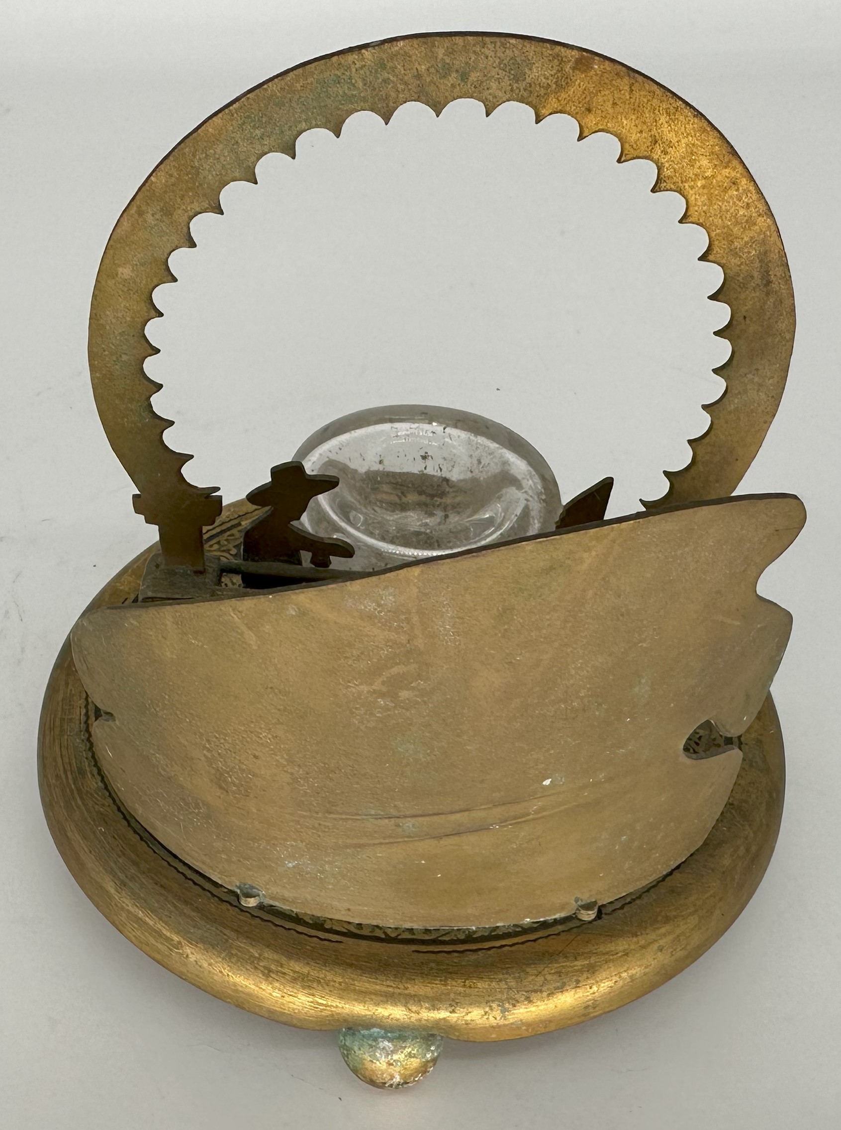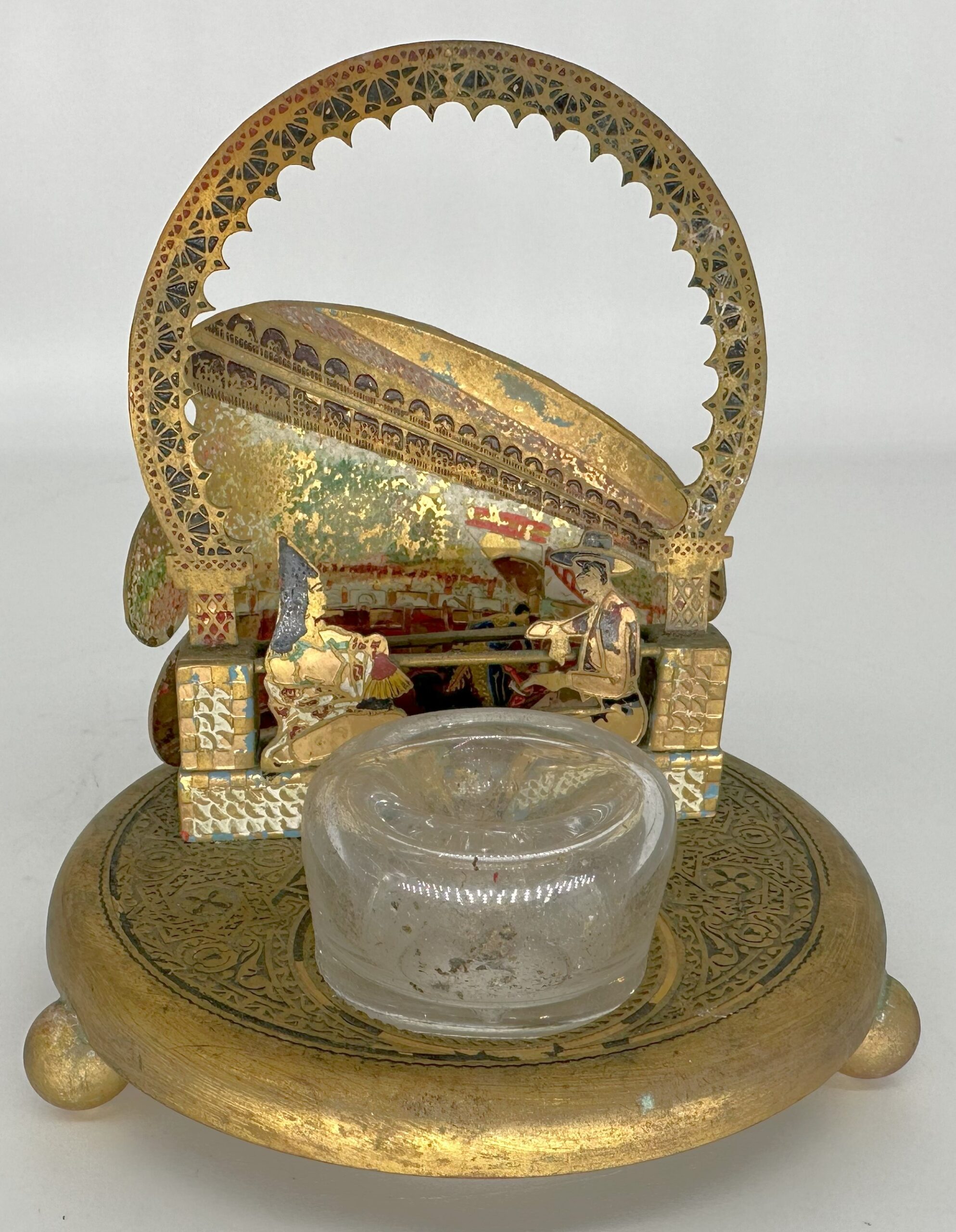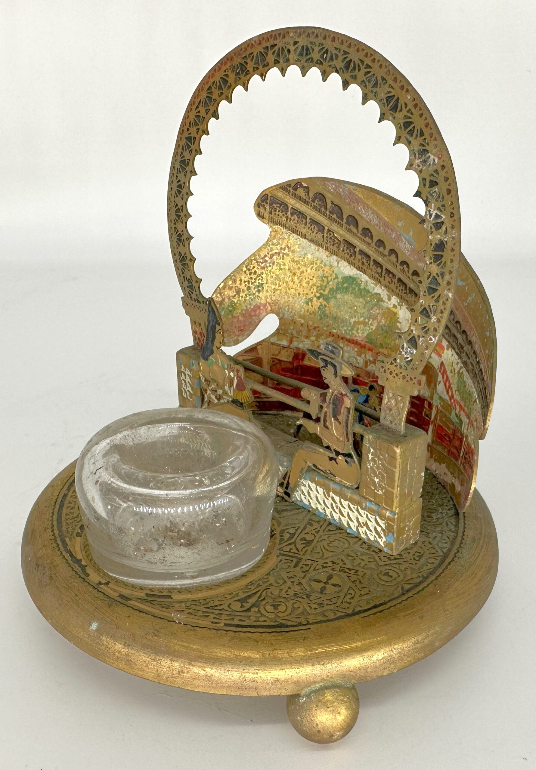 Unusual inkstand featuring a Spanish bull fighting scene. In the front, on a brass base, is the round glass inkwell. Further back are cutouts of a Señor and Señorita, who are sitting in front of the bull ring. The diorama continues with a cutout of the matador fighting the bull.