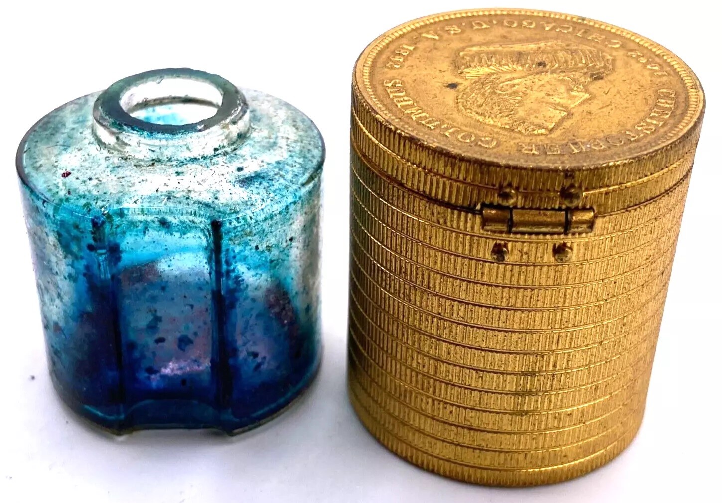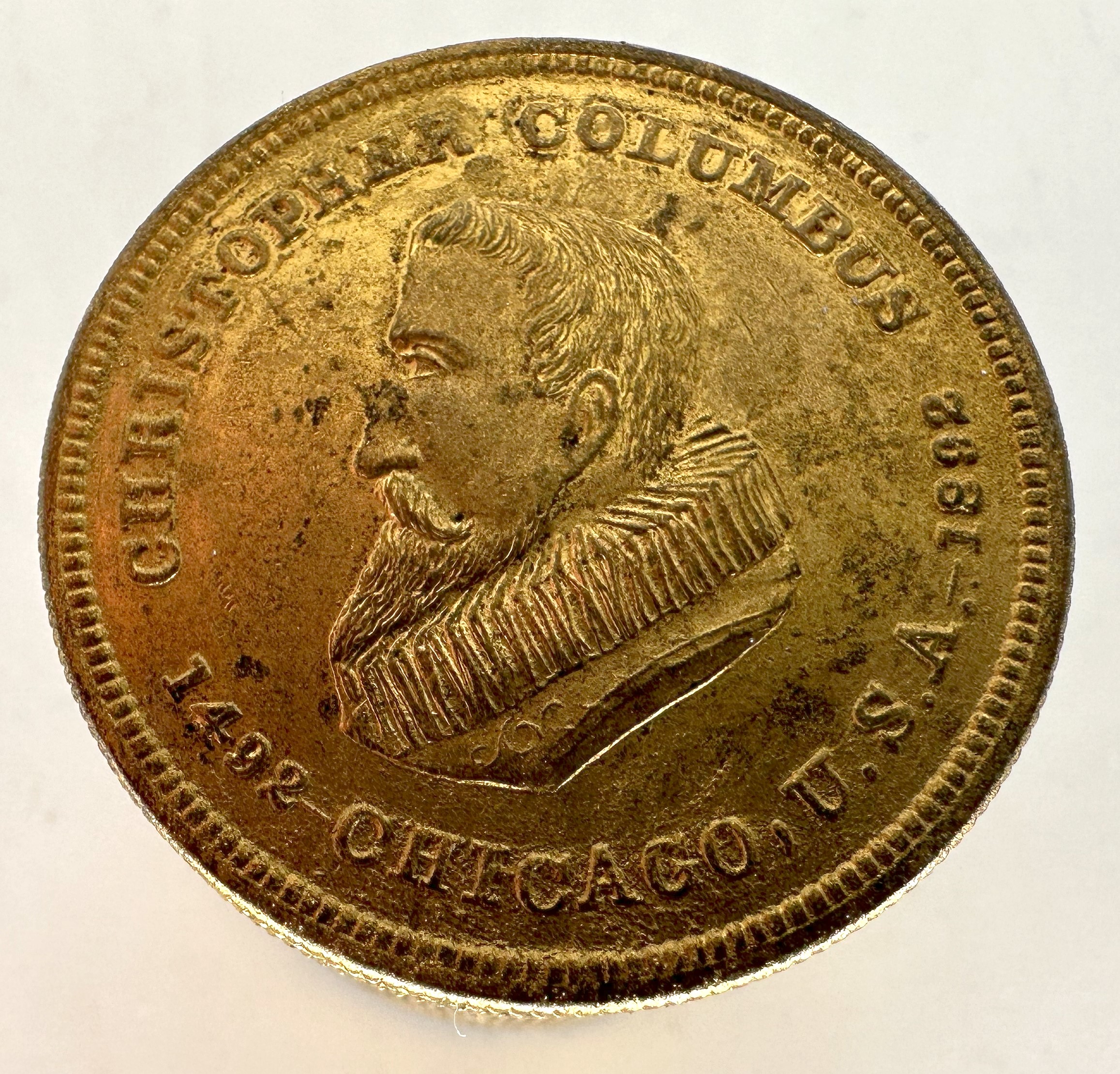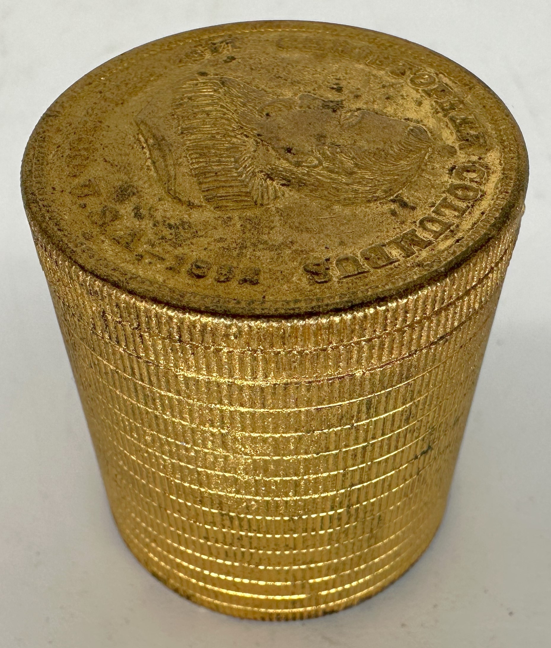 1893 Columbian Exposition Chicago World’s Fair souvenir stack of coins figural inkwell. The top coin shows the bust of Christopher Columbus in relief and “Christopher Columbus, 1492 – Chicago U.S.A – 1892.”