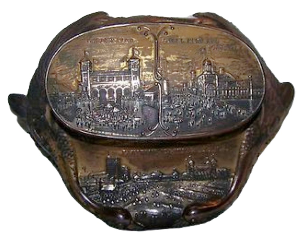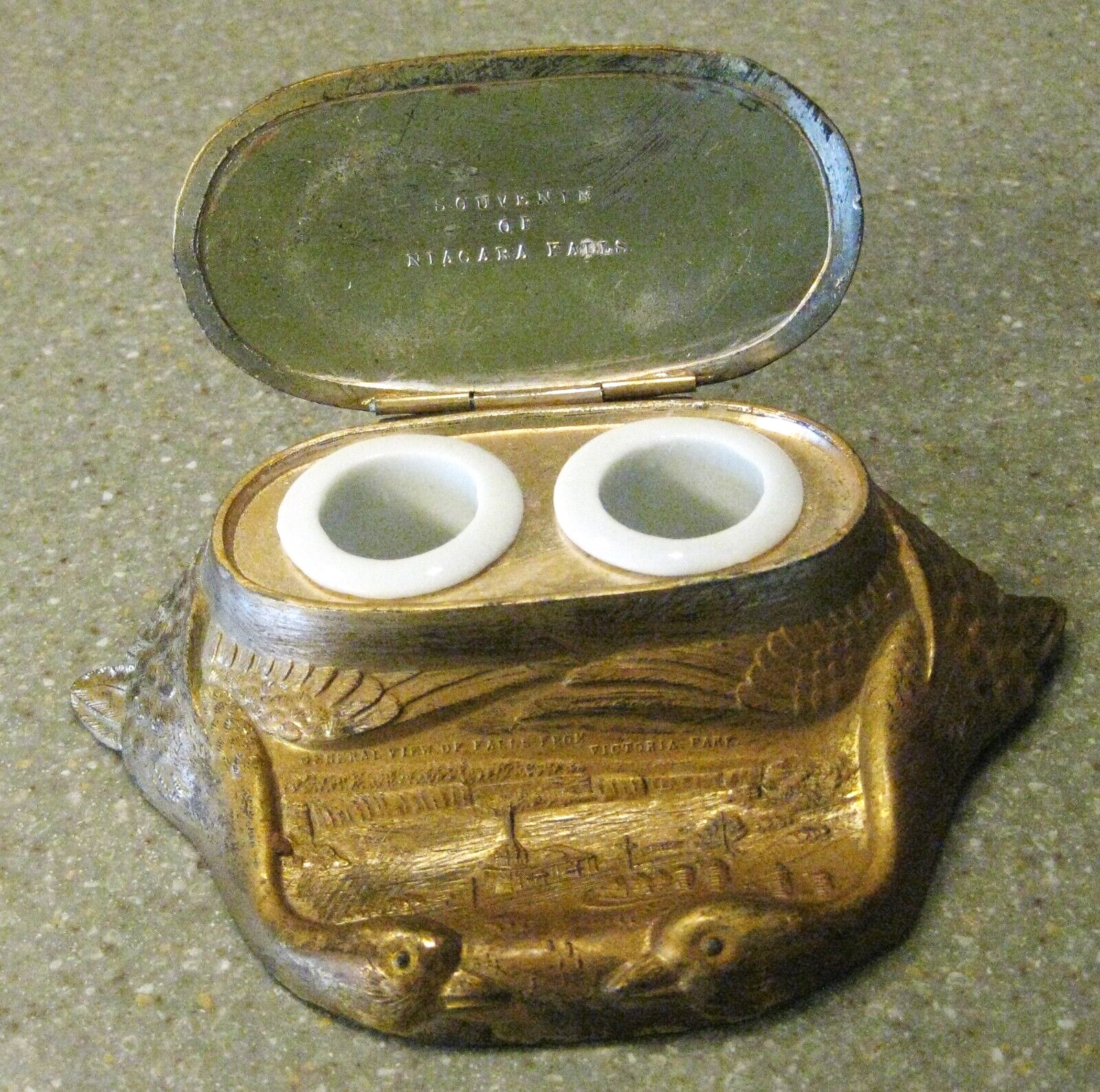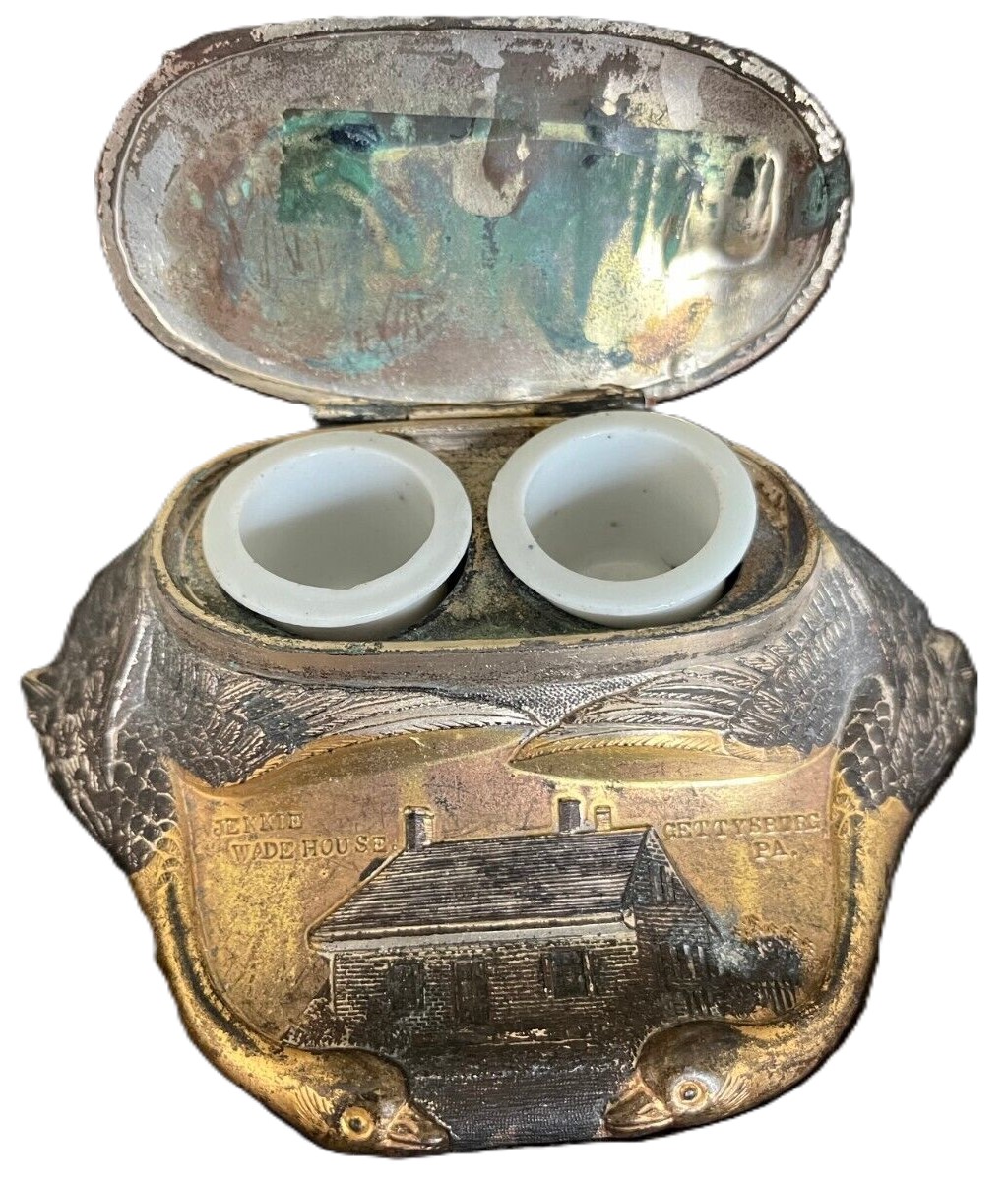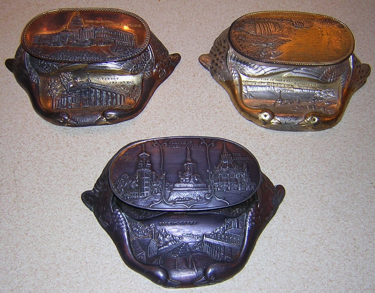 All from the same manufacturer, these cast white metal inkstands feature relief decorations of tourist attractions, with a pair of geese necks forming the base. Pictured are samples from Ontario Canada, Niagara Falls, Washington DC, New York City, Gettysburg, and Atlantic City.