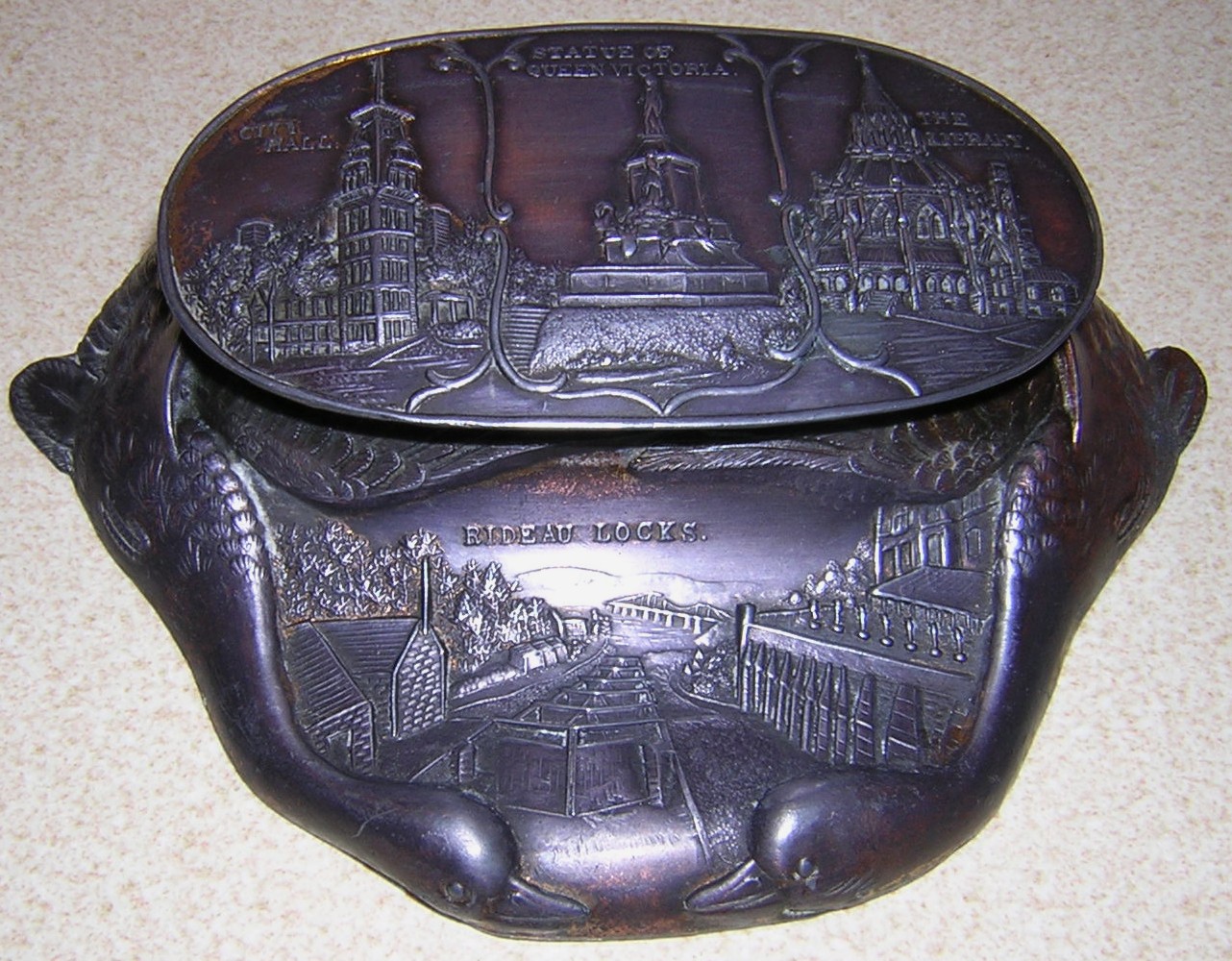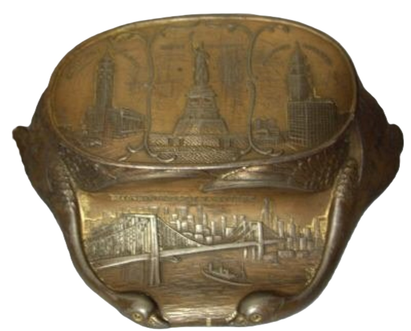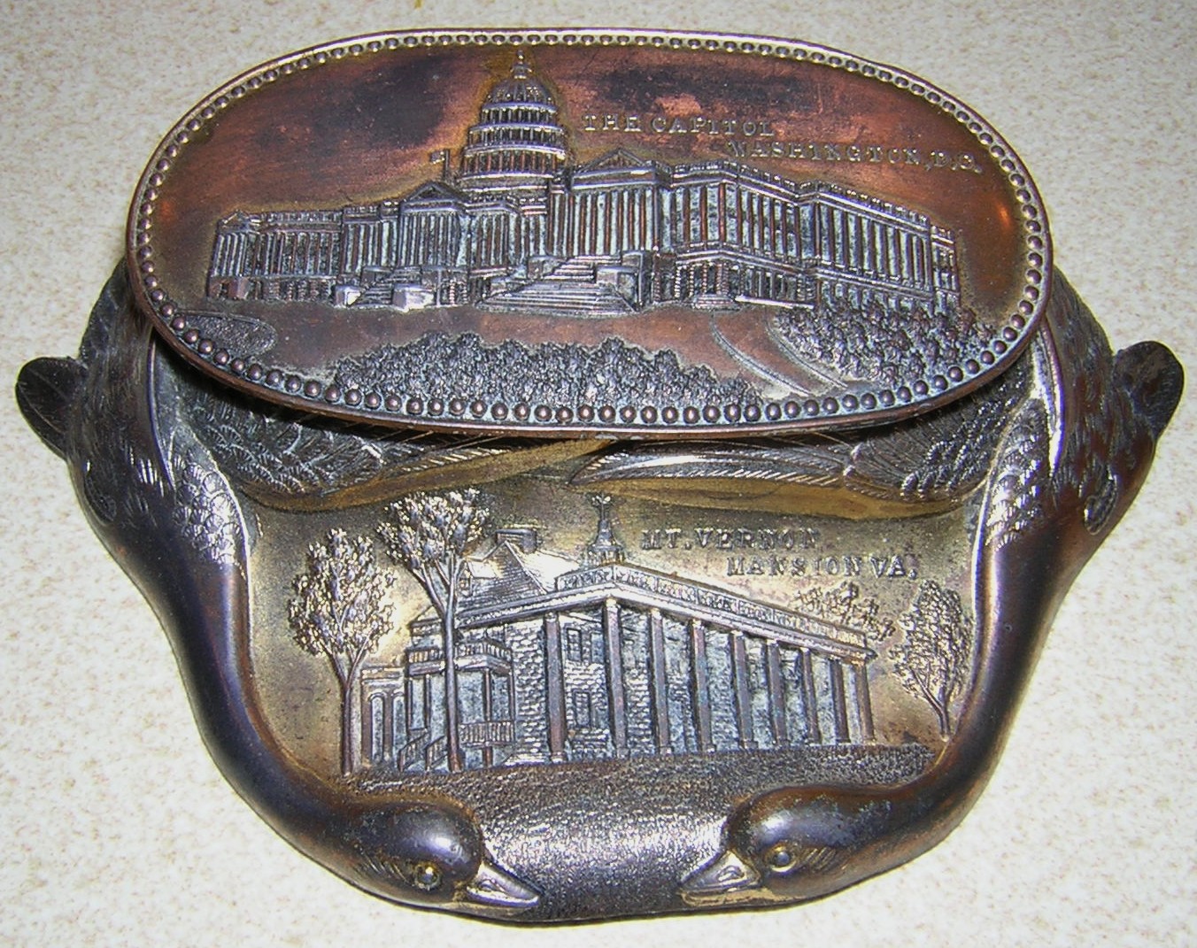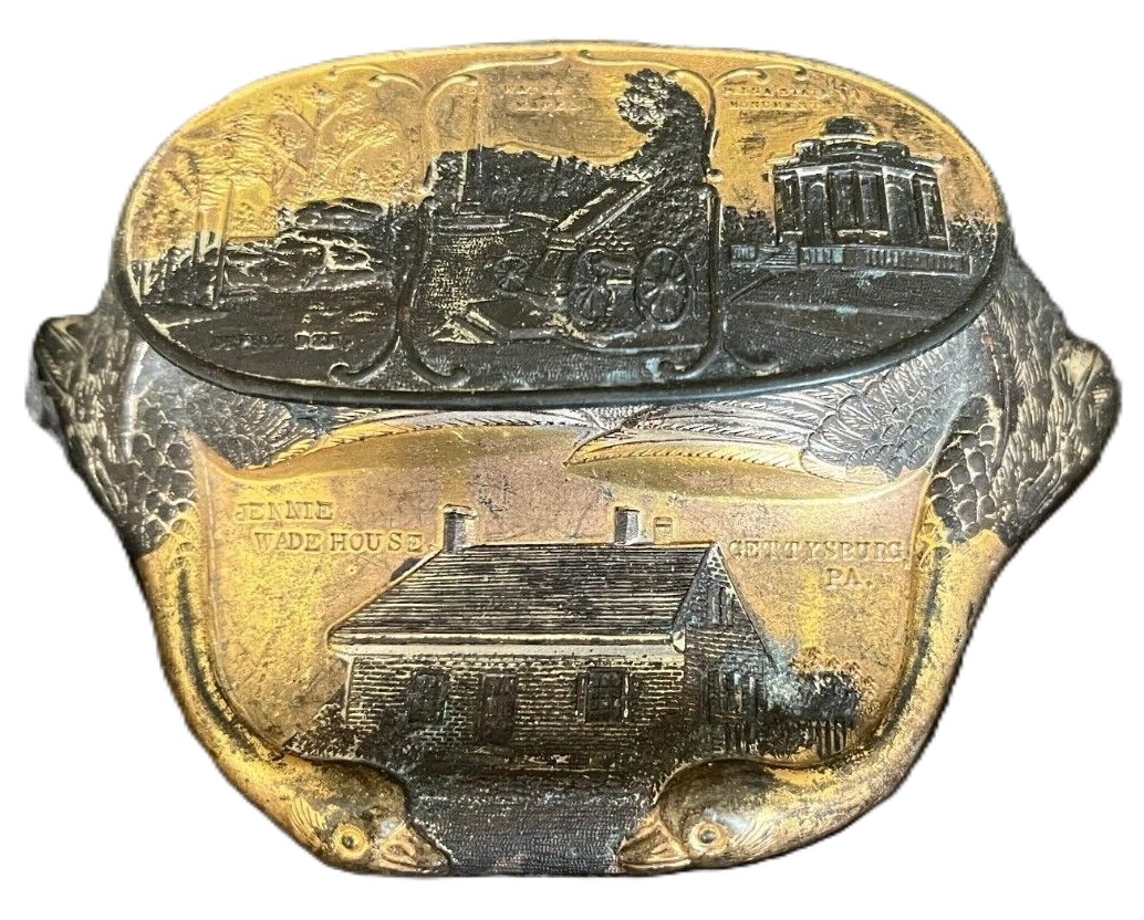 All from the same manufacturer, these cast white metal inkstands feature relief decorations of tourist attractions, with a pair of geese necks forming the base. Pictured are samples from Ontario Canada, Niagara Falls, Washington DC, New York City, Gettysburg, and Atlantic City.