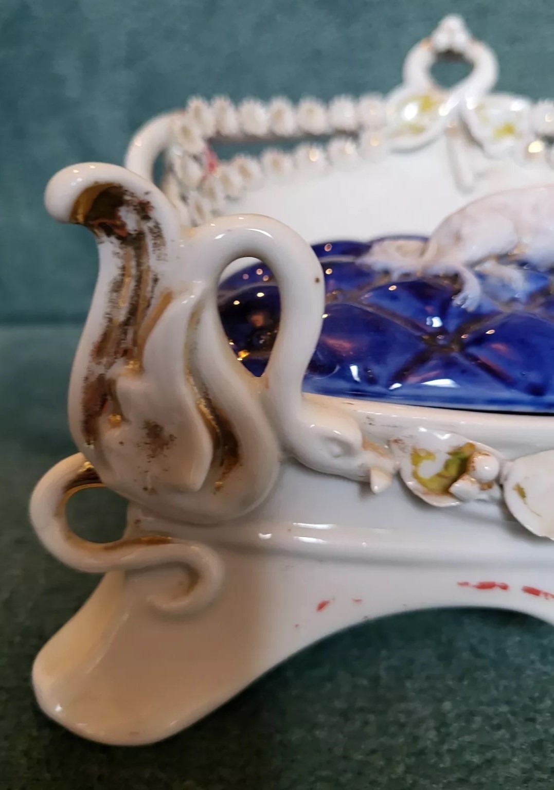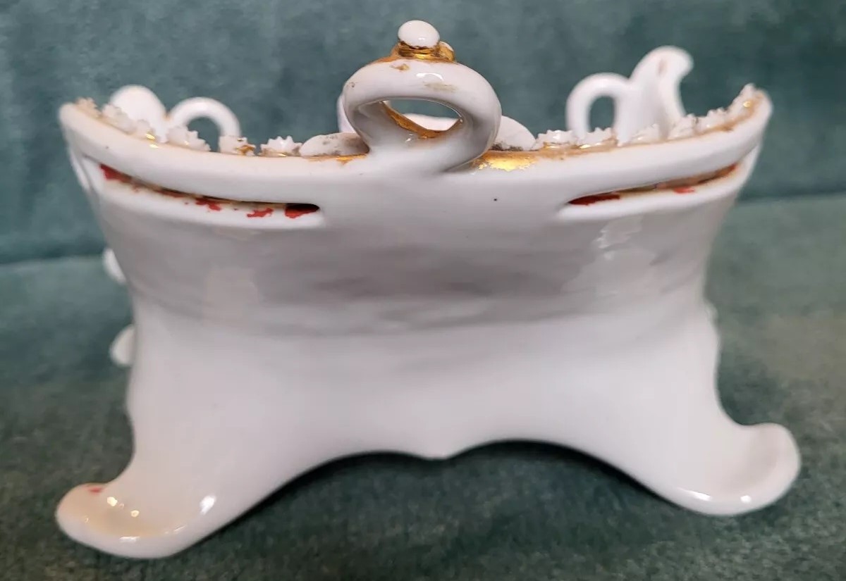 This porcelain inkstand features a King Charles Spaniel lying on a cushioned couch or settee. The dog and the cushion are designed to be removable, revealing an inkwell and a sander beneath them. The ends of the couch are adorned with snake-like creatures, likely inspired by classical or baroque styles. The number “25” in impressed on the underside.