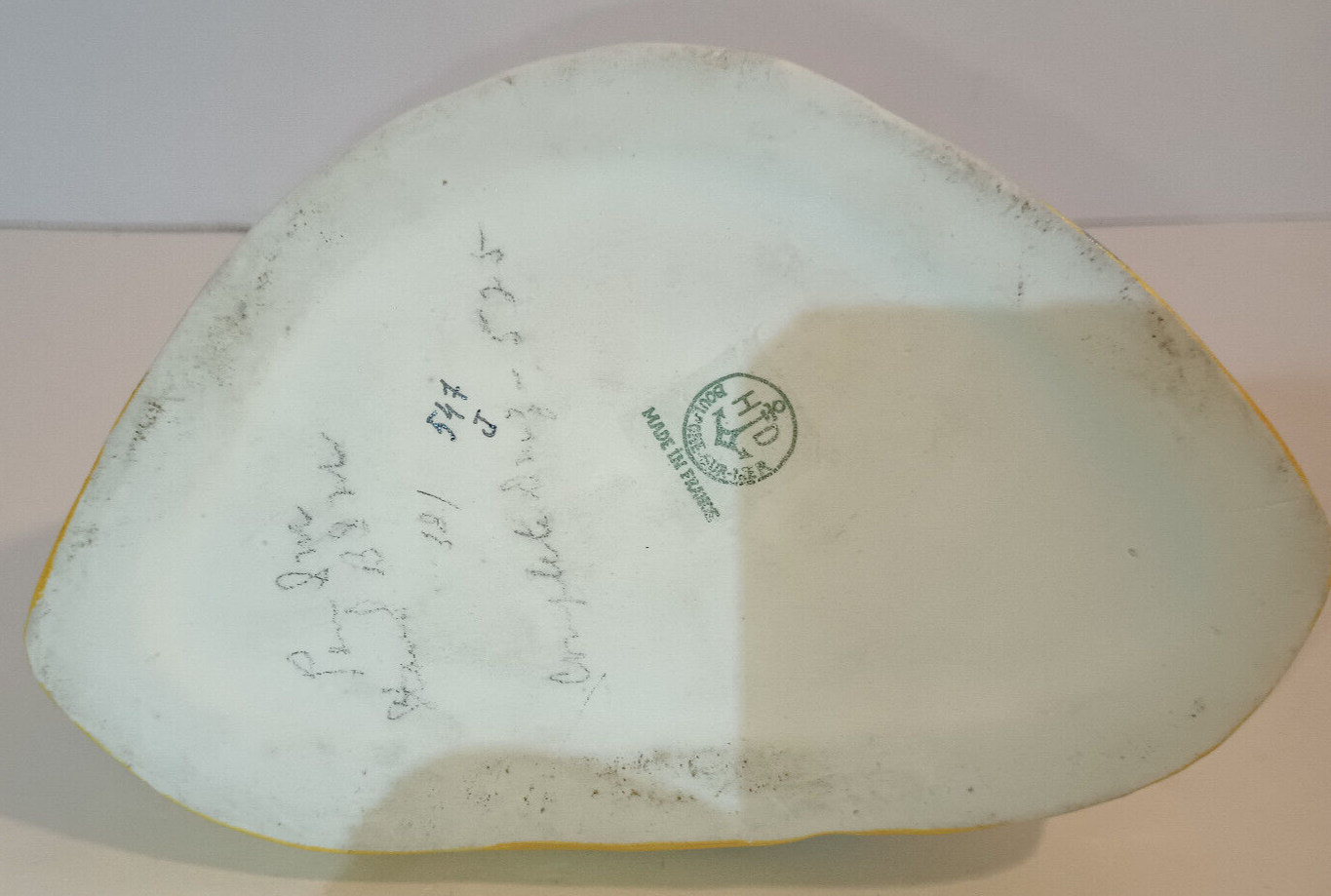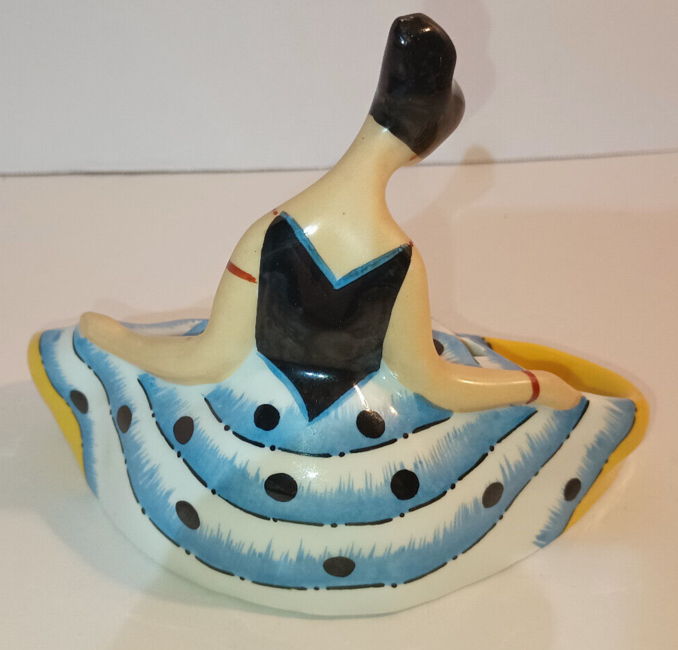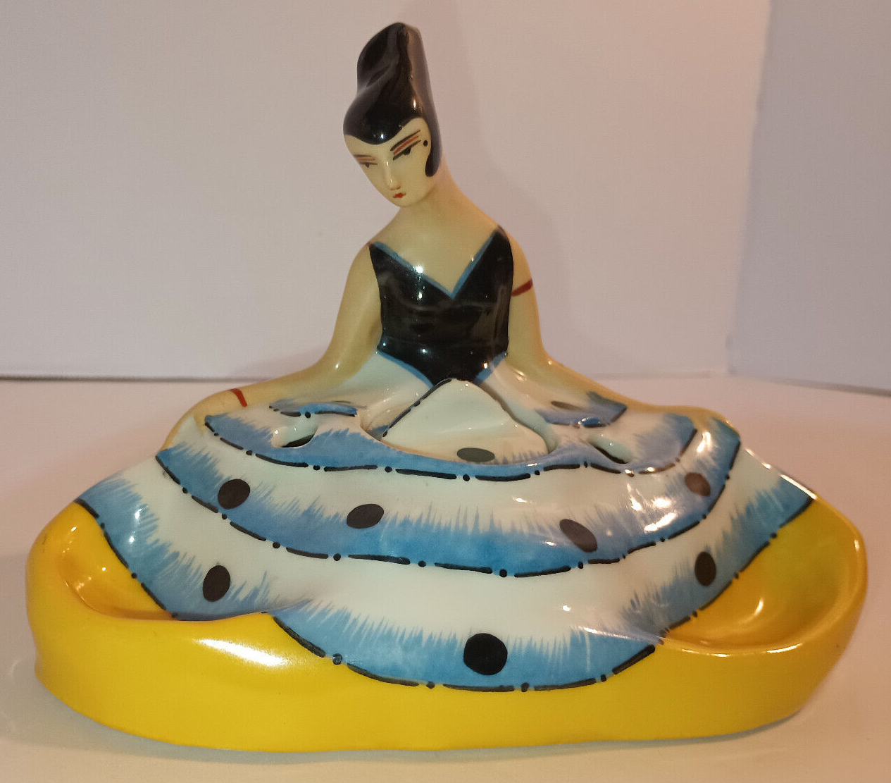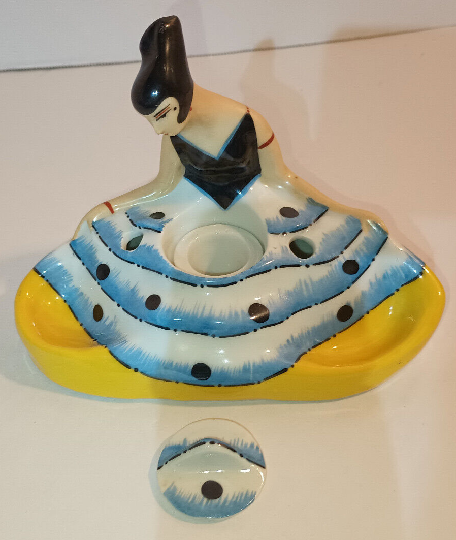 A Spanish lady sitting with her flamenco dress spread houses an inkwell. Two holes for pens are part of Henri Delcourt’s design. The piece has Delcourt’s “Boulogne Sur Mer” stamp.