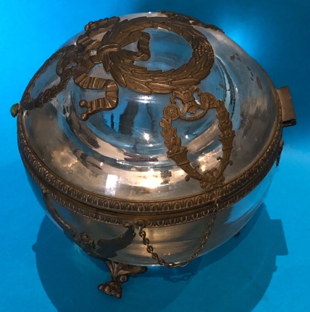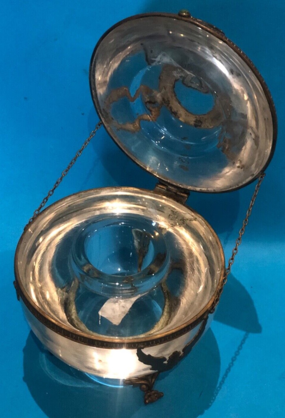 This globe-shaped glass inkwell features a detailed overlay of bronze forming a wreath with ribbons, a crest, and torches. It rests on three bronze feet. The top half is hinged and, when opened, is attached to the bronze rim around the base with a delicate chain to keep the lid in place. A small green polished stone serves as a grip to open the lid.