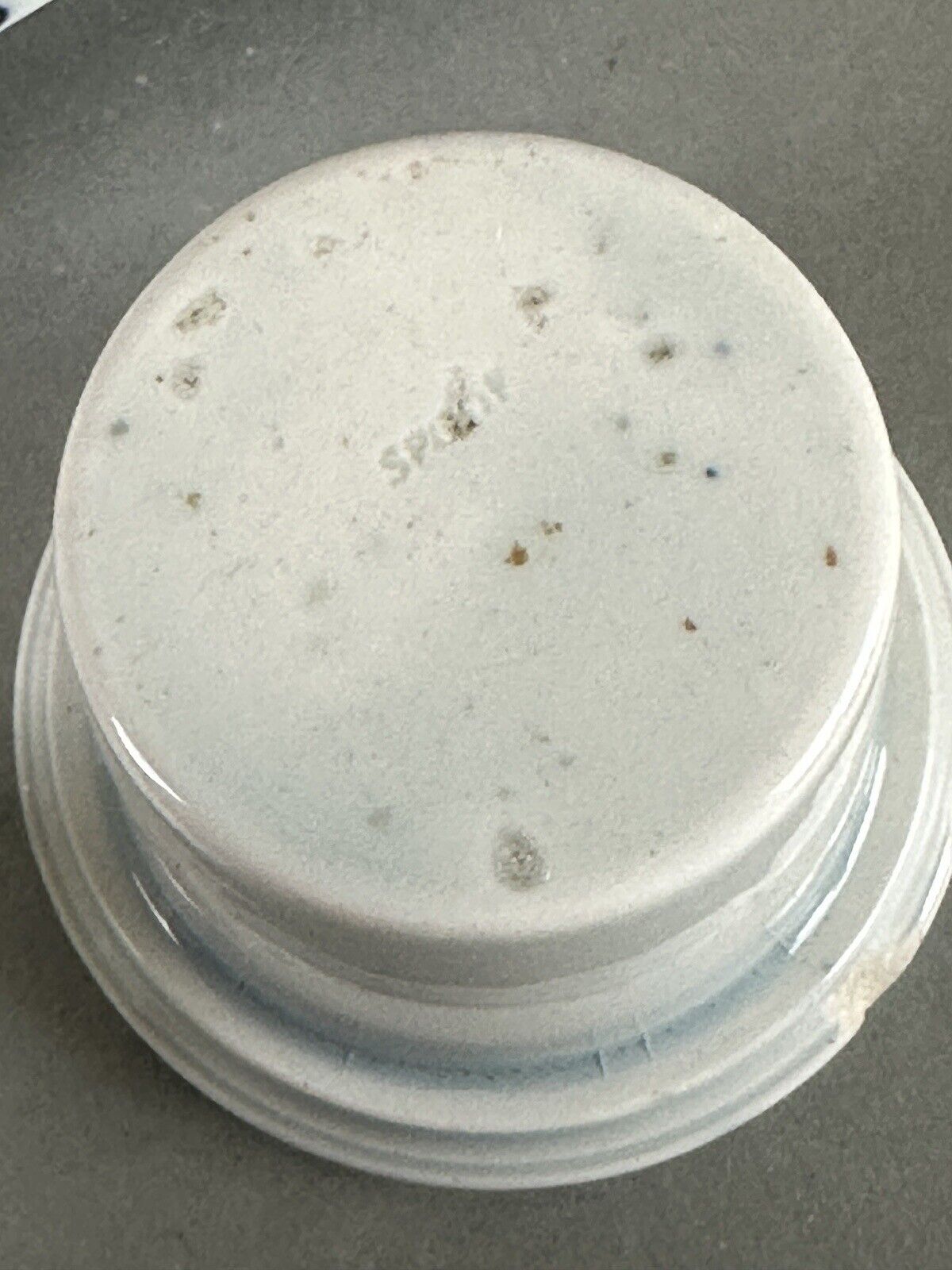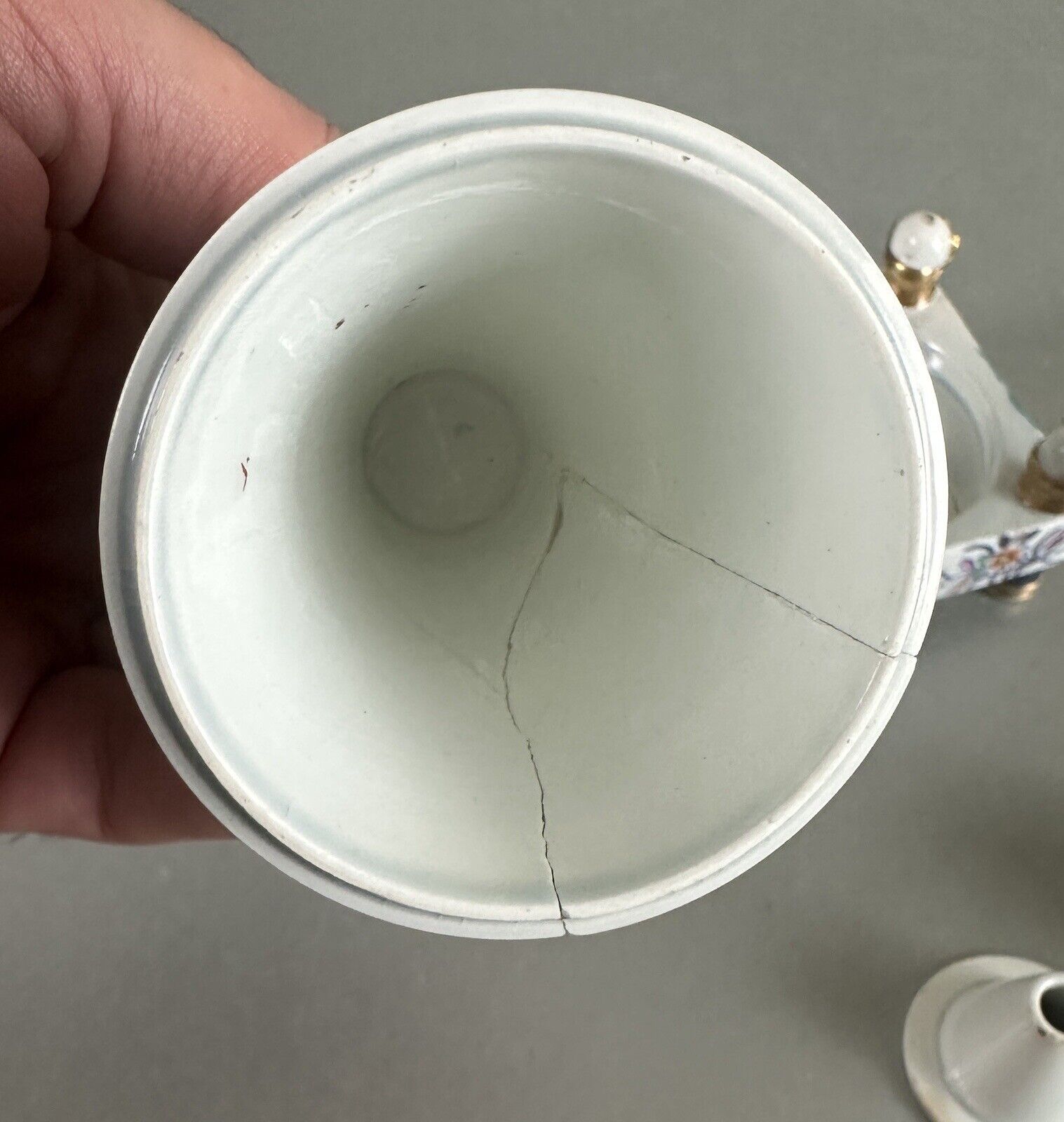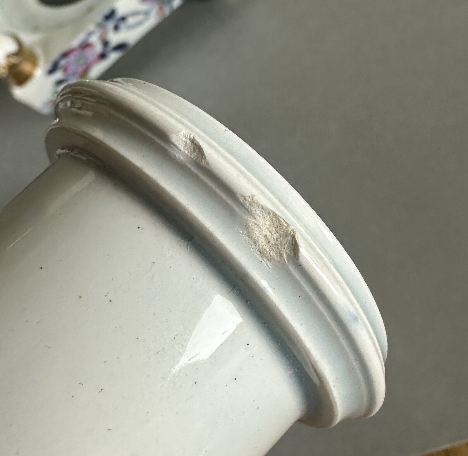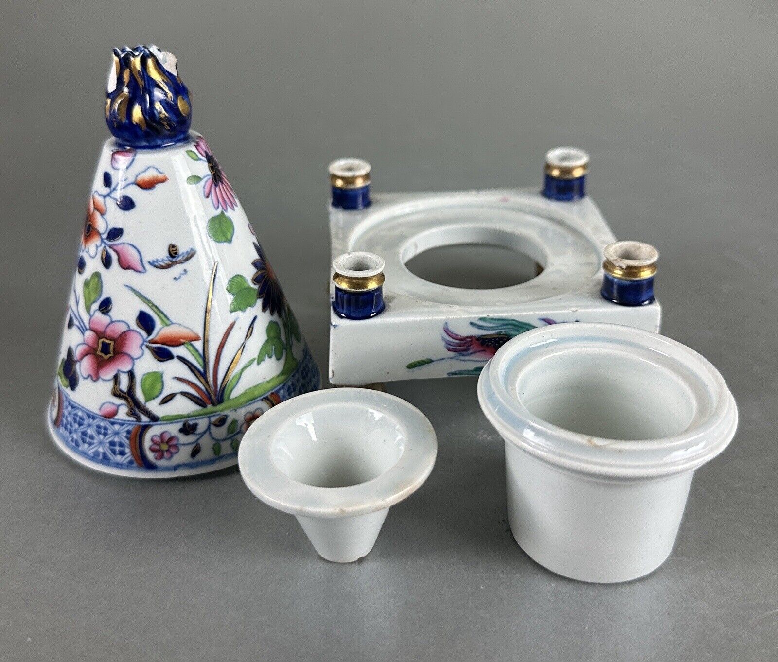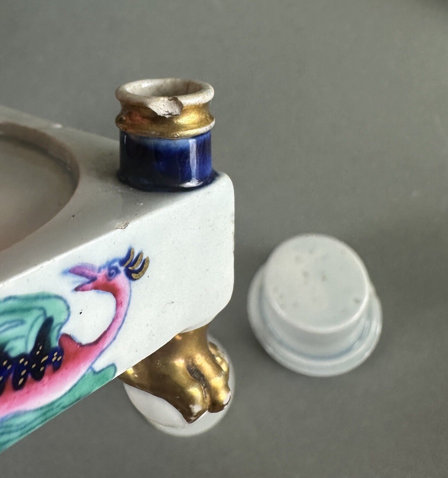 The chimney has a section that was repaired and a chipped tip. There is a small chip to one of the quill holders and small chips to the rim of the inkpot. Firing split to the base from manufacture.