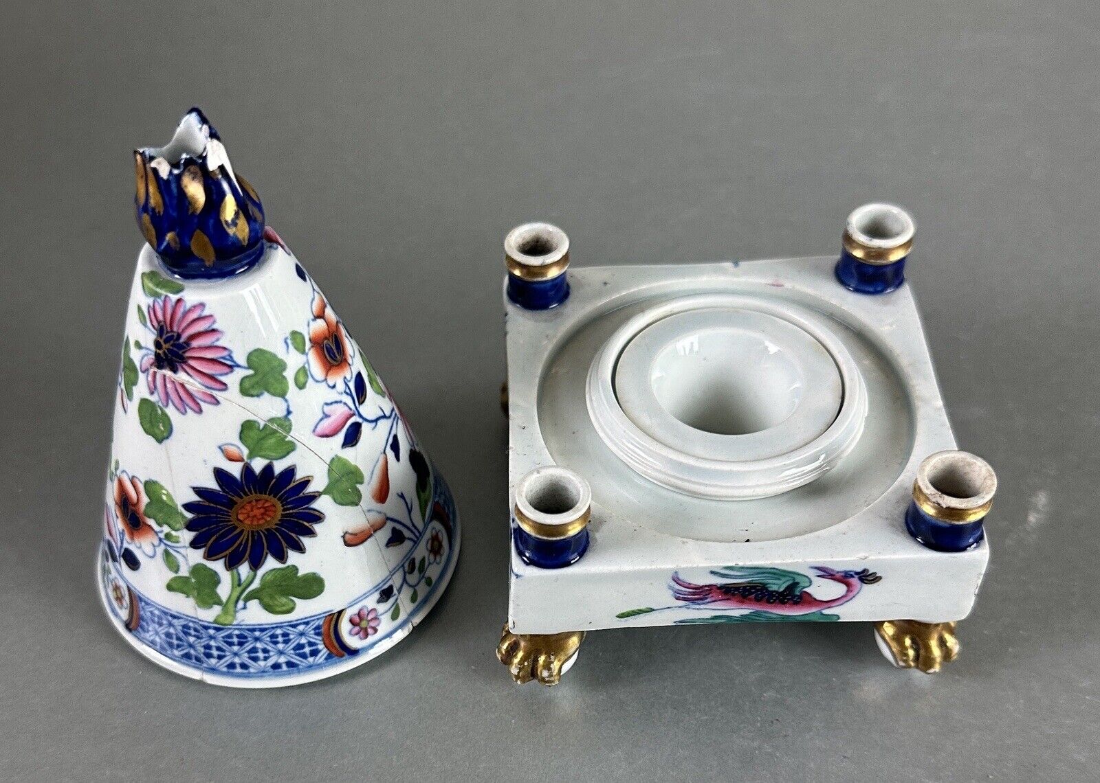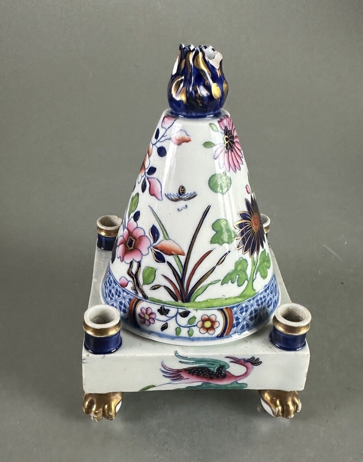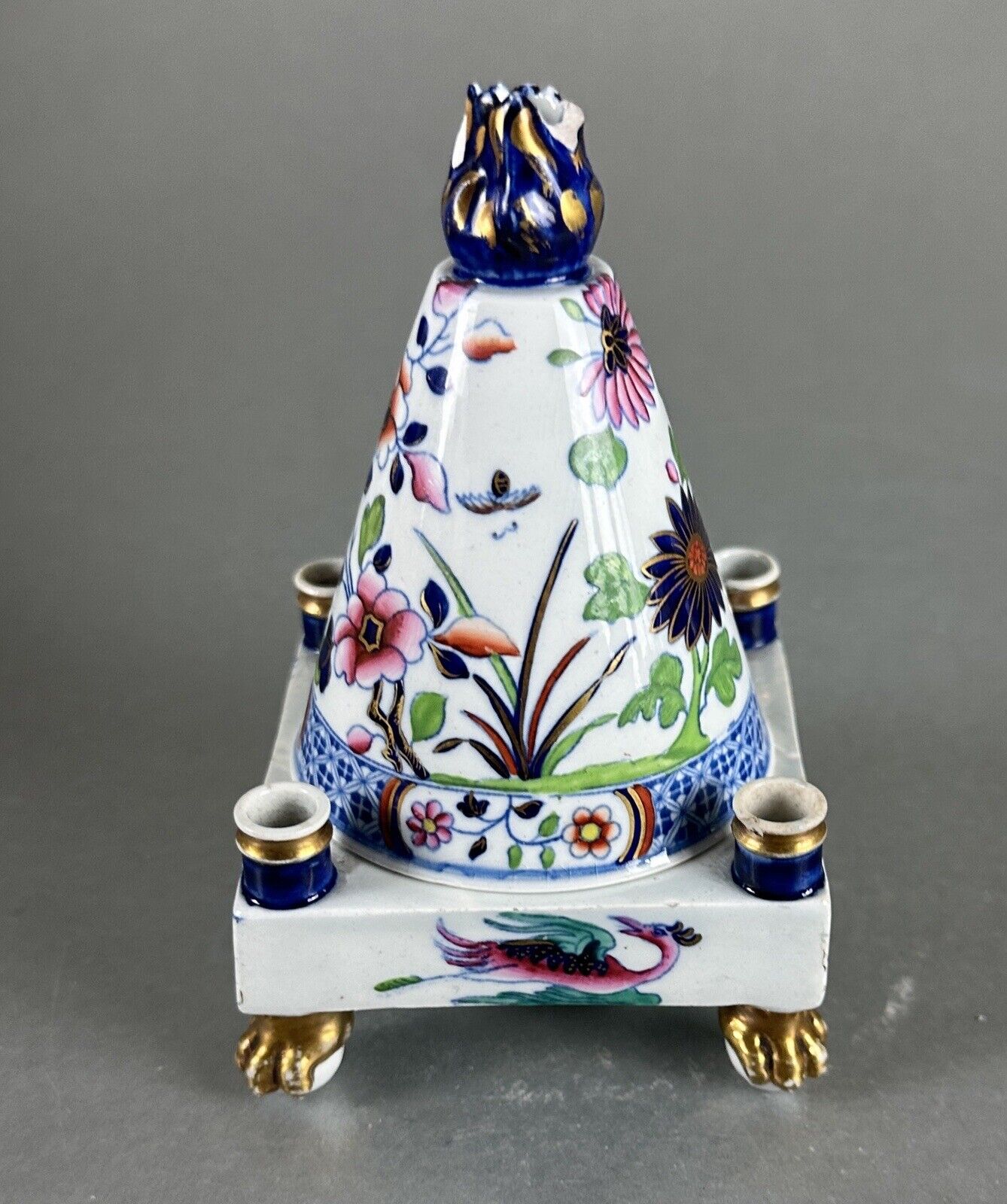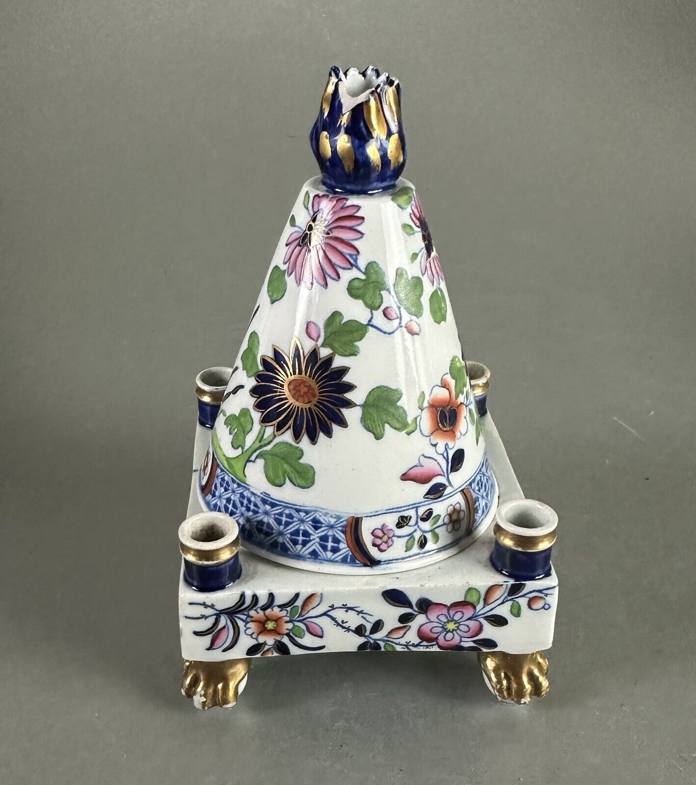 An unusual early 19th century Spode pearlware inkwell with floral decoration and ball & claw feet, in a shape more commonly seen as a pastille burner. Here they have used the same conical shape for an inkwell, the chimney closed and with its inkpot and insert. Each corner has a quill holder. There is a small, impressed Spode mark to the base and a tiny Spode mark to the underside of the inkpot.