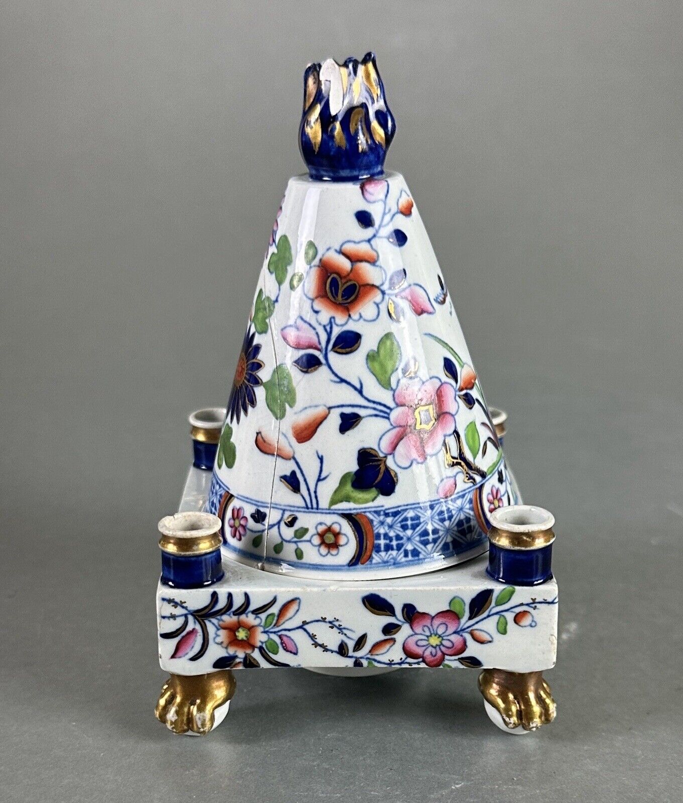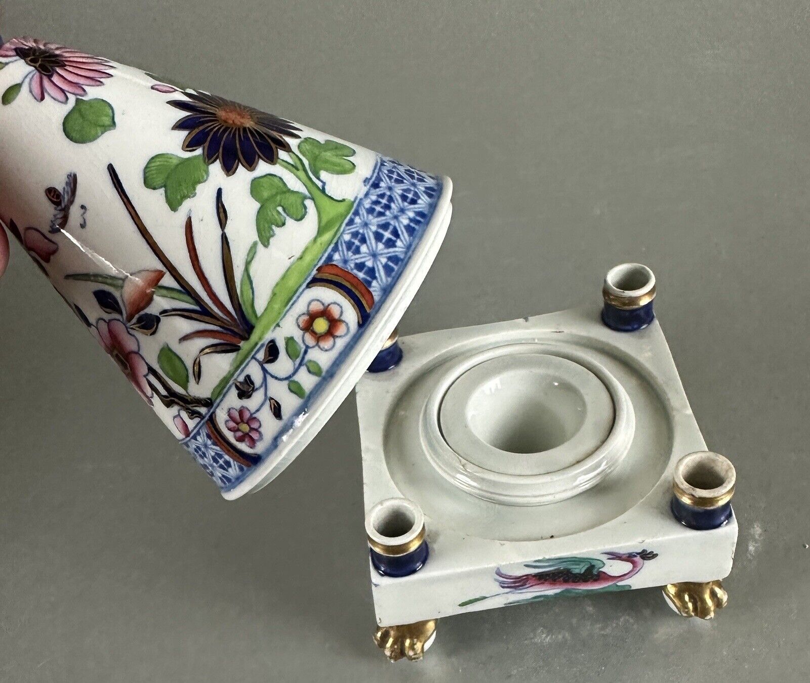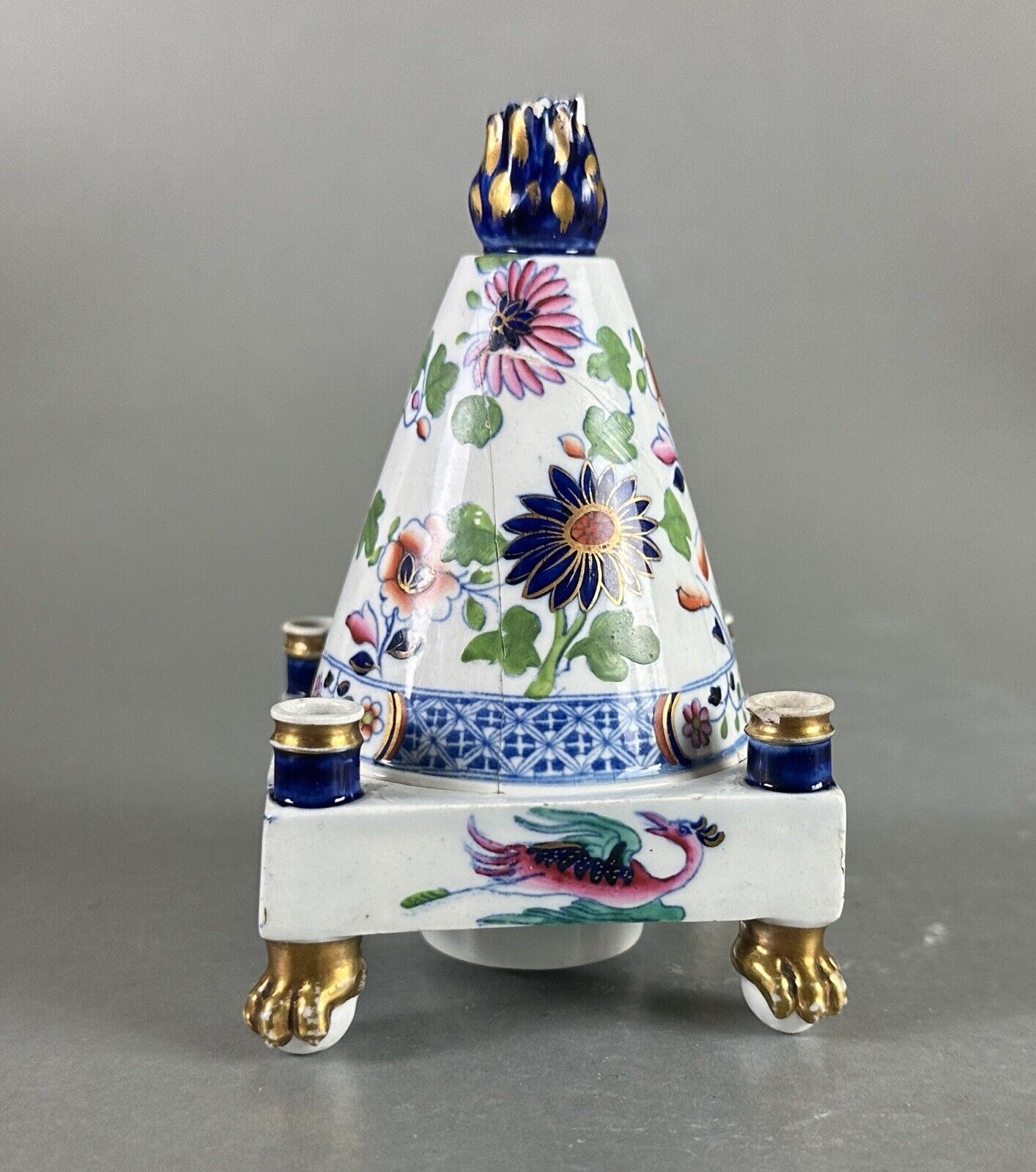 An unusual early 19th century Spode pearlware inkwell with floral decoration and ball & claw feet, in a shape more commonly seen as a pastille burner. Here they have used the same conical shape for an inkwell, the chimney closed and with its inkpot and insert. Each corner has a quill holder. There is a small, impressed Spode mark to the base and a tiny Spode mark to the underside of the inkpot.