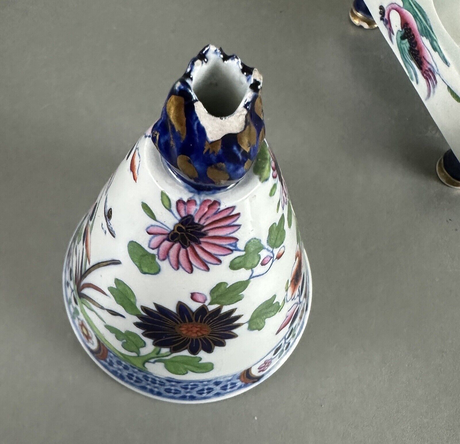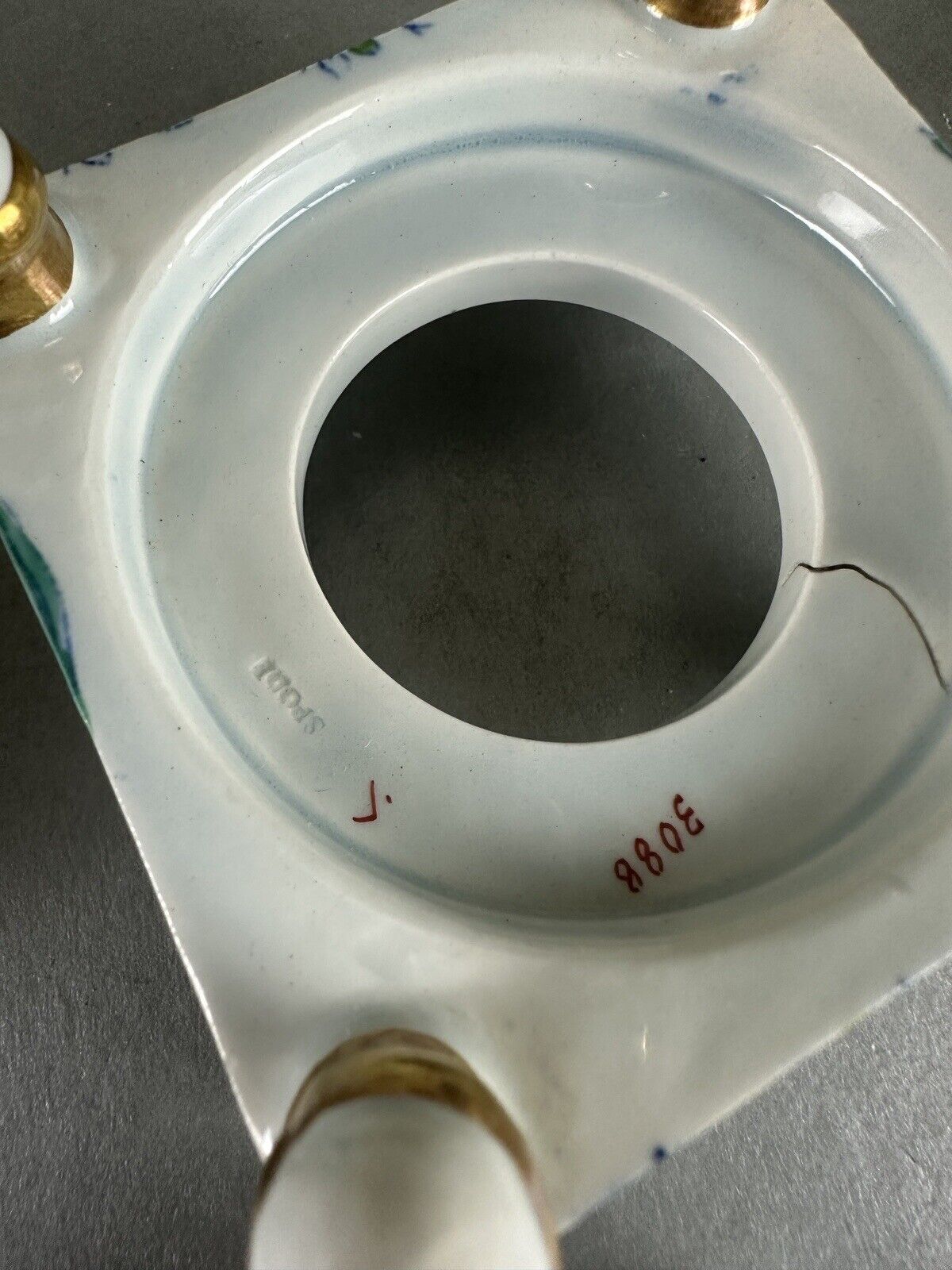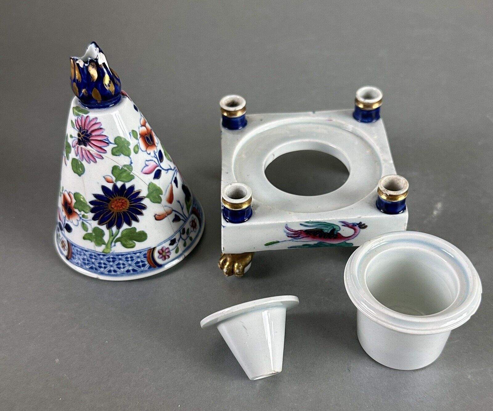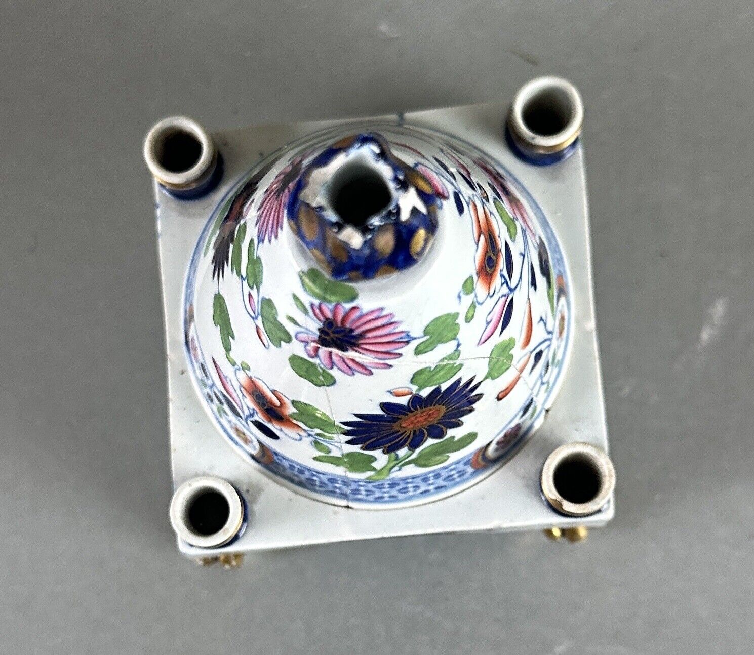 An unusual early 19th century Spode pearlware inkwell with floral decoration and ball & claw feet, in a shape more commonly seen as a pastille burner. Here they have used the same conical shape for an inkwell, the chimney closed and with its inkpot and insert. Each corner has a quill holder. There is a small, impressed Spode mark to the base and a tiny Spode mark to the underside of the inkpot.