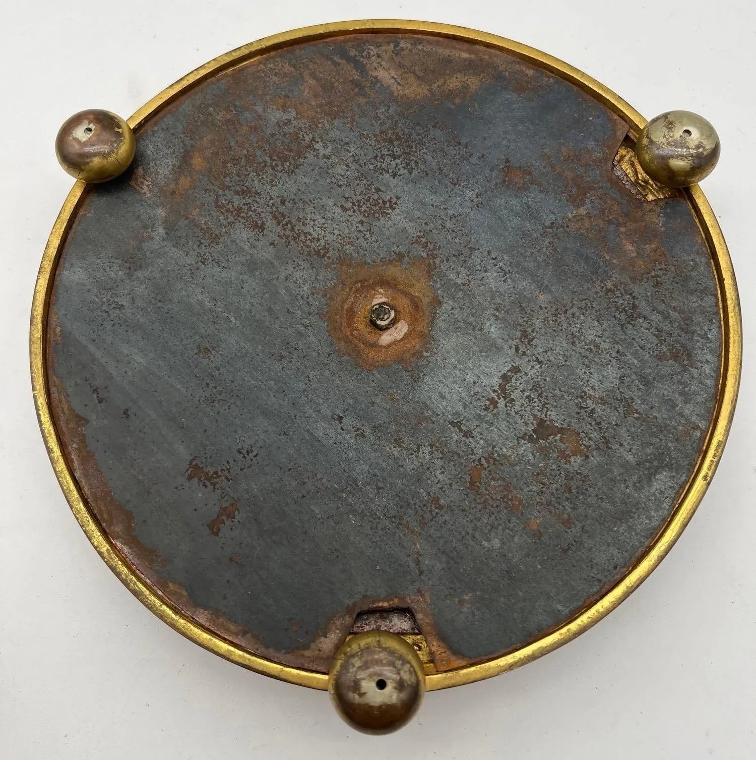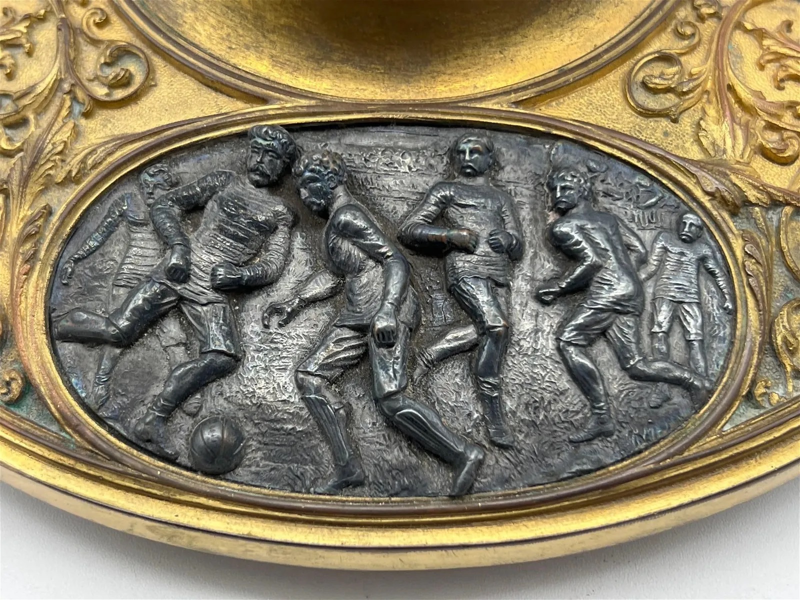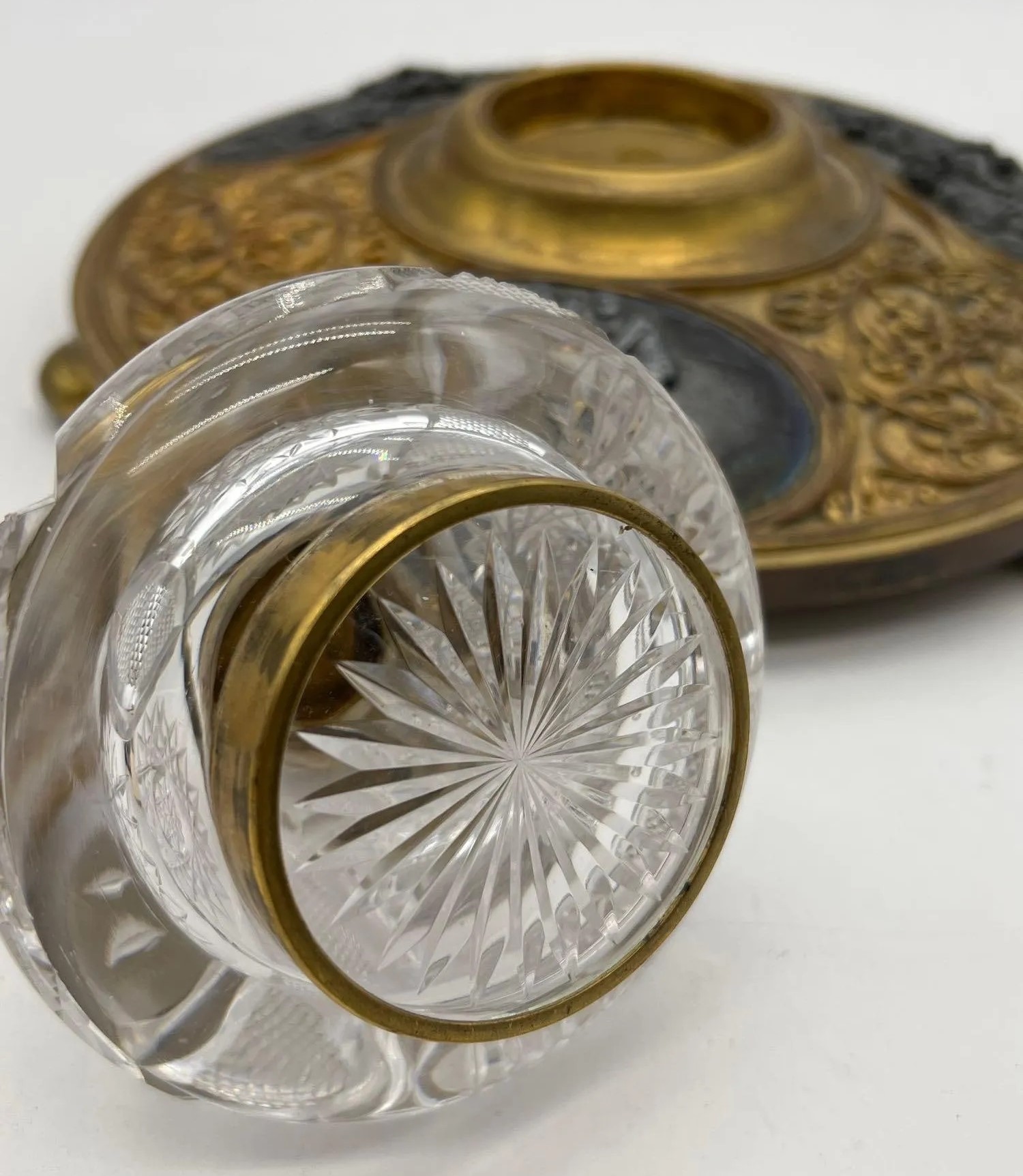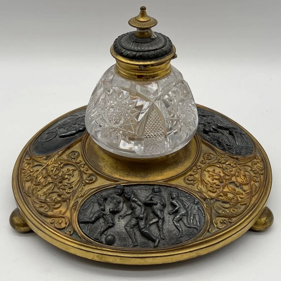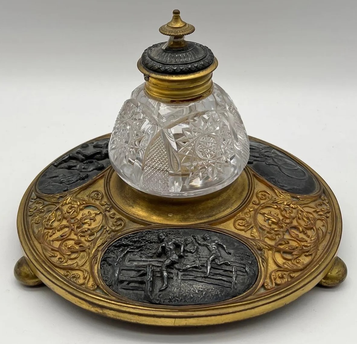 A bronze inkstand featuring a cut glass inkwell with hinged lid on a circular bronze base with foliate design and three inset panels depicting various sporting scenes to include cycling, running, and soccer. Raised on ball feet. Marked “Made in England” on underside.