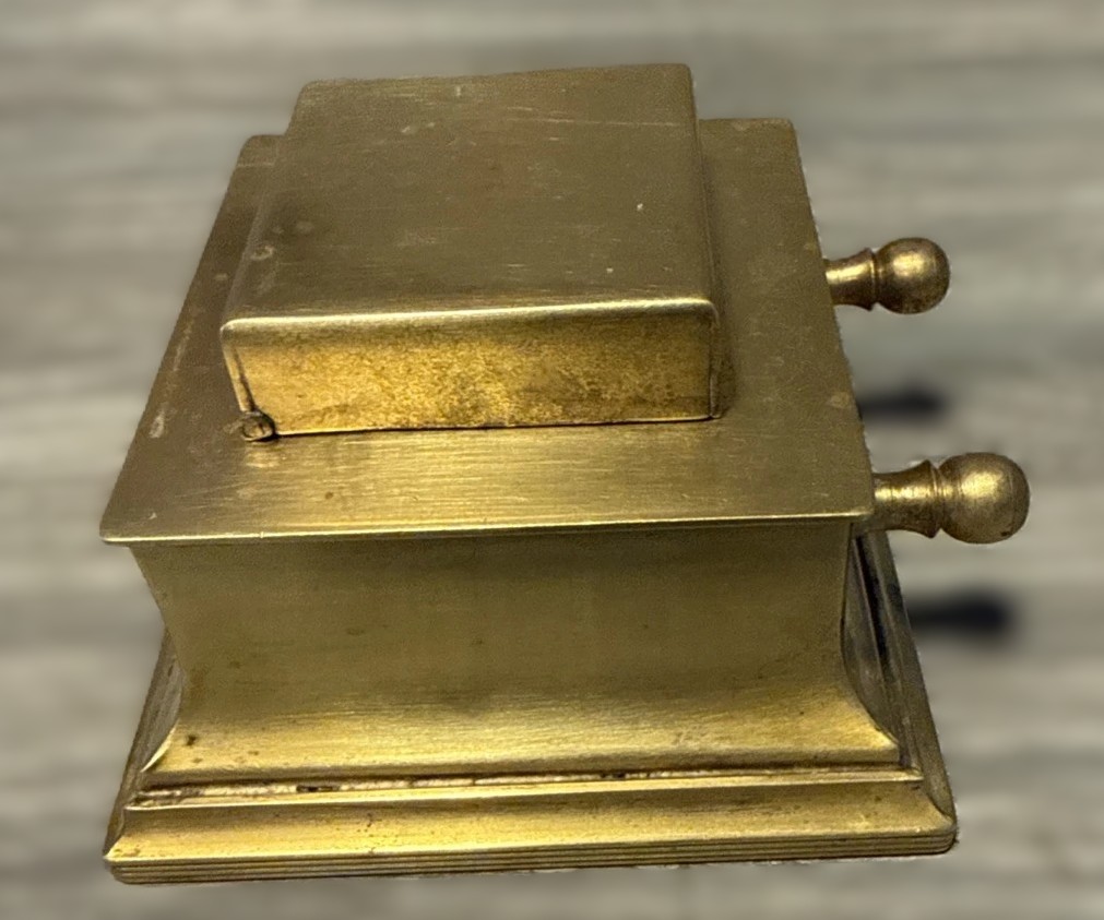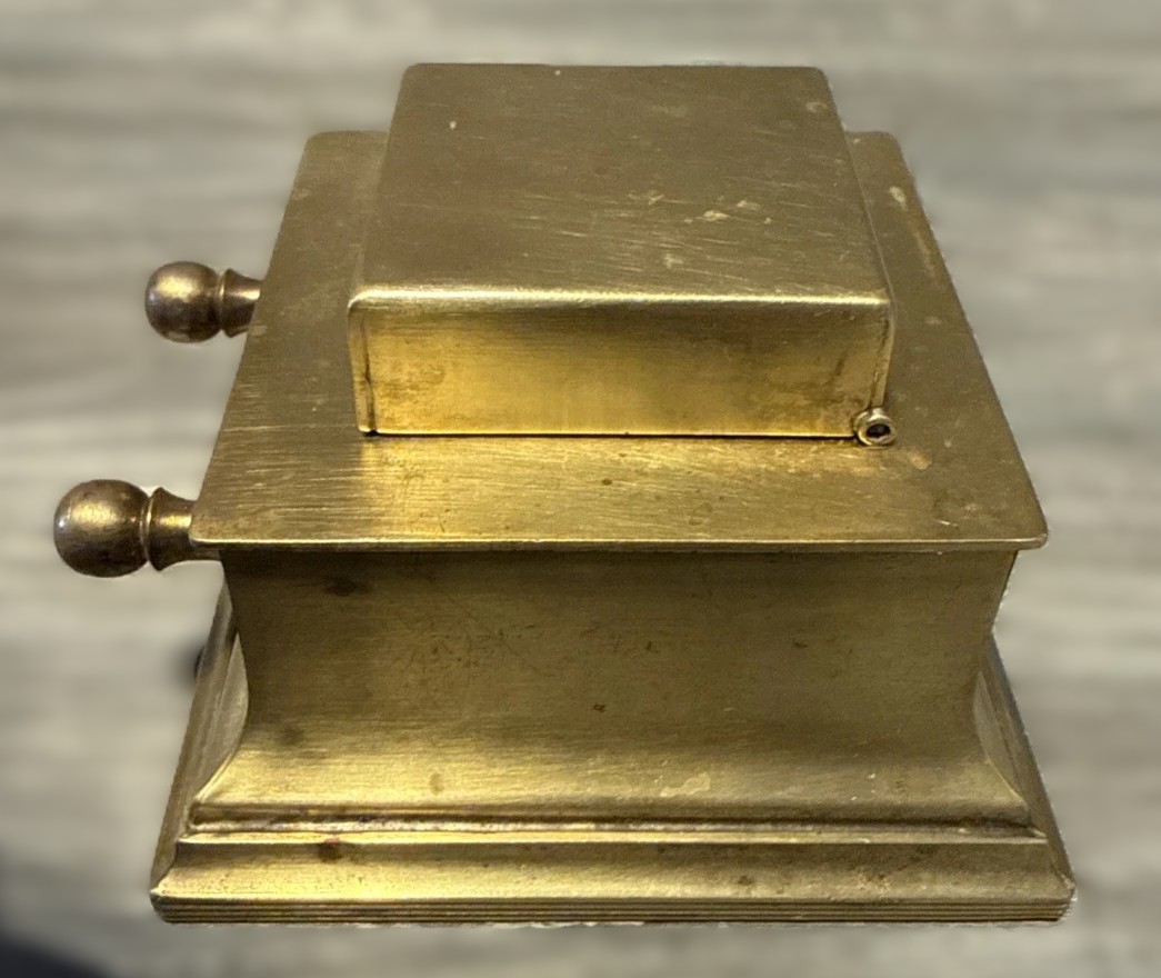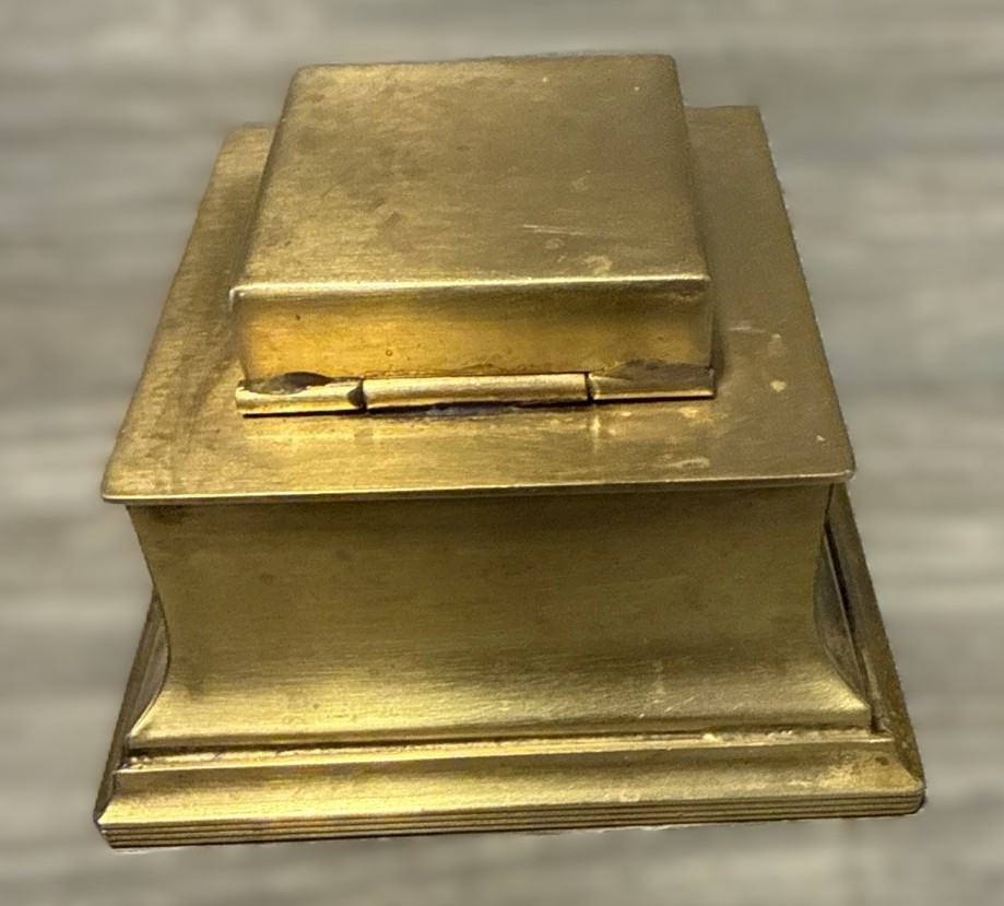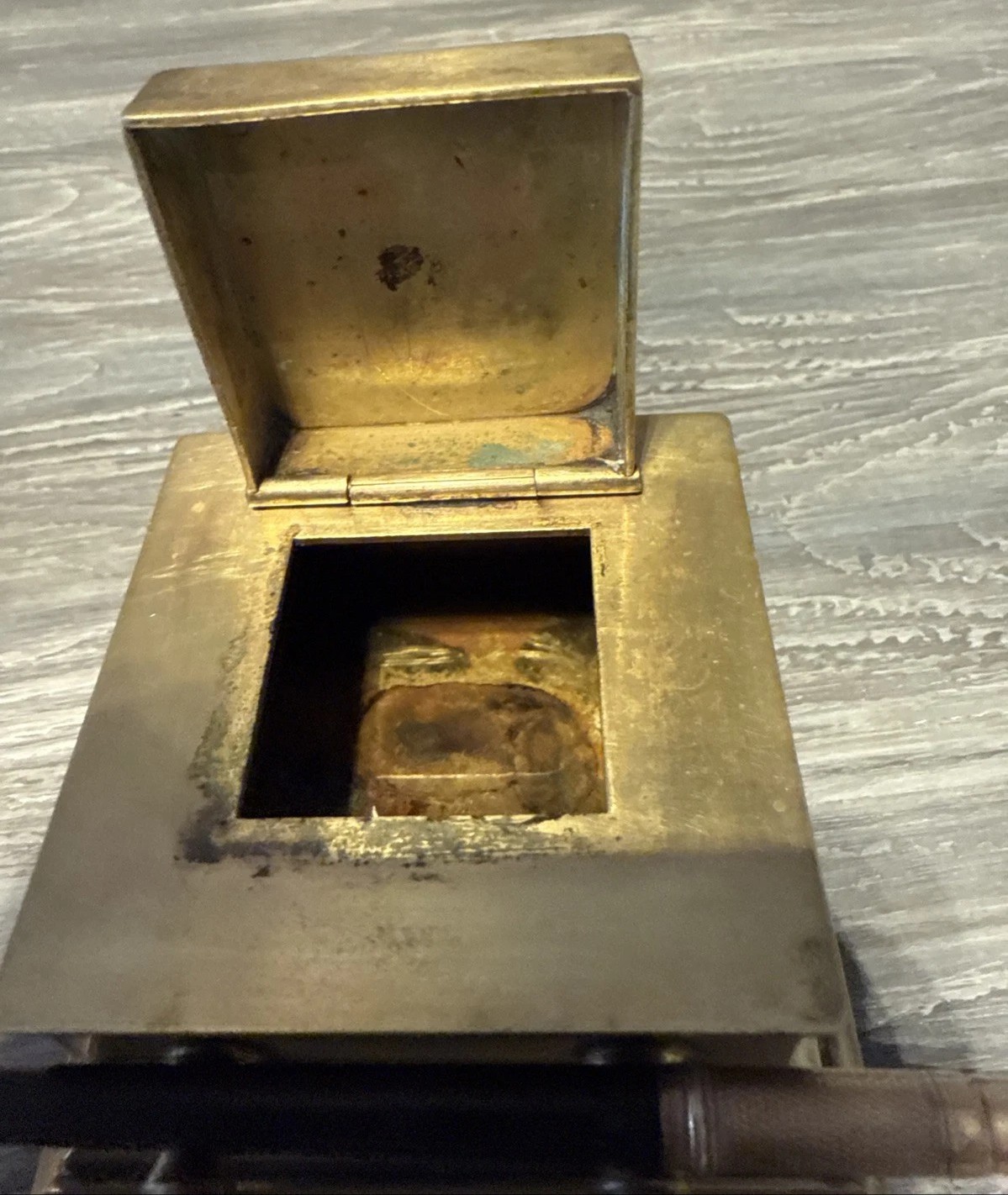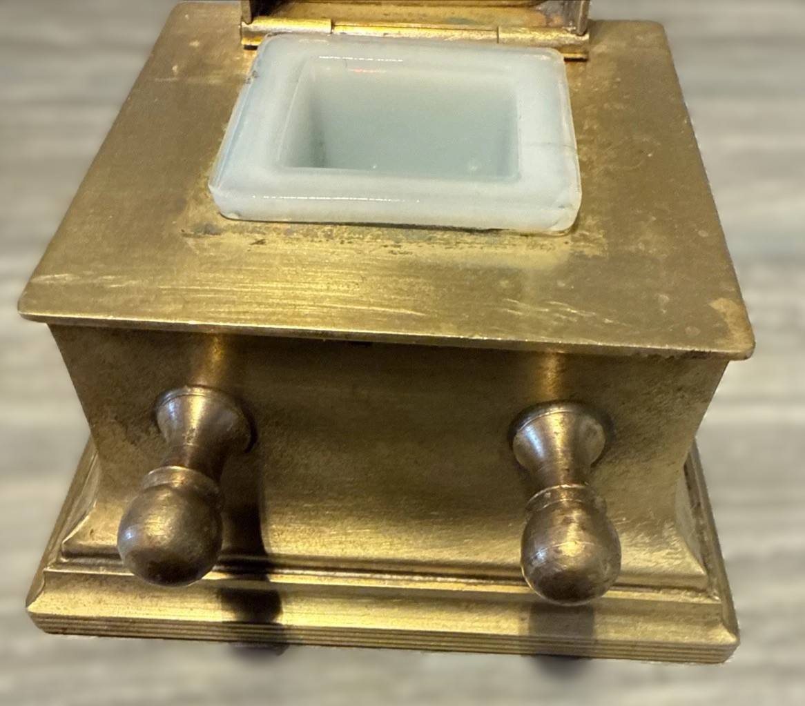 Inside is a square milk glass insert. Square inserts are uncommon; most antique inkwells utilized round inserts because they were easier to manufacture, use, and replace. The inclusion of a fitted square insert suggests a higher level of design intentionality, ensuring the interior vessel perfectly mirrored the exterior “Mission” or “Art Deco” aesthetic.