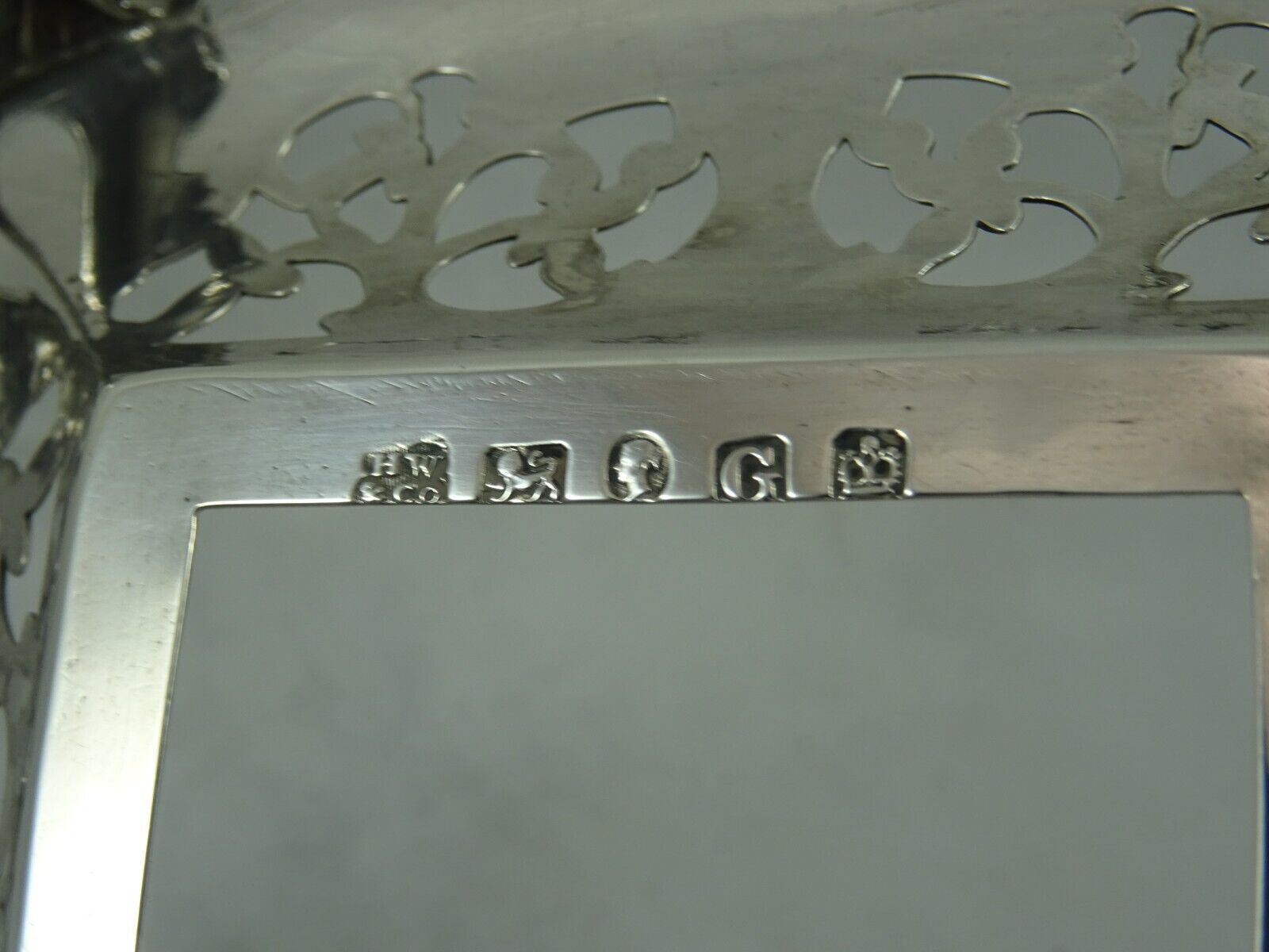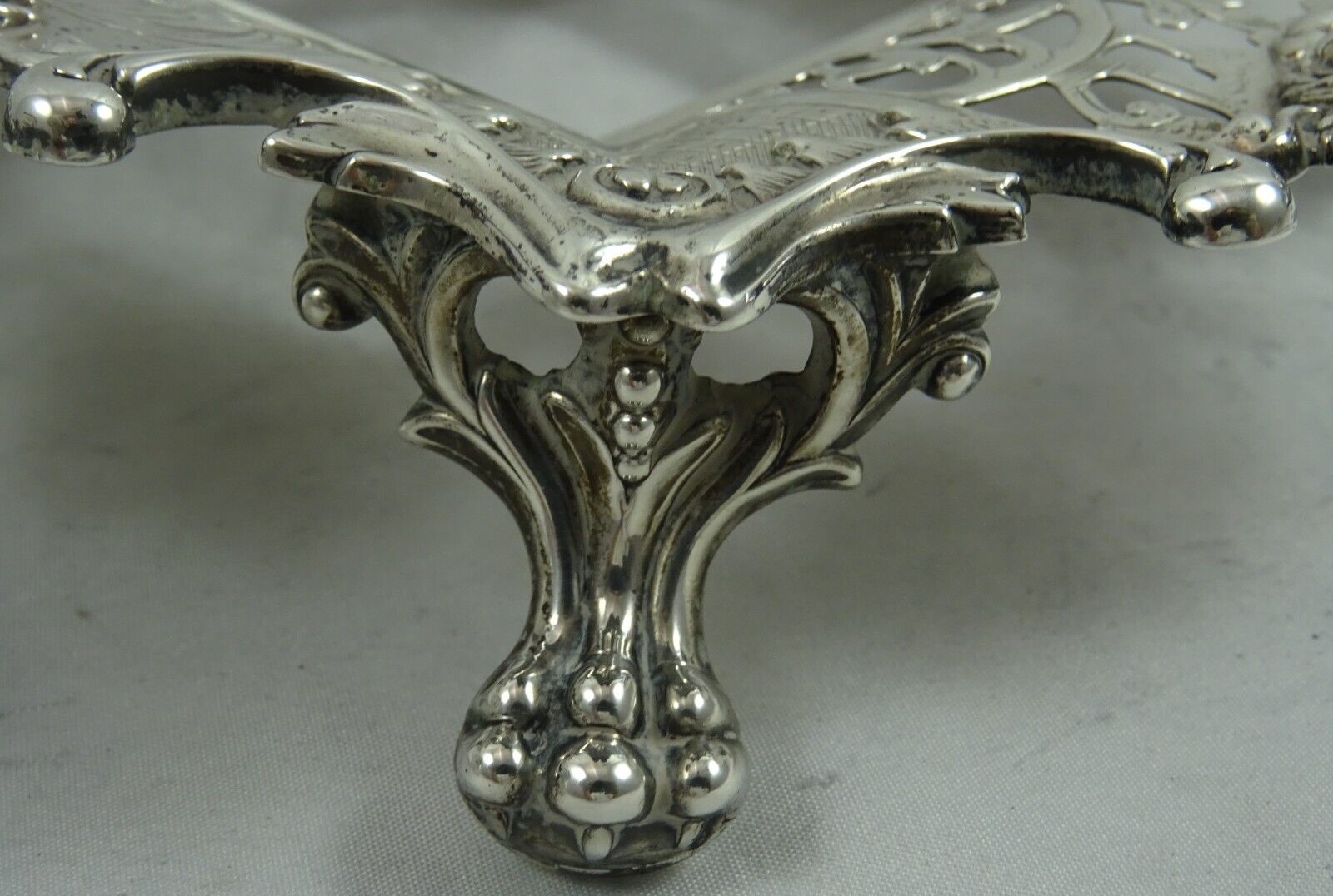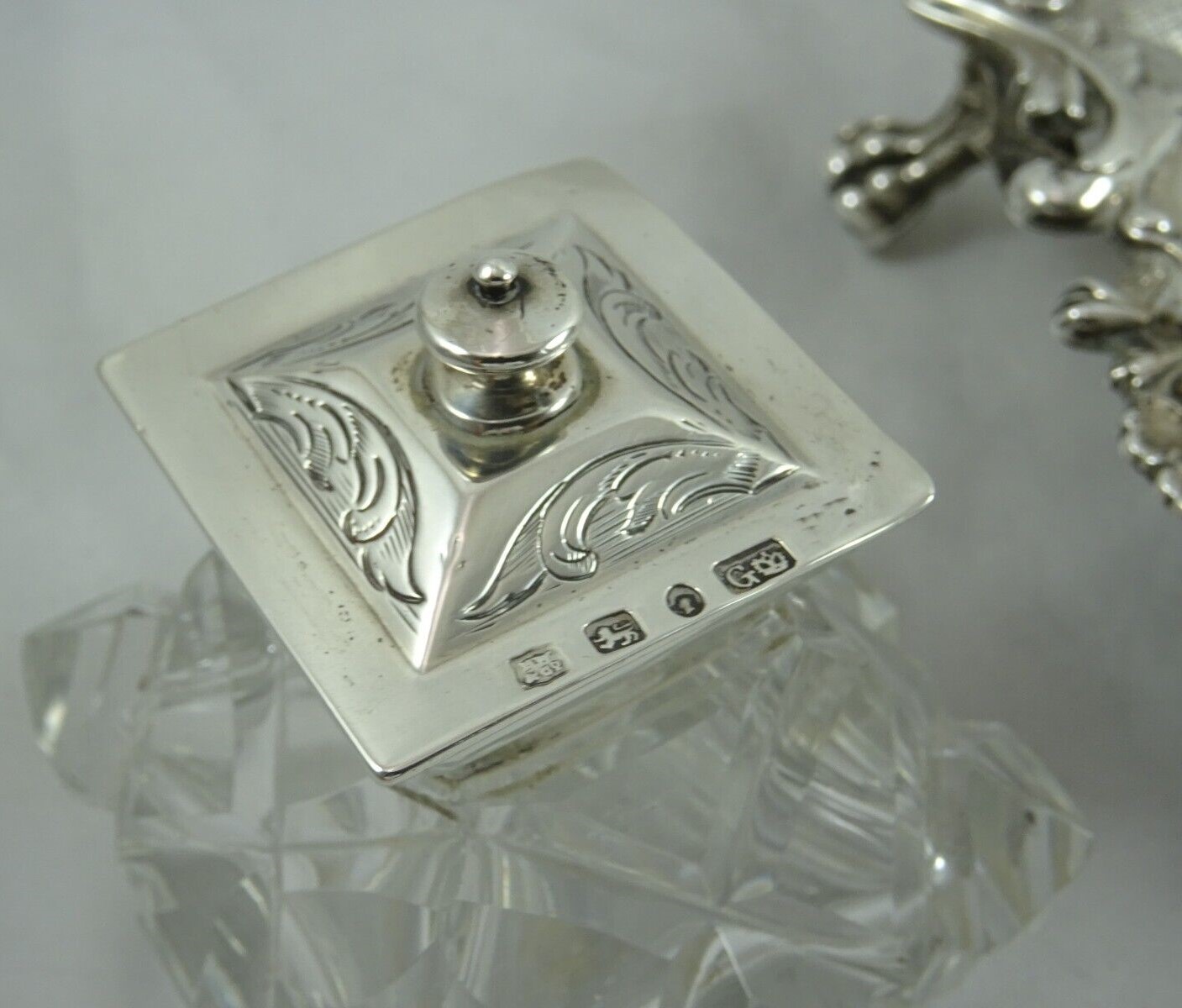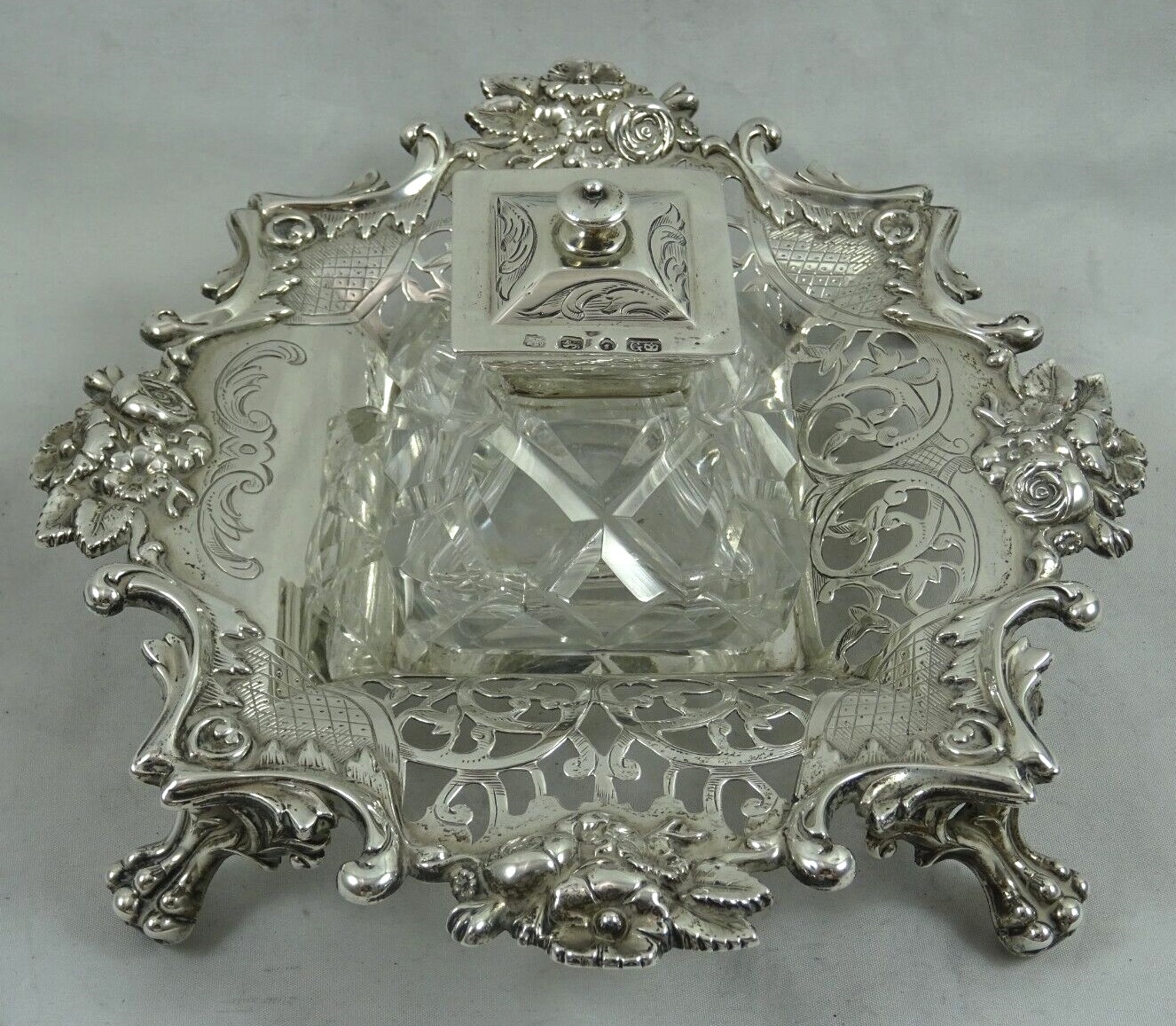 Sterling silver inkstand of square form with pierced and floral designs, scrolling border, and standing on lion paw feet. In the center is a glass inkwell with a matching silver mount and lid. Hallmarked for Henry Wilkinson & Co., Sheffield, 1850.