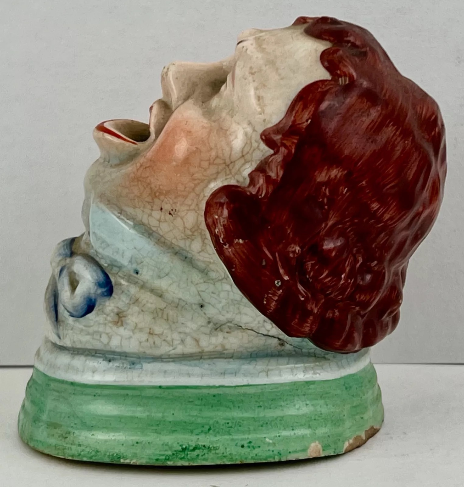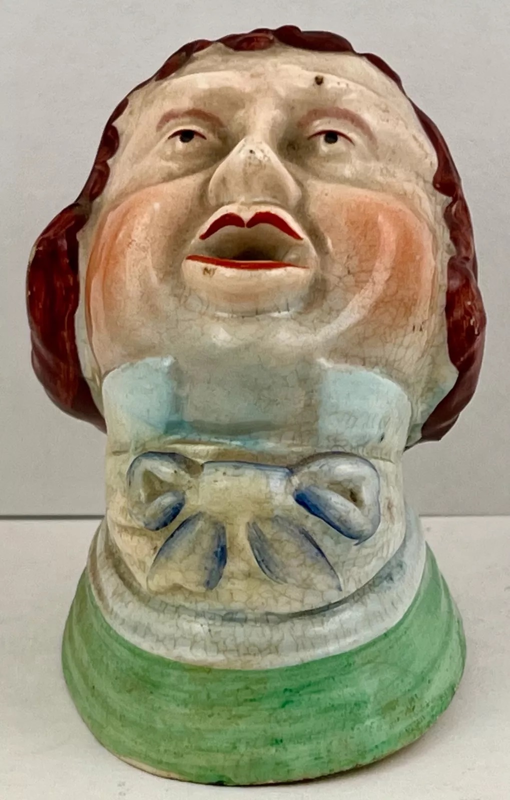 A whimsical inkwell in the form of a man with his mouth wide open – perhaps a singer or orator – ready for a pen to dip in.