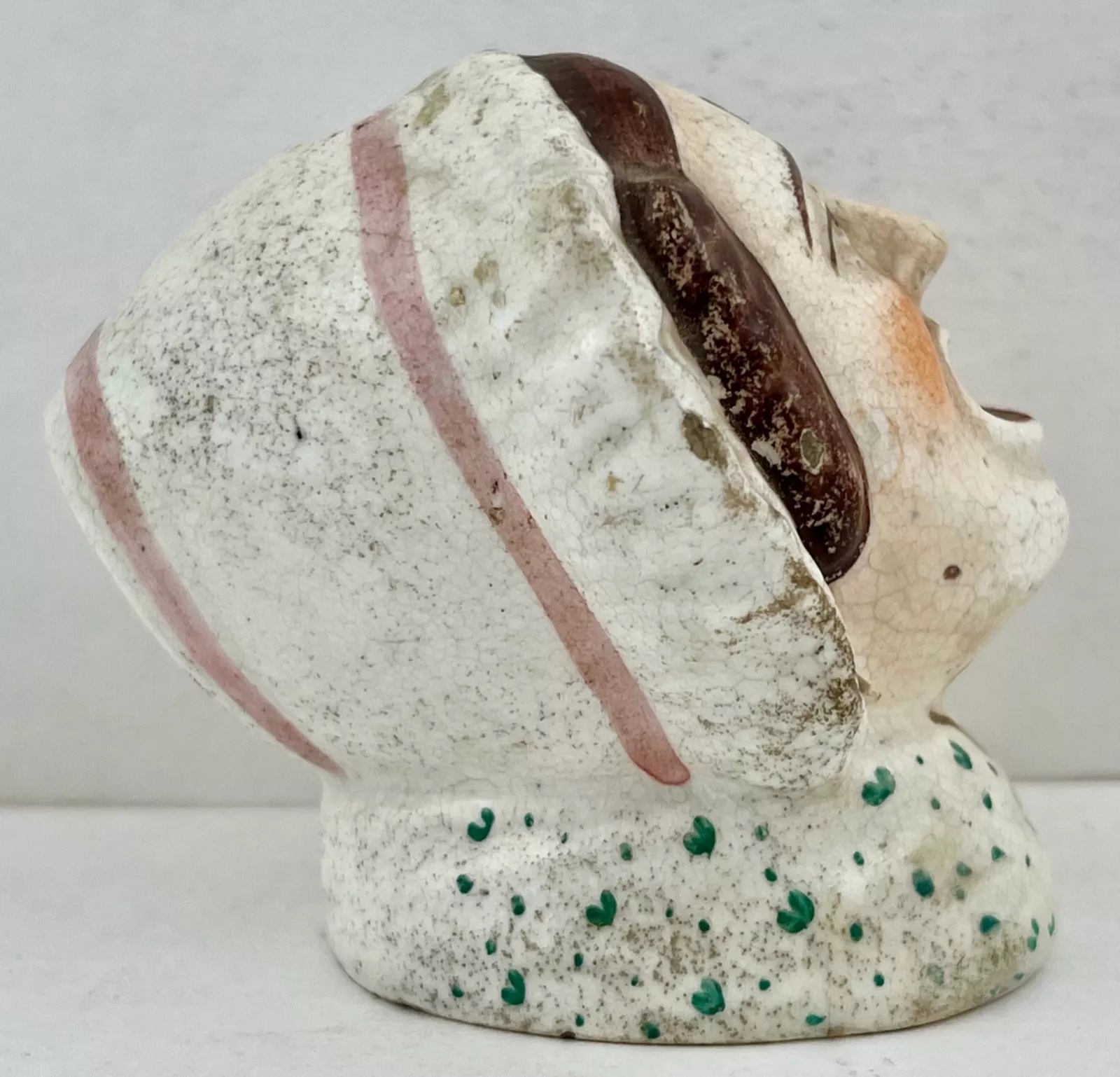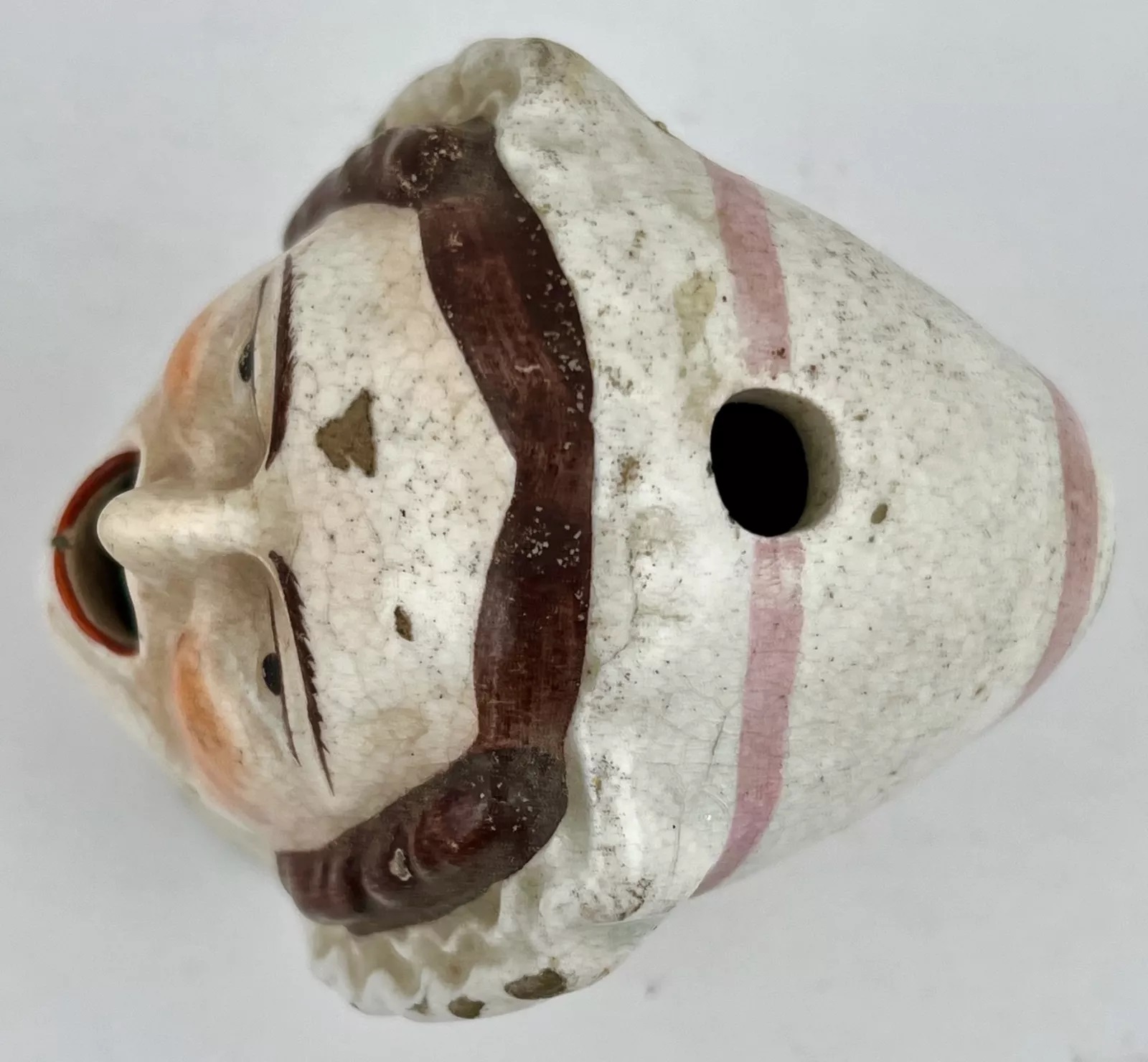 A whimsical inkwell in the form of a woman with her mouth wide open – perhaps she’s screaming – ready for a pen to dip in. There’s a hole in her bonnet in which to rest a pen.