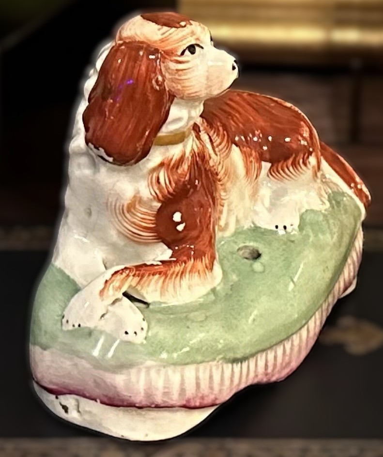This Victorian-era Staffordshire spaniel dates from the mid-19th century (circa 1850–1875).