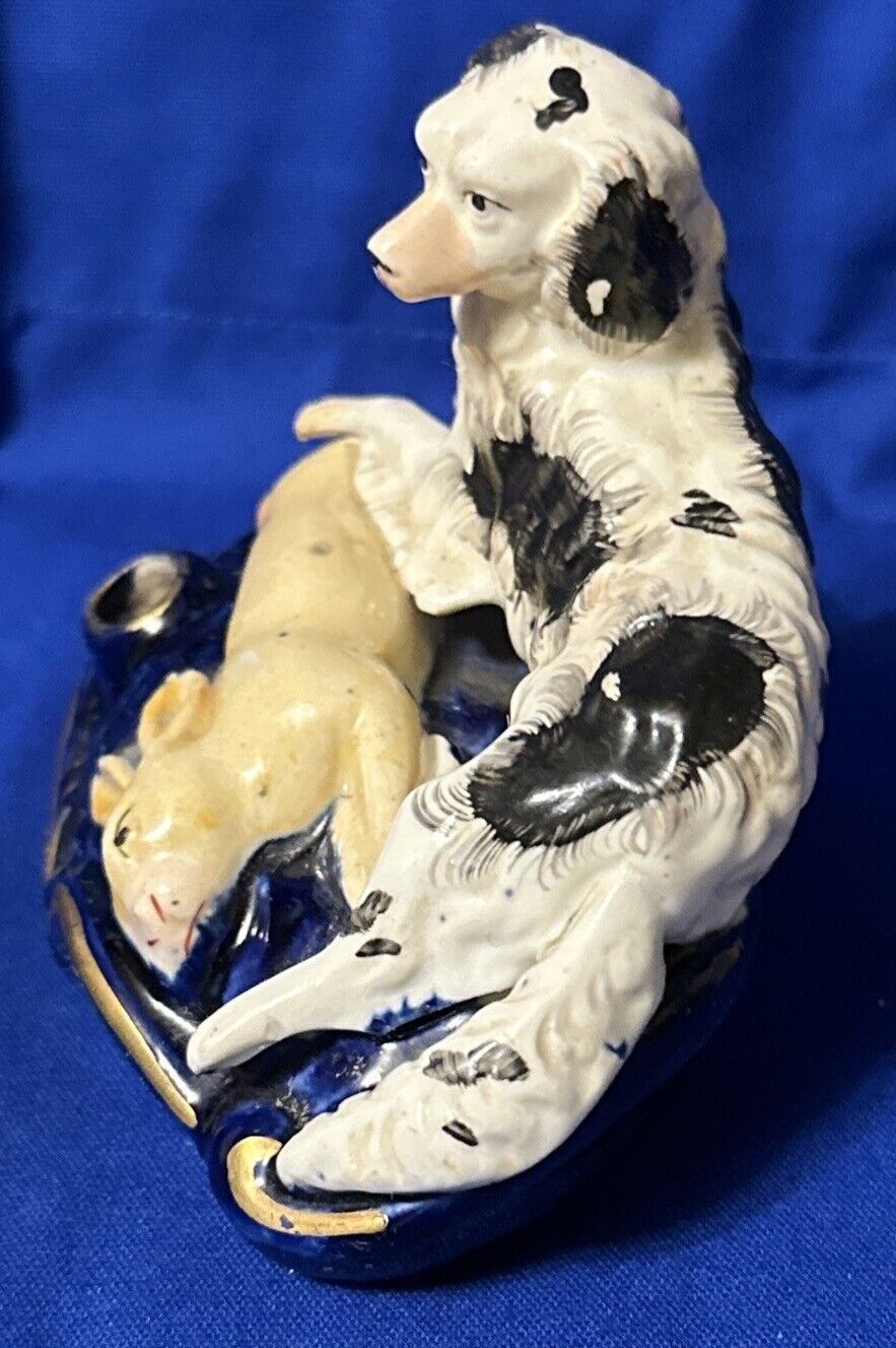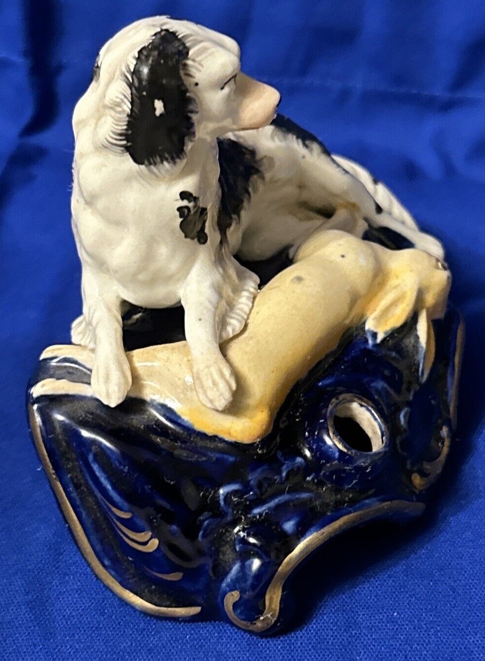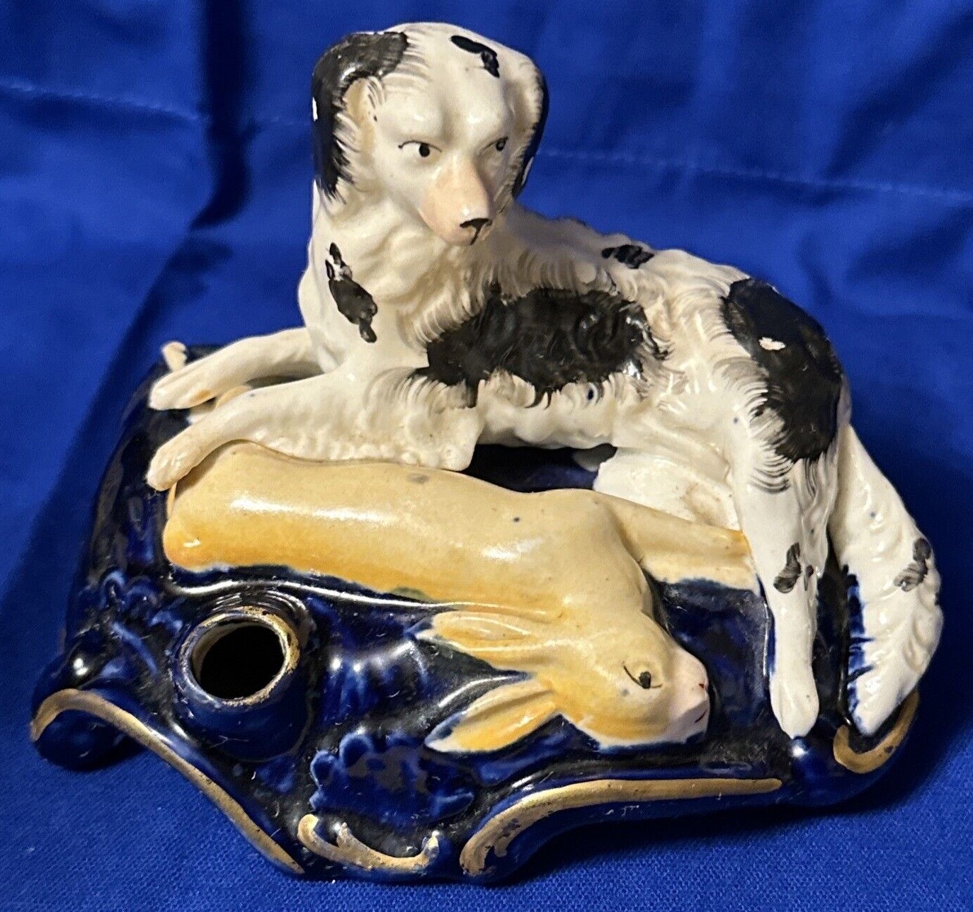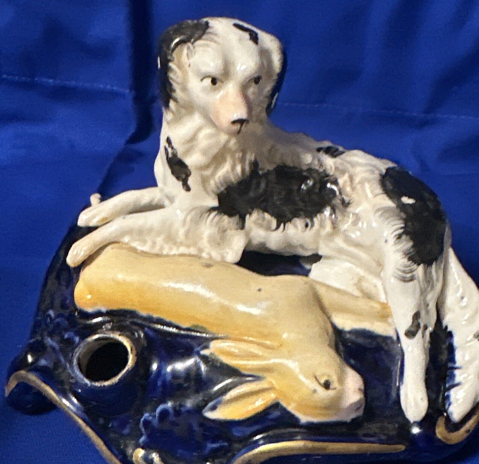 A black and white spaniel dog rests with his capture, a rabbit, at his feet. Spaniels were common in Victorian households. Queen Victoria’s pet, King Charles Spaniel named “Dash”, may have been the inspiration.