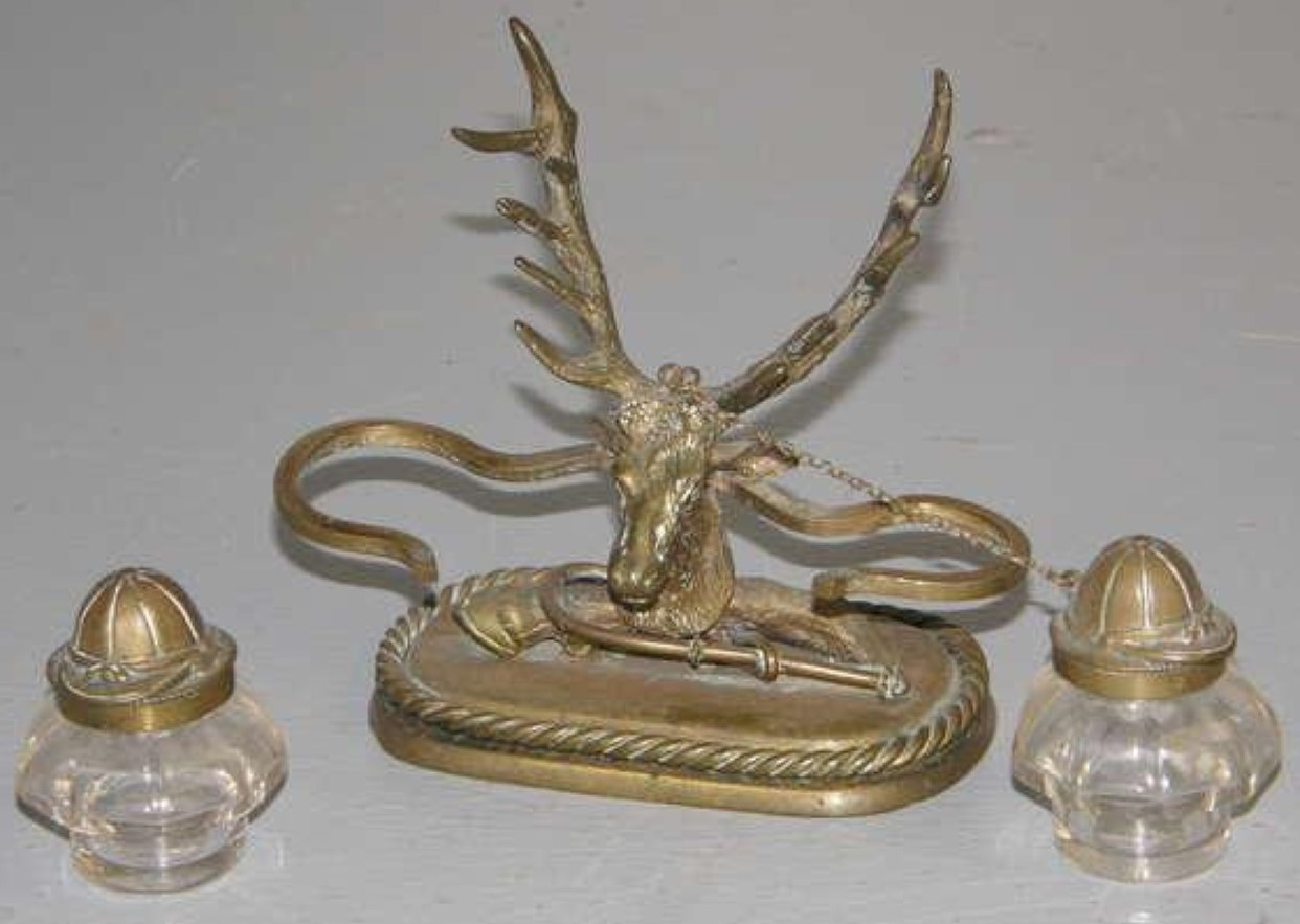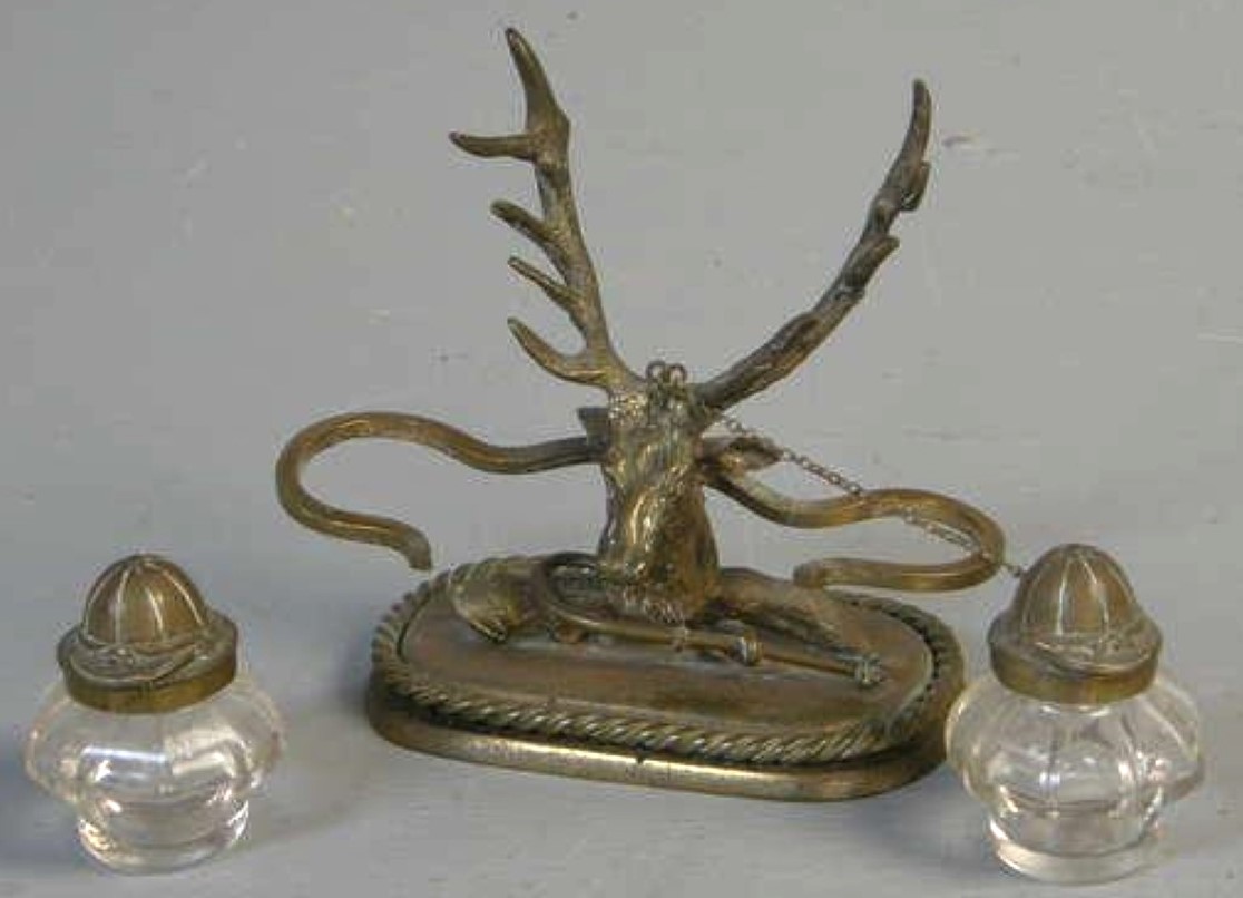 Resting on an oval base with rope twist band decoration is a stag’s head. On each side of the head are two inkwells with removeable lids formed as hunters’ hats.