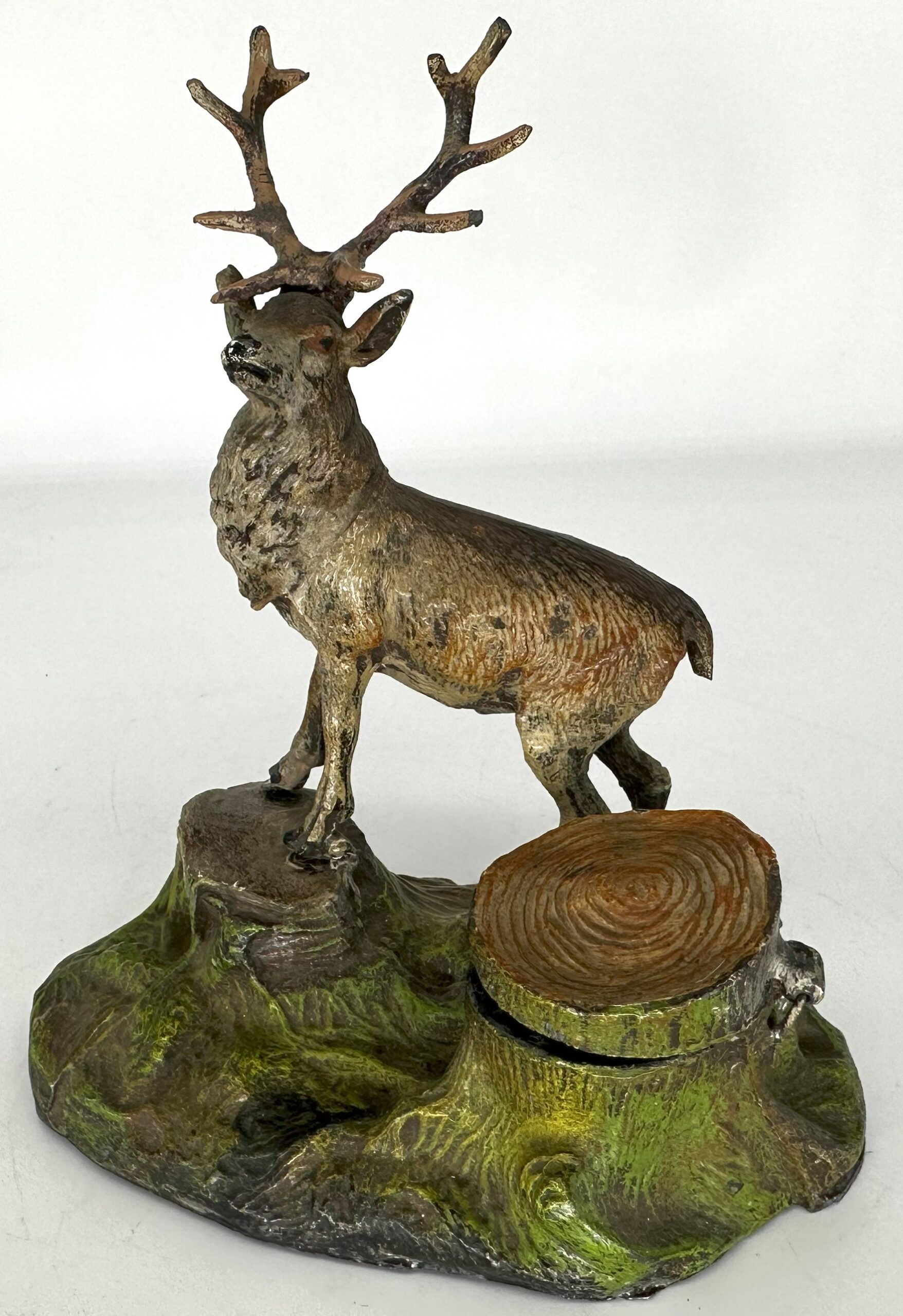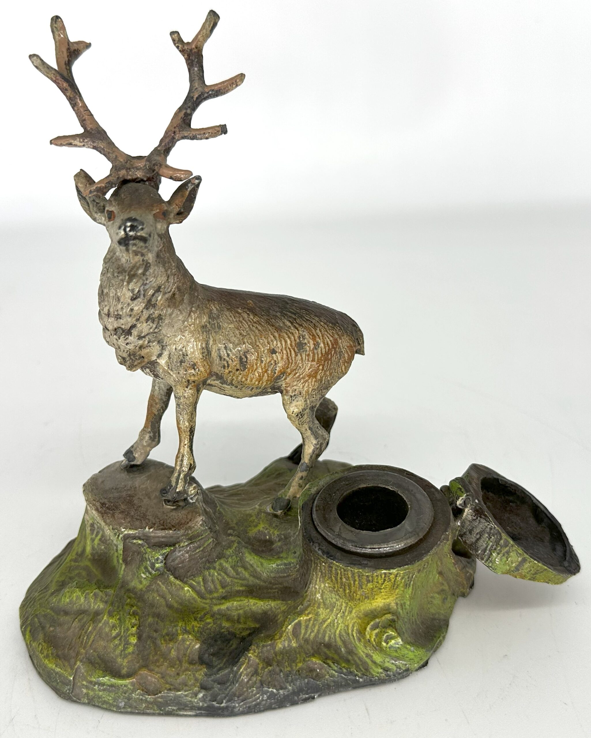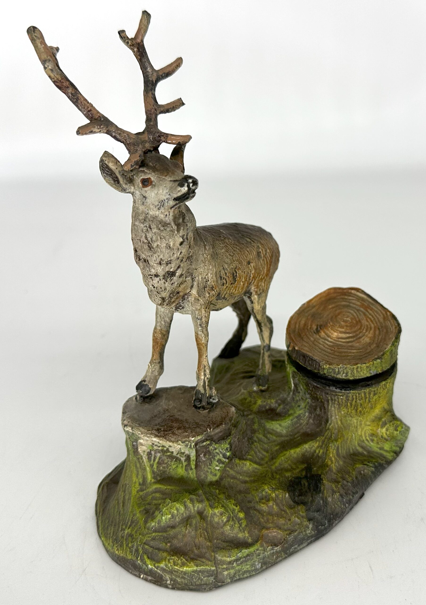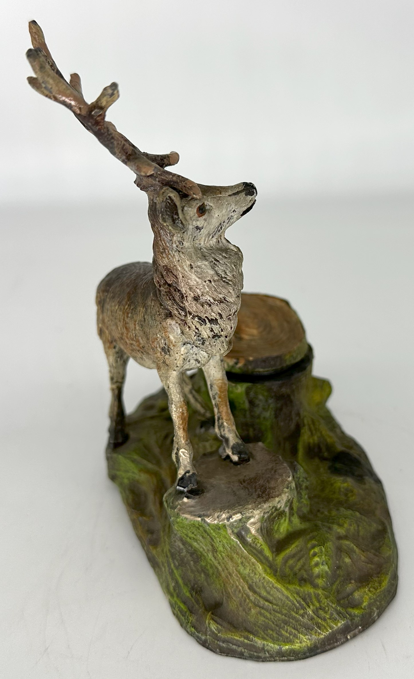 Nicely detailed, cold-painted stag standing on a mount, next to a stump (which is the inkwell).