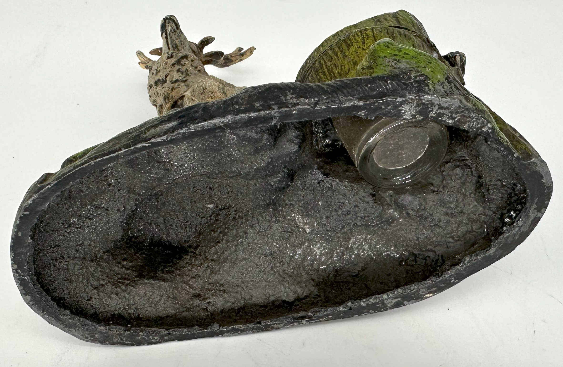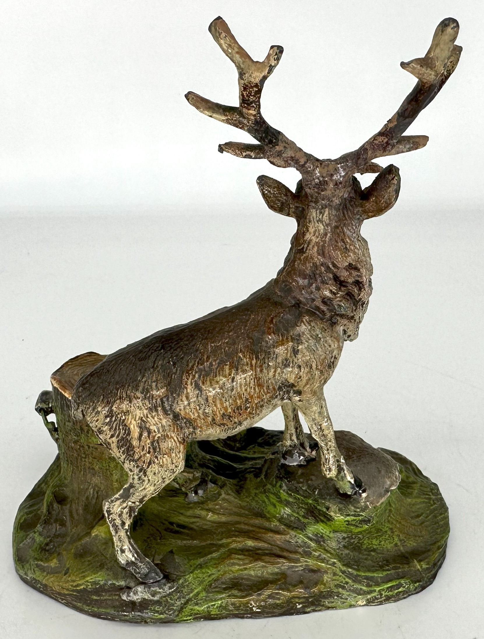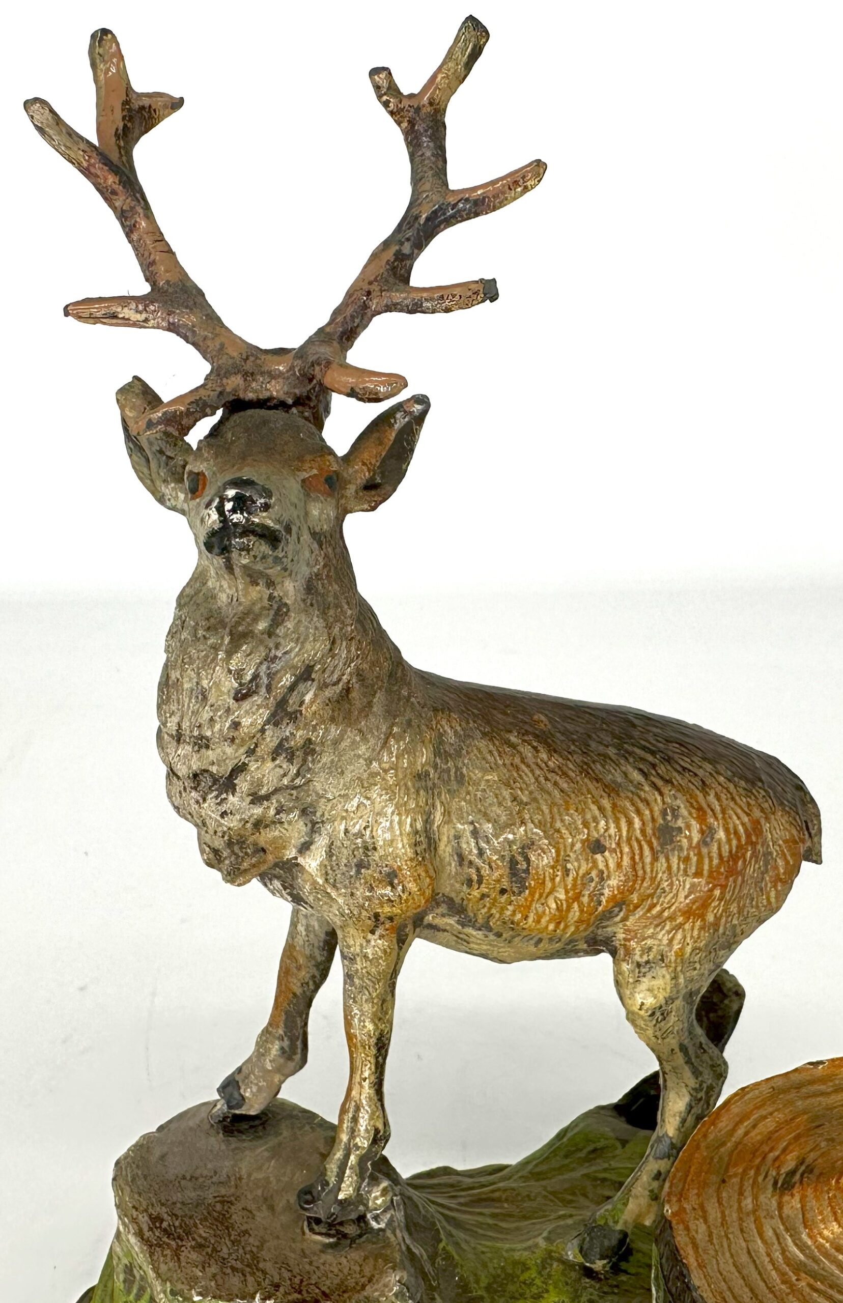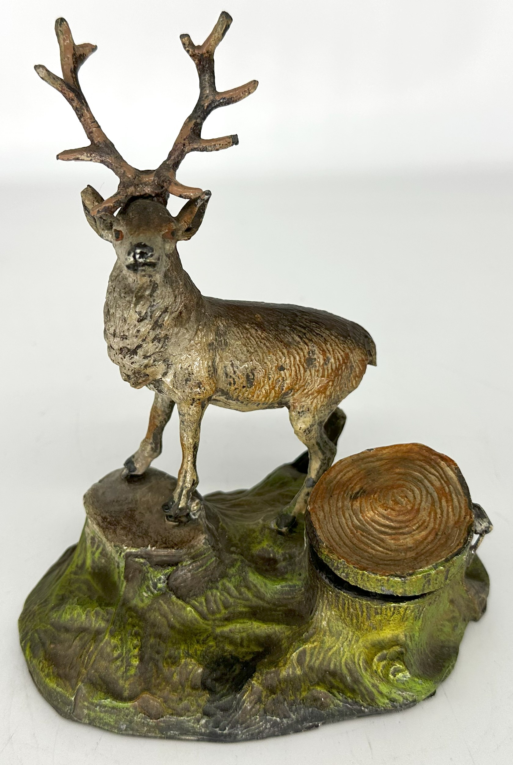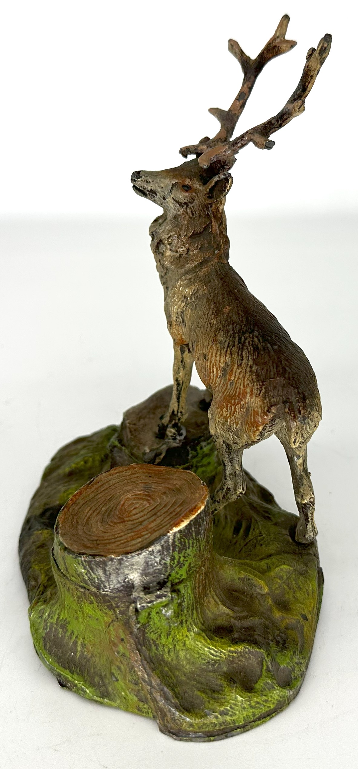 Nicely detailed, cold-painted stag standing on a mount, next to a stump (which is the inkwell).