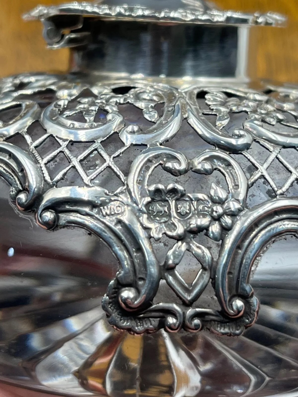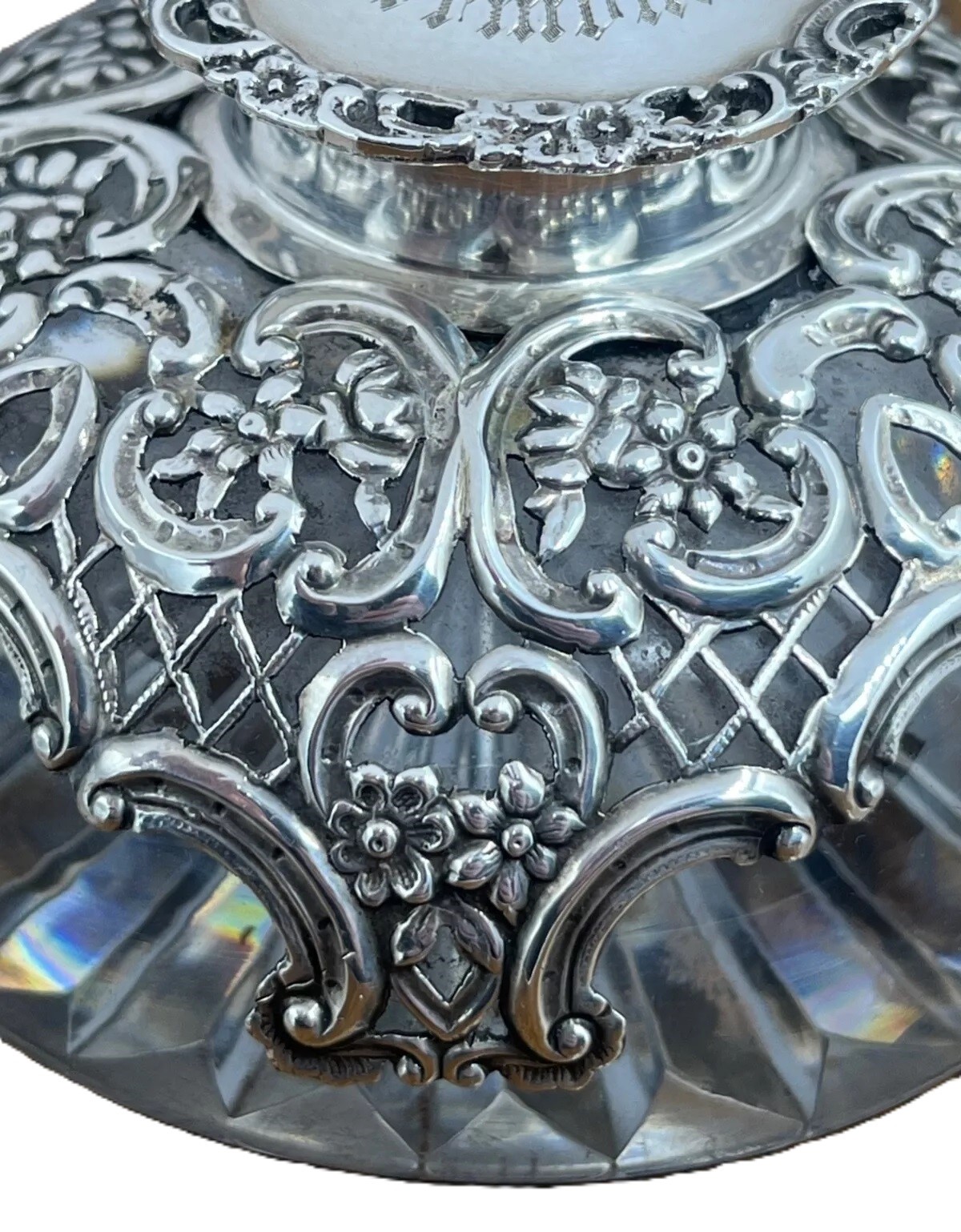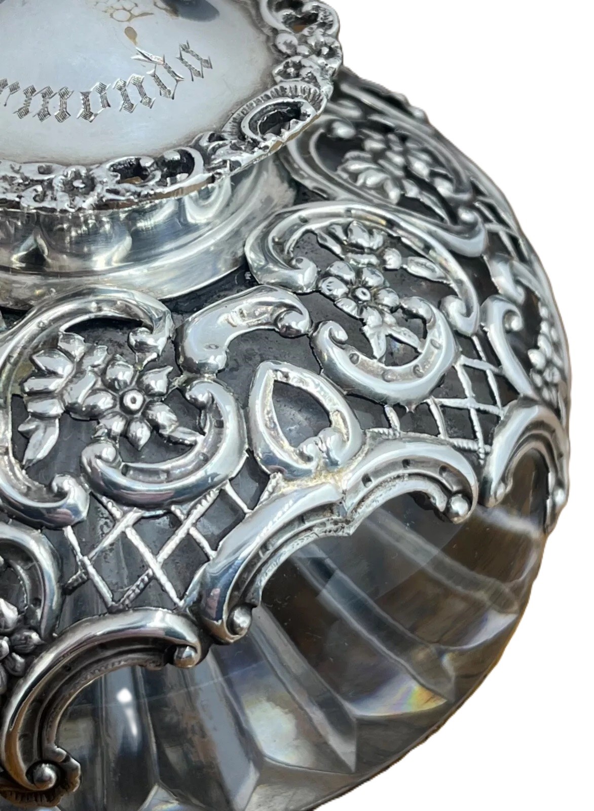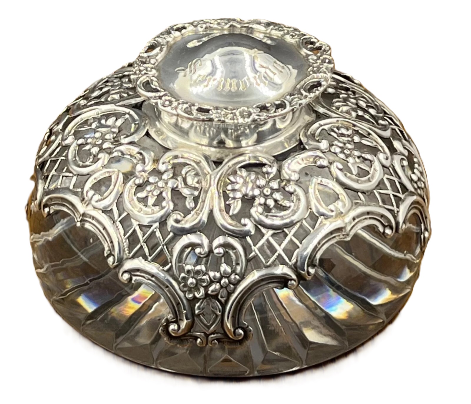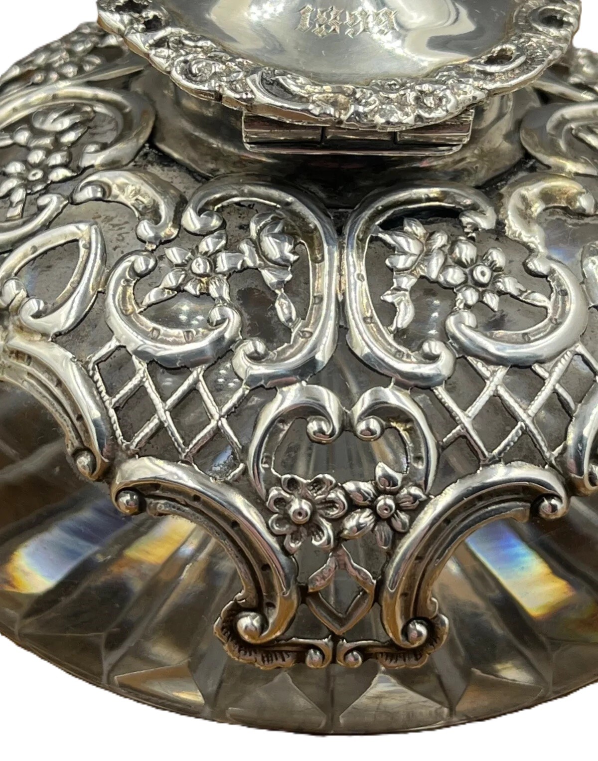 This sterling silver and glass inkwell features a sterling silver lid extending into an elongated collar with intricate scrollwork and floral patterns. The glass base is ribbed, adding a textured elegance to the piece, although much of it is covered by the ornate silver overlay.