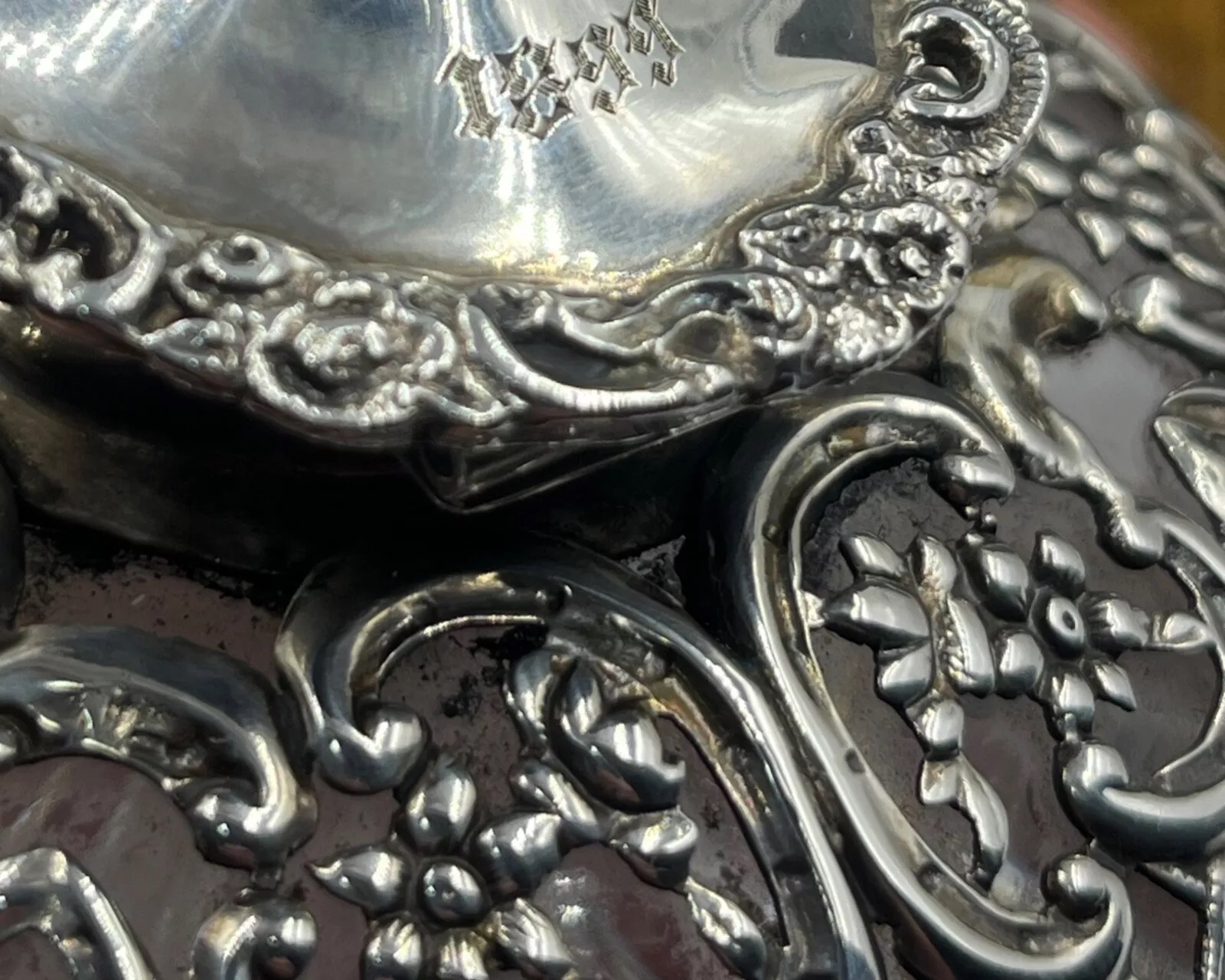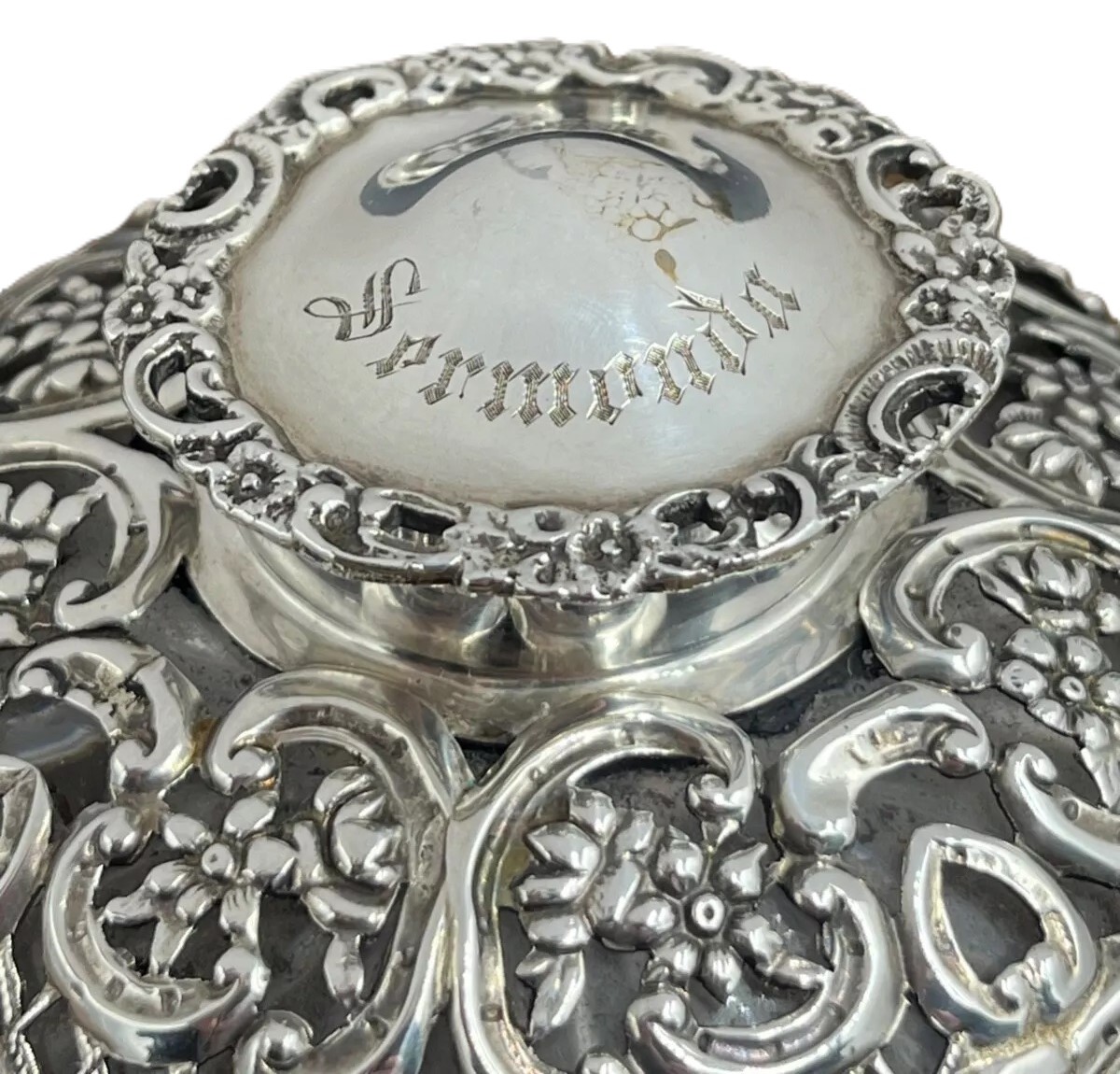 The hallmark indicates that the inkwell was made in London in 1899 by William Comyns, a well-known silversmith celebrated for his high-quality silverware. An inscription of “Sermonda 1899” on the lid suggests that this piece might have been a commemorative item, possibly given as a gift or award.