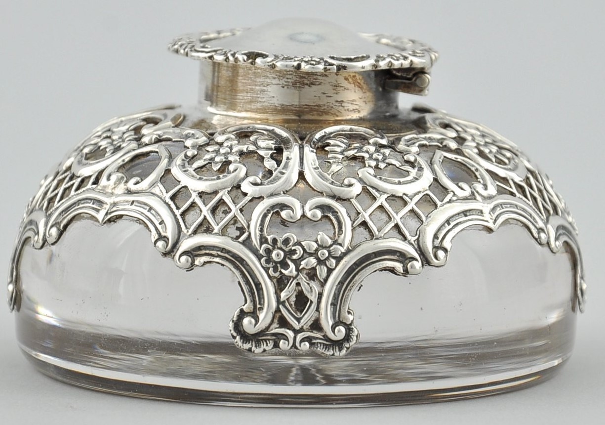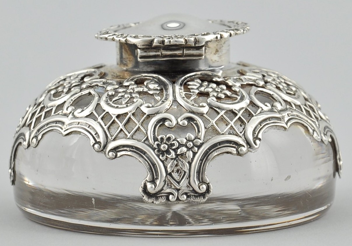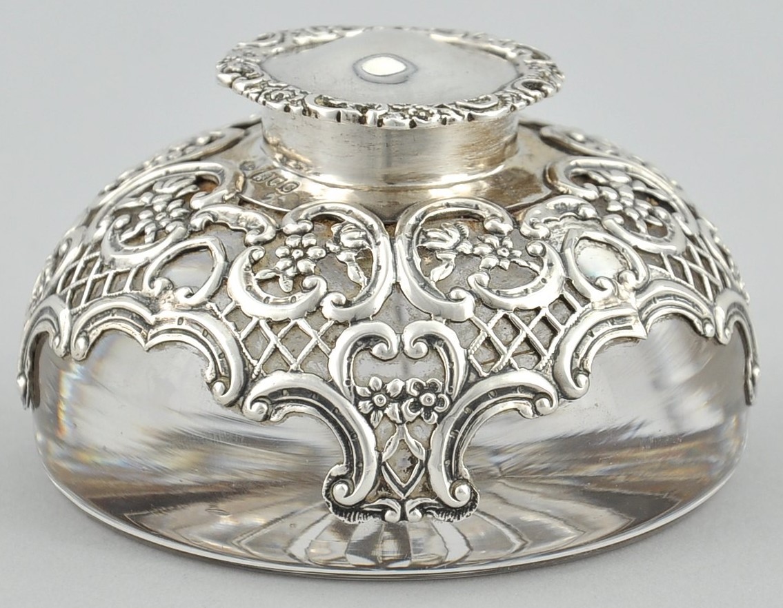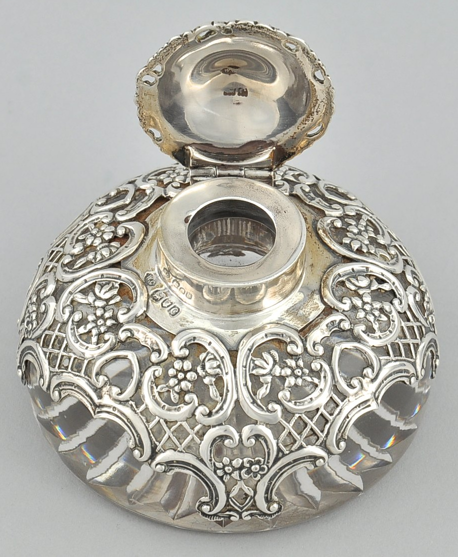 An inkwell with sterling silver reticulated repoussé mounts and a hinged domed lid is decorated with scallops and a floral motif. The crystal base has a deeply cut starburst radiant design. It bears the maker’s mark of William Comyns, London, dated 1898.