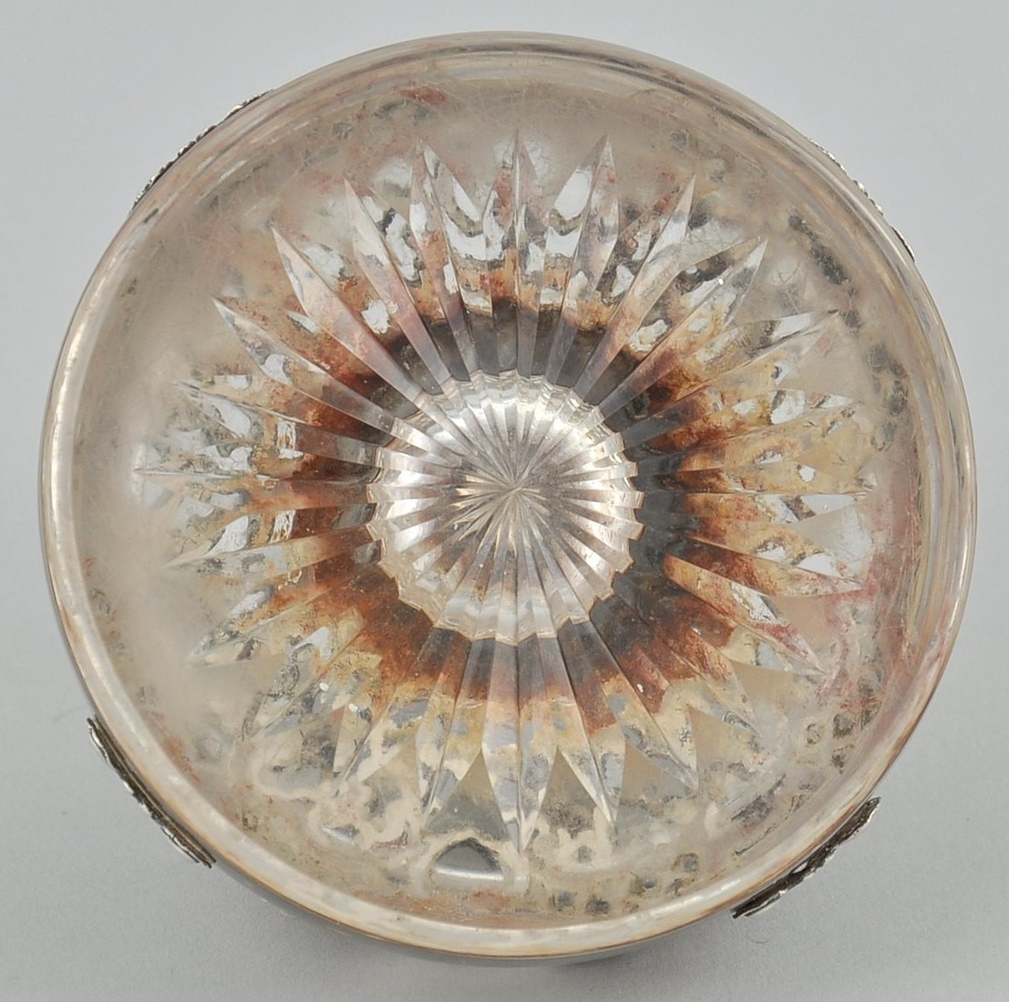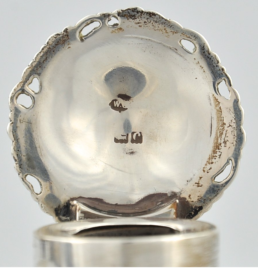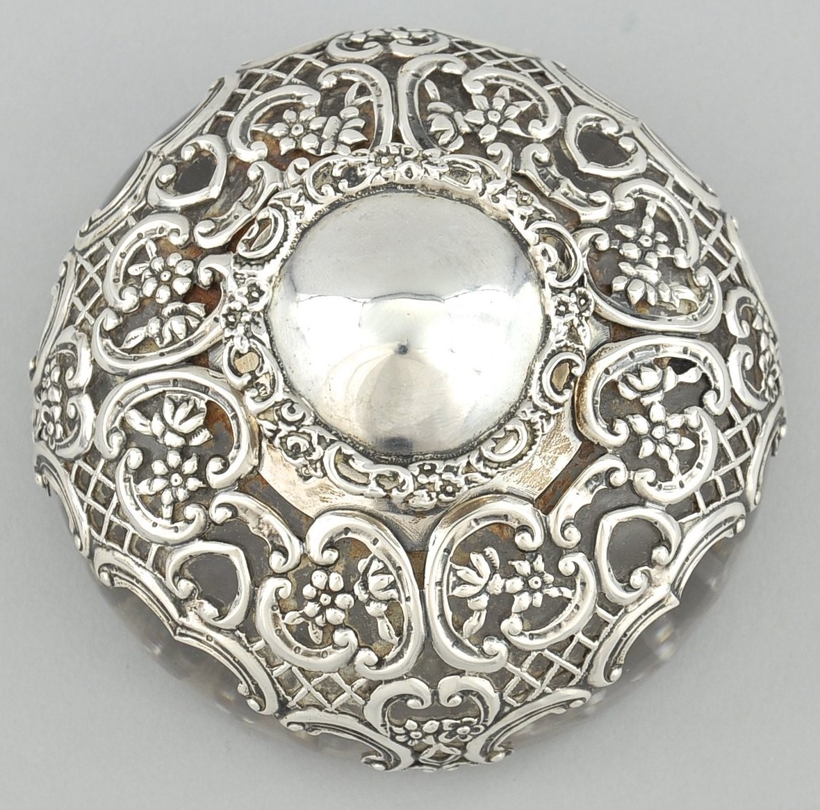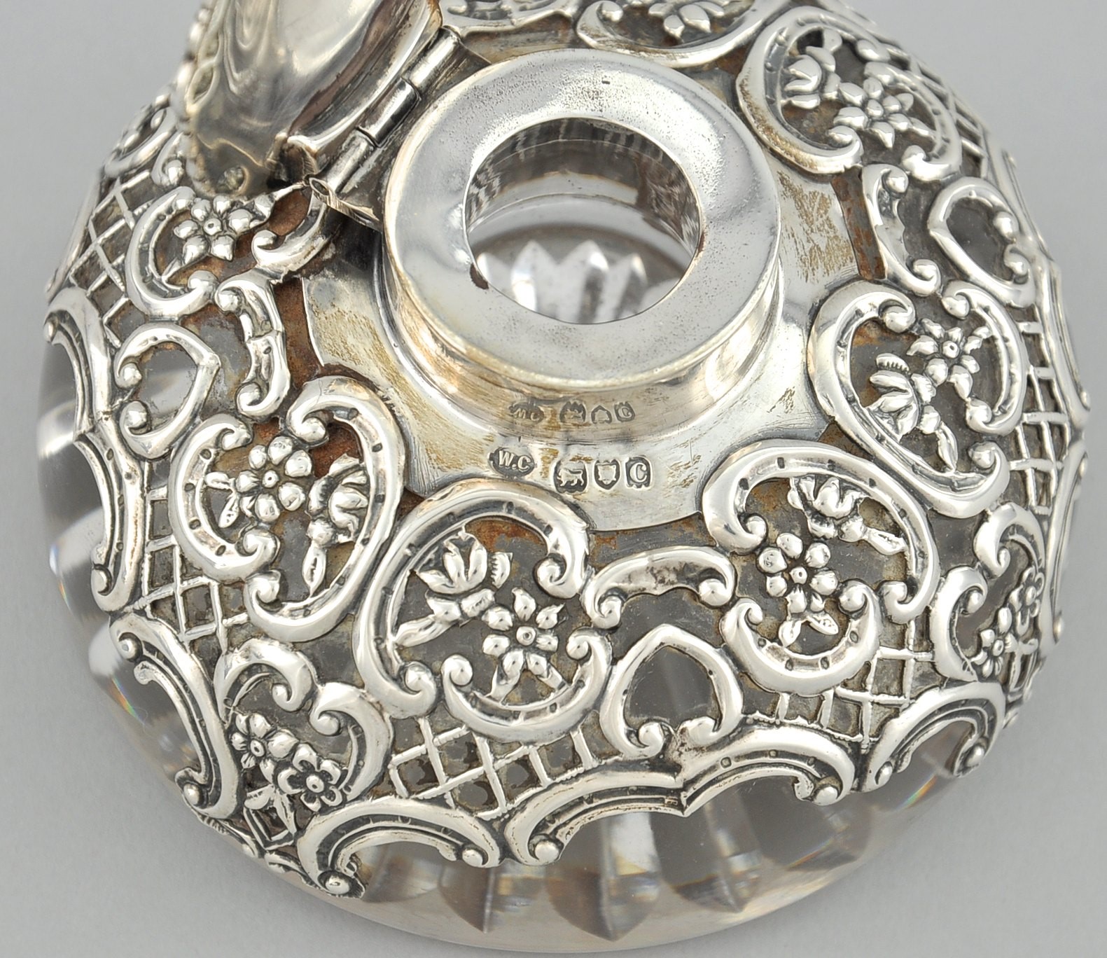 An inkwell with sterling silver reticulated repoussé mounts and a hinged domed lid is decorated with scallops and a floral motif. The crystal base has a deeply cut starburst radiant design. It bears the maker’s mark of William Comyns, London, dated 1898.