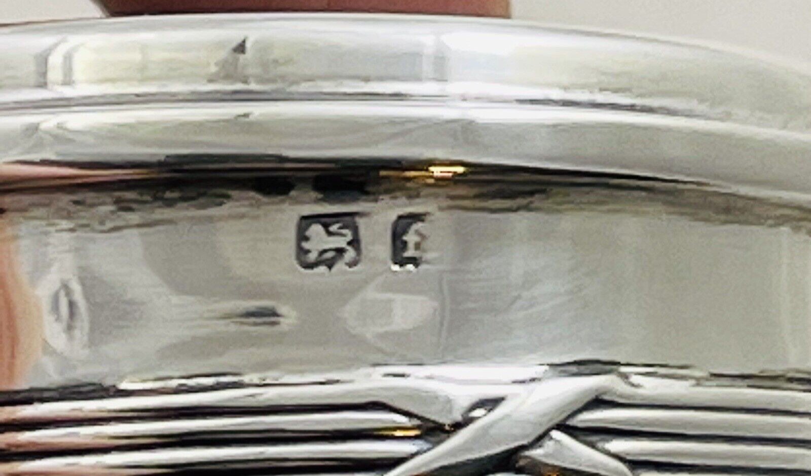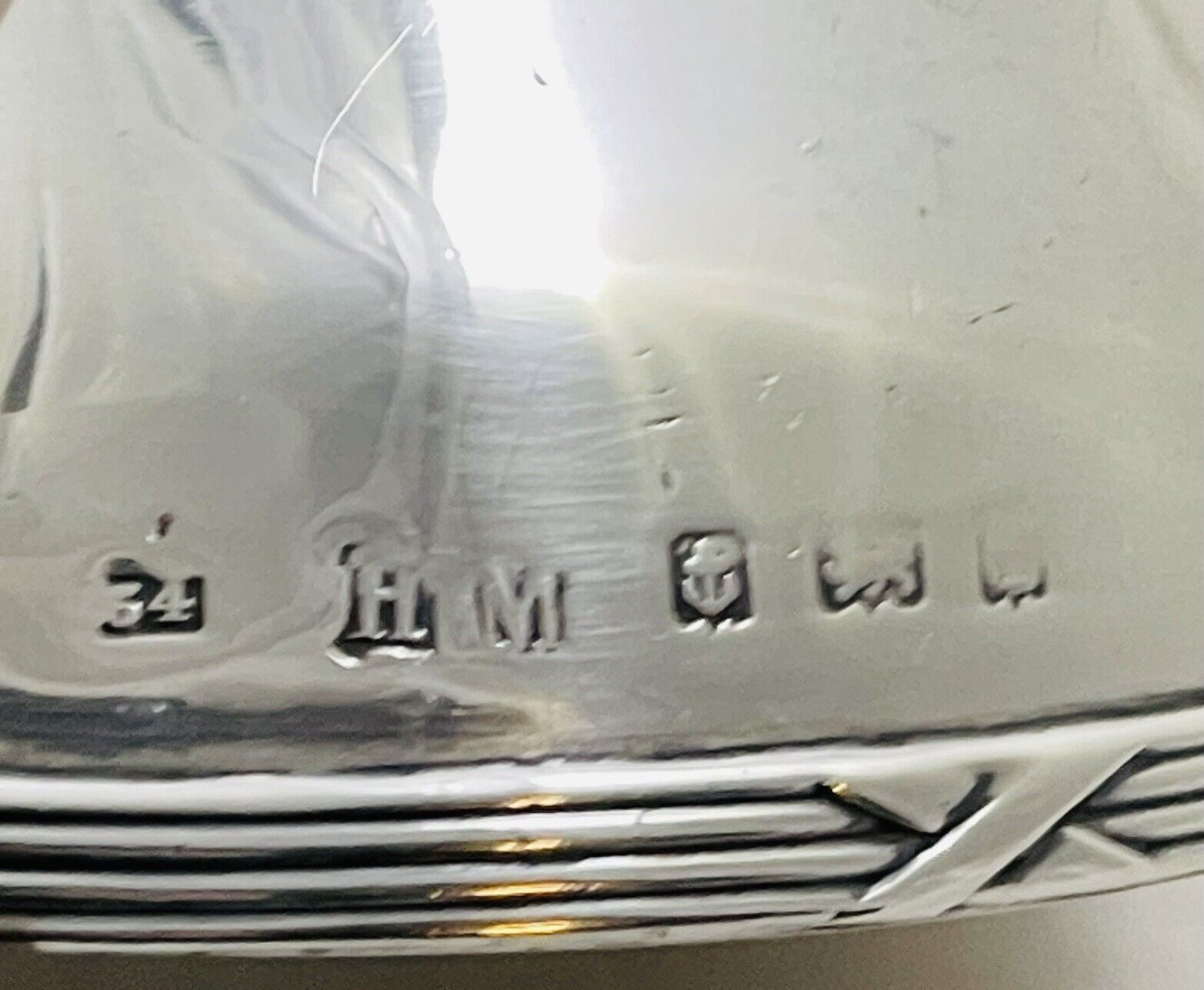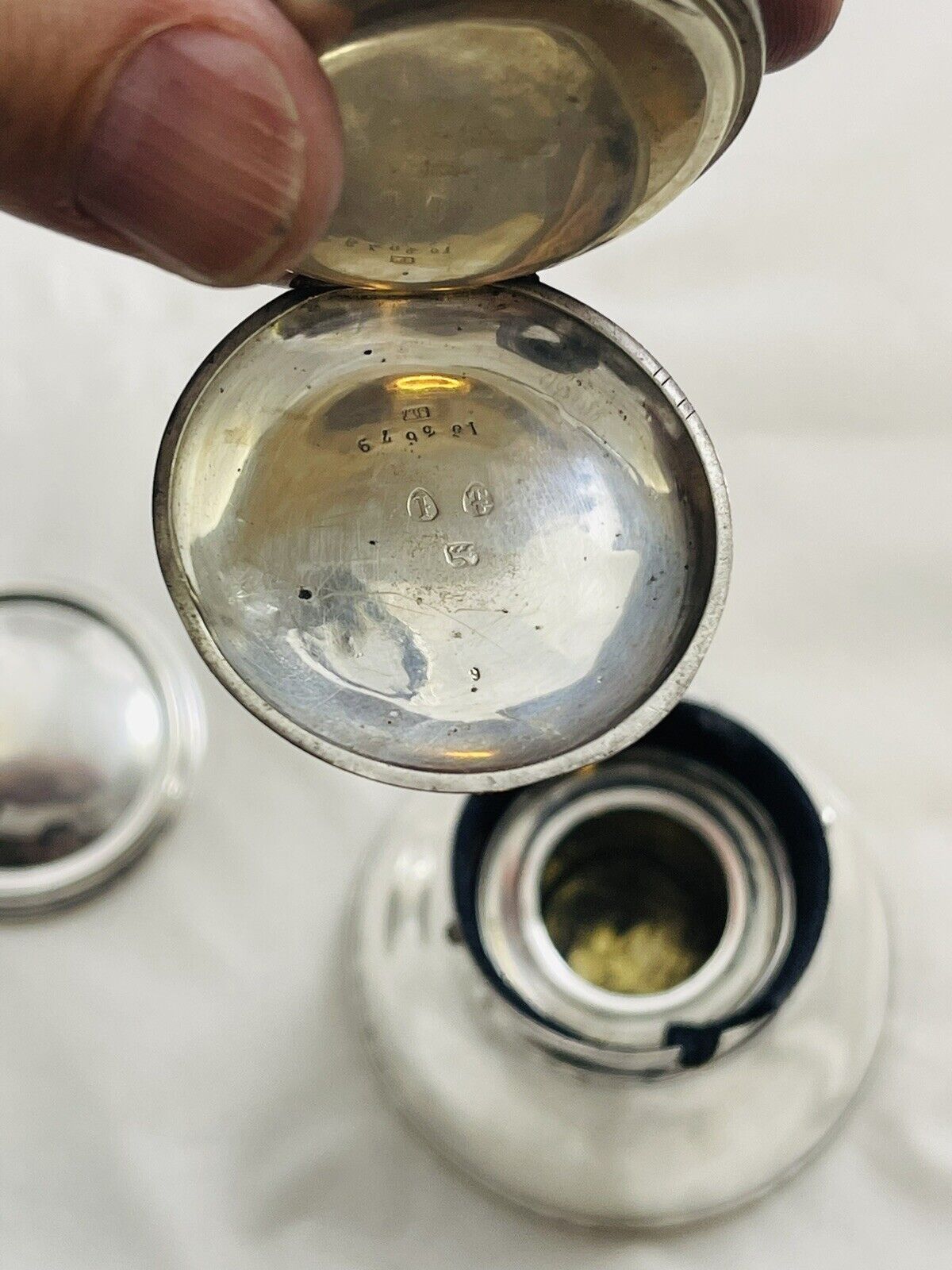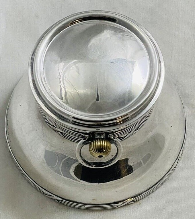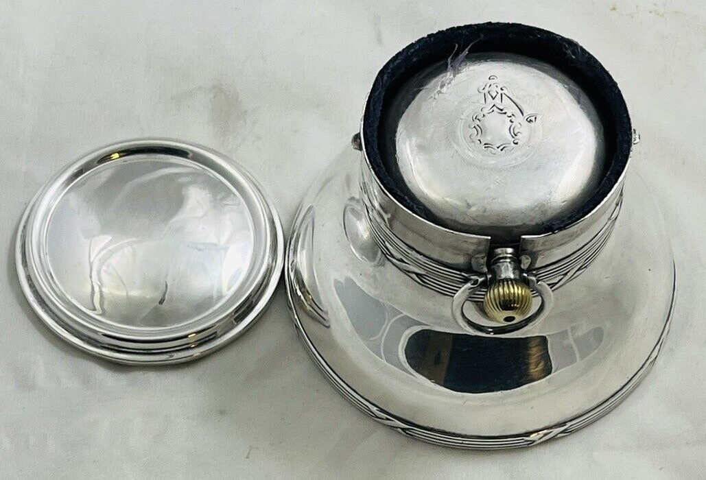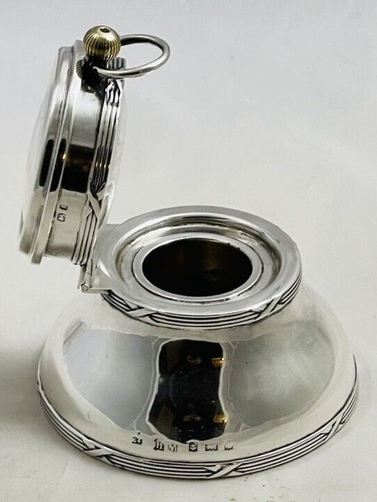 English sterling silver round inkwell with ribbon and reed bands has a working pocket watch as part of the lid. The inkwell and the watch are marked for Birmingham, 1885 and 1905, but different makers.